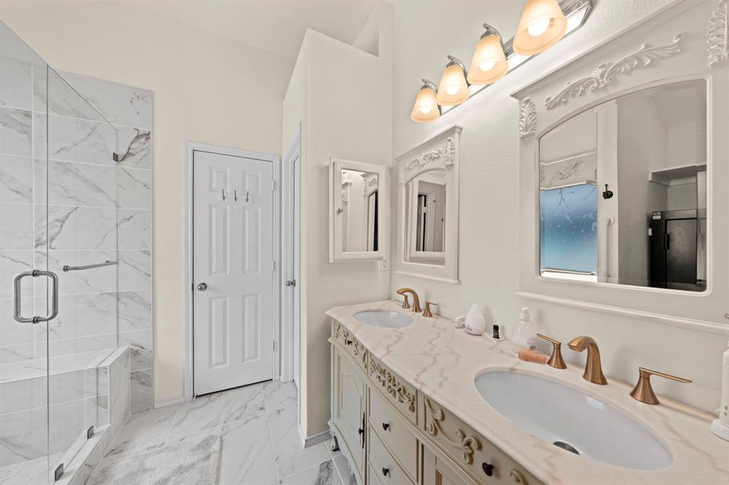 Primary suite includes a large box window seat, an oversized walk-in closet with window, and an updated en-suite bath (2023) featuring a tiled walk-in shower with privacy window, double vanity, newer tile floors, and spacious linen closet.