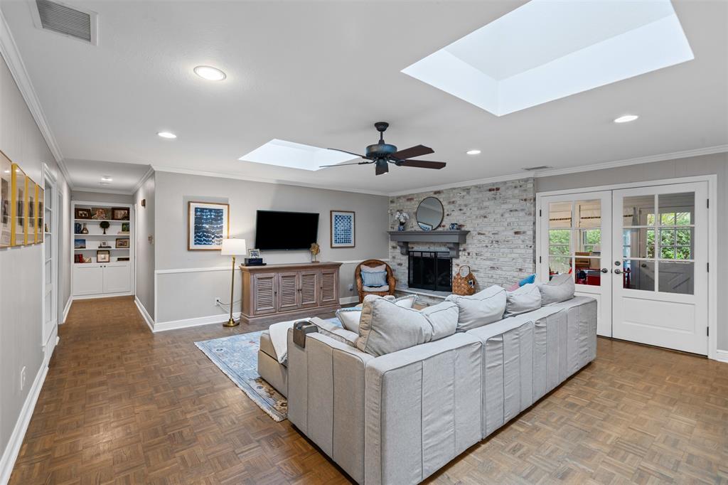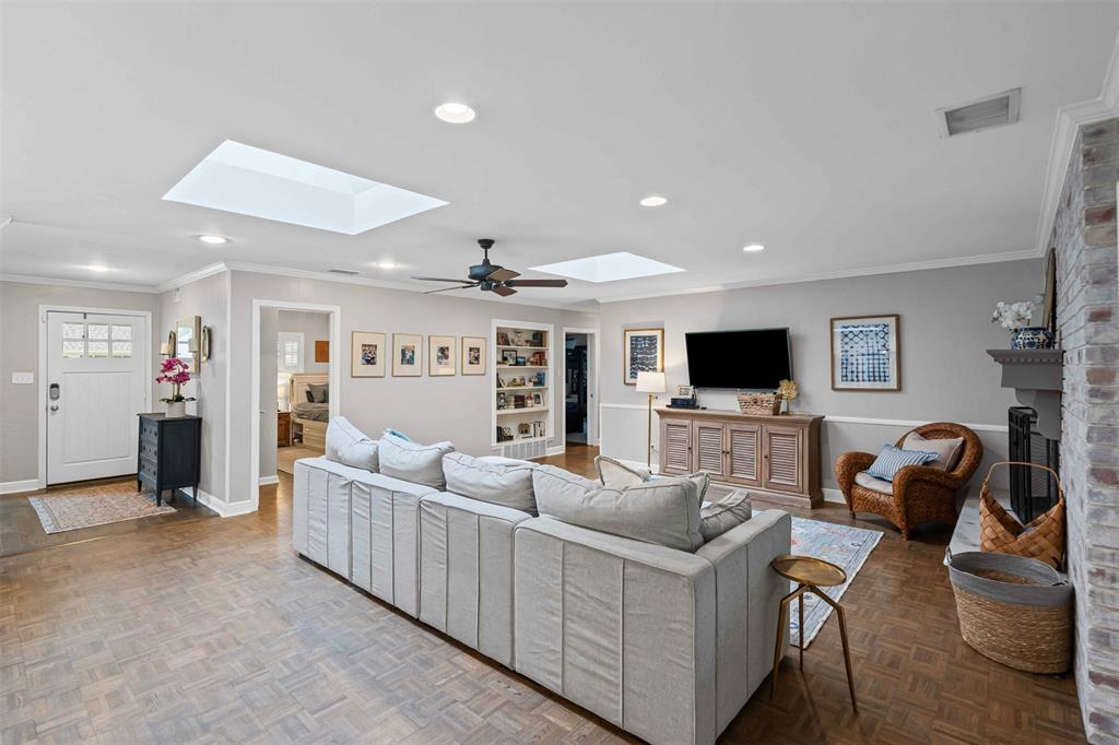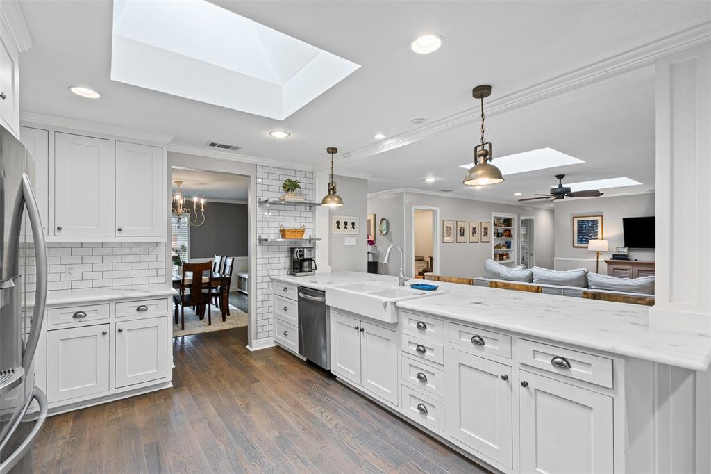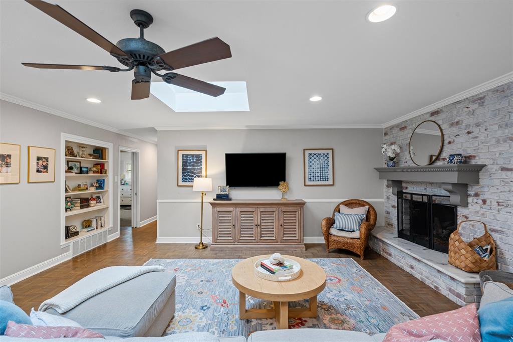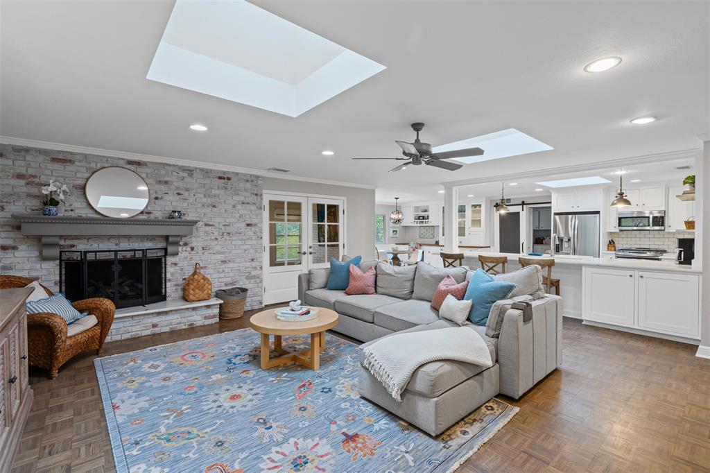 The kitchen opens to the large living room featuring a working fireplace, dual skylights, and recessed lighting—creating a warm, welcoming atmosphere. With both a formal dining room and a breakfast area just off the kitchen, you’ll have plenty of space to host family and friends.