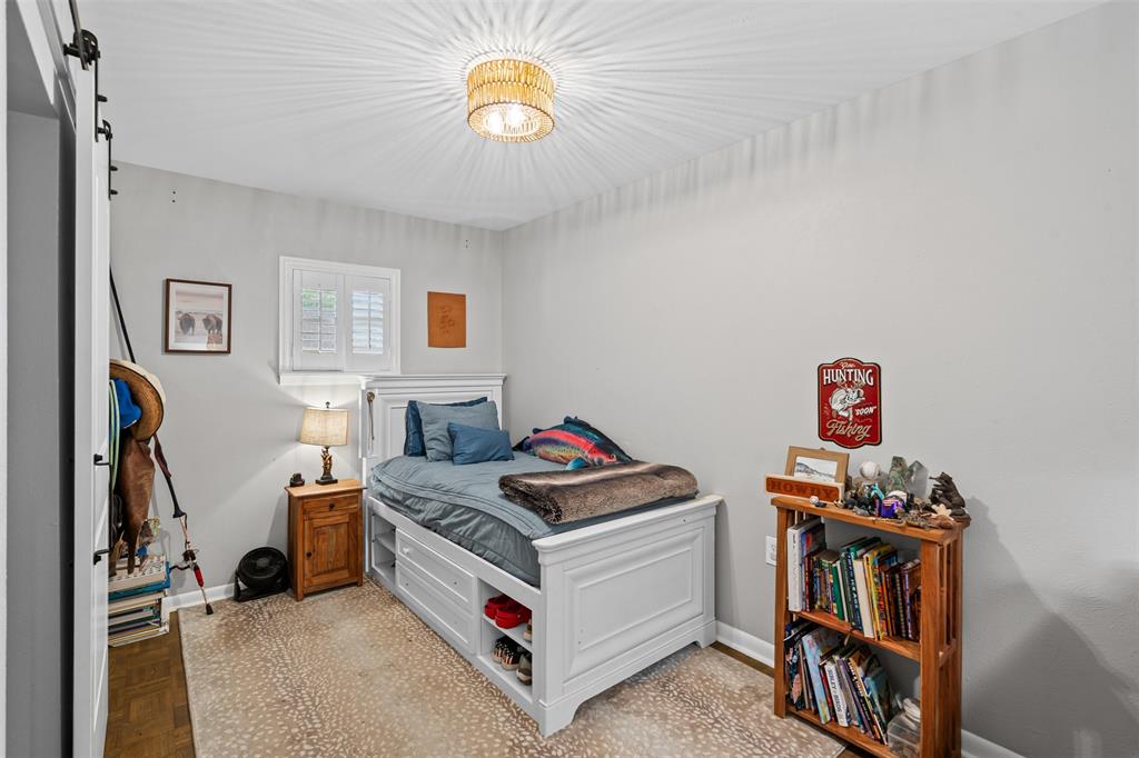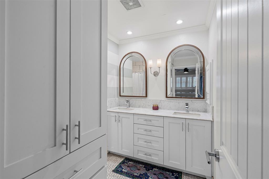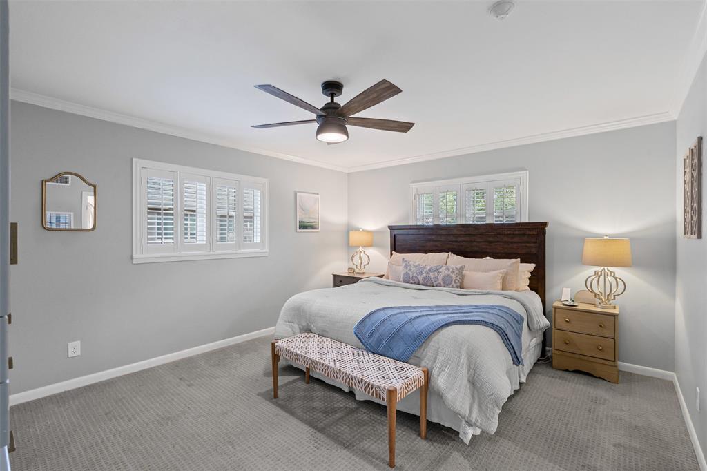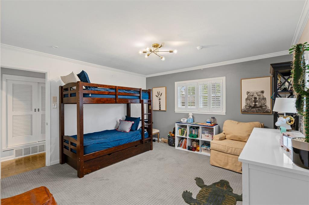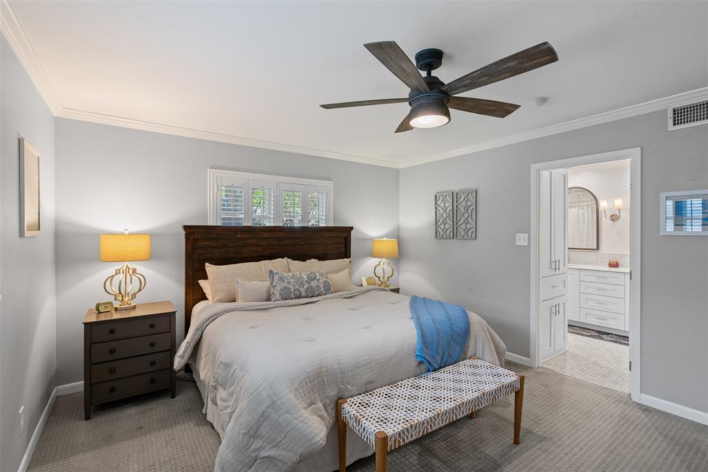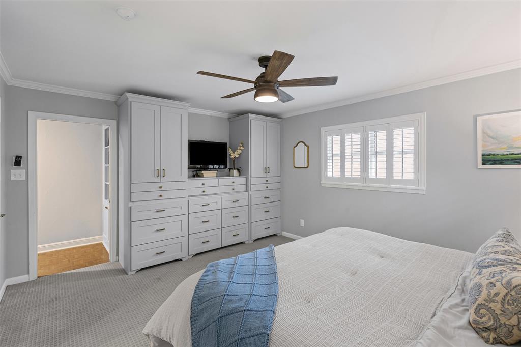 The spacious primary bedroom offers a peaceful retreat with its ensuite bath, custom built-in dresser, and walk-in closet—designed for both comfort and convenience.