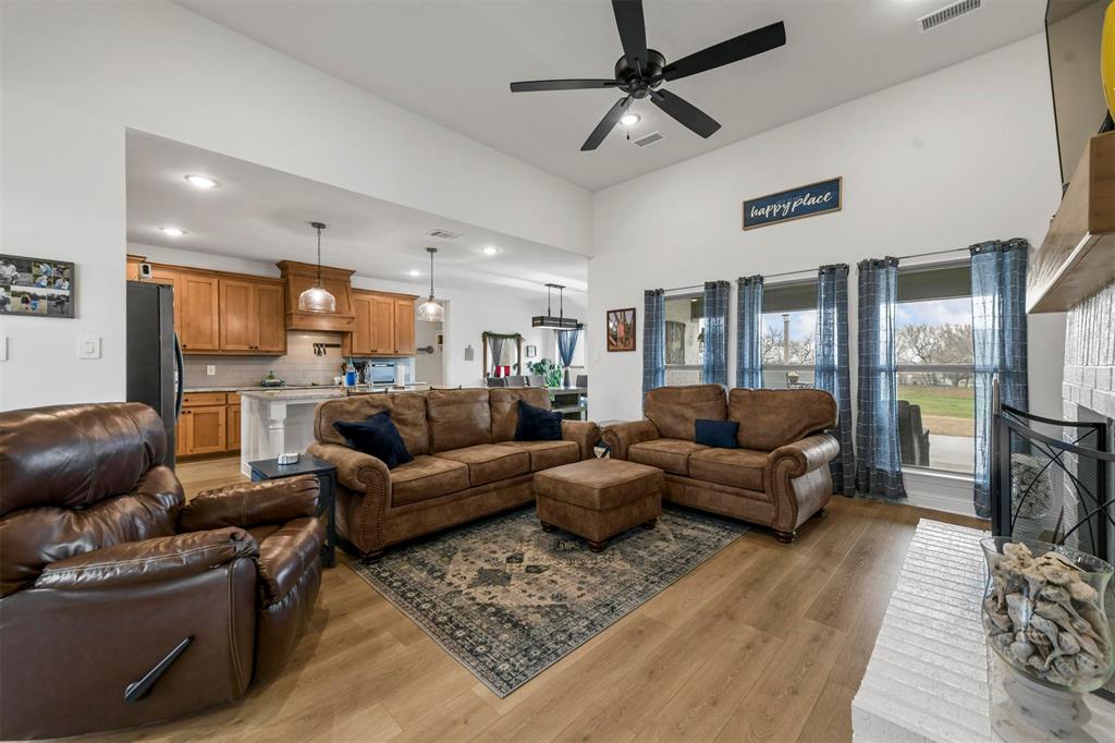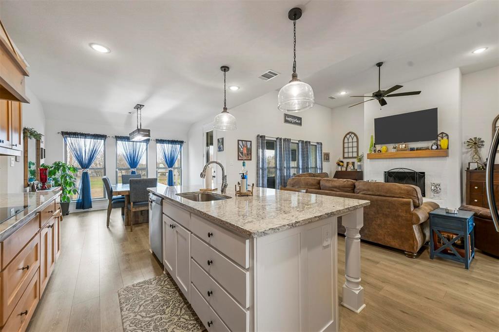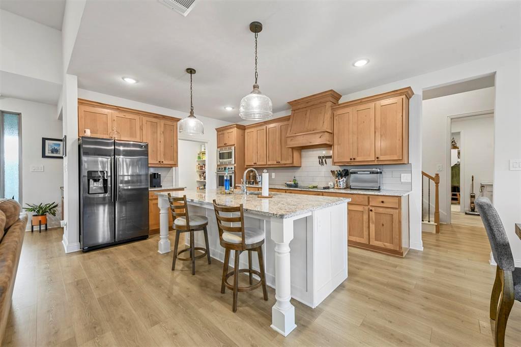 The kitchen includes a walk-in pantry with plenty of natural lighting, double oven, abundant cabinetry, and a large island perfect for cooking and entertaining. The open living areas are spacious with tall ceilings and large windows overlooking the covered patio area and large backyard ideal for entertaining, playtime, or simply enjoying the outdoors. Trees border the back of the property and deer will sometimes sneak in quietly.