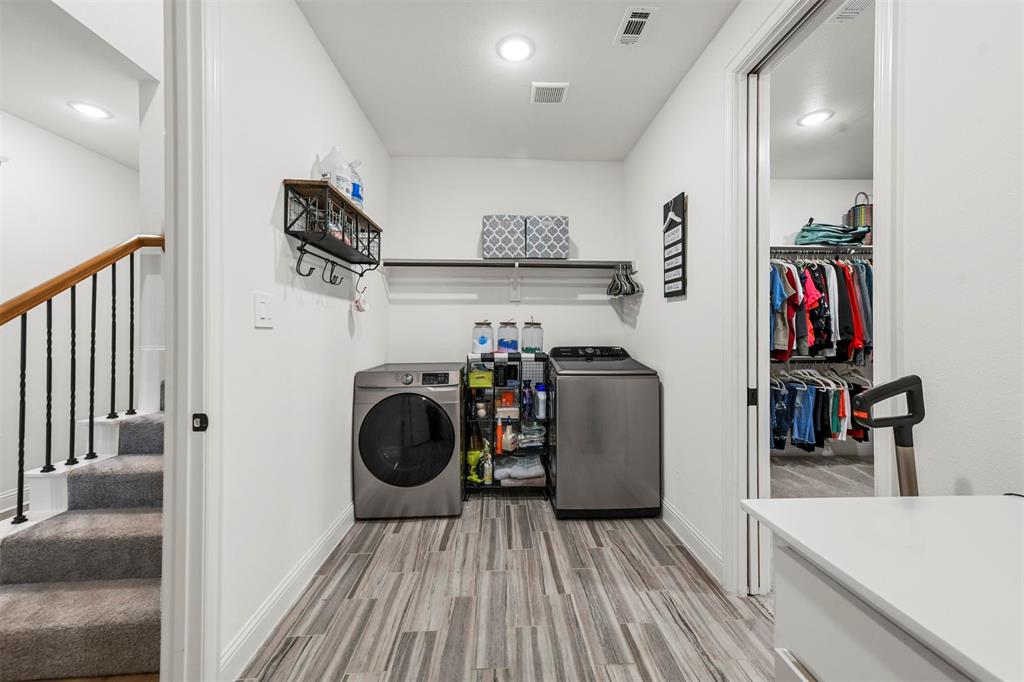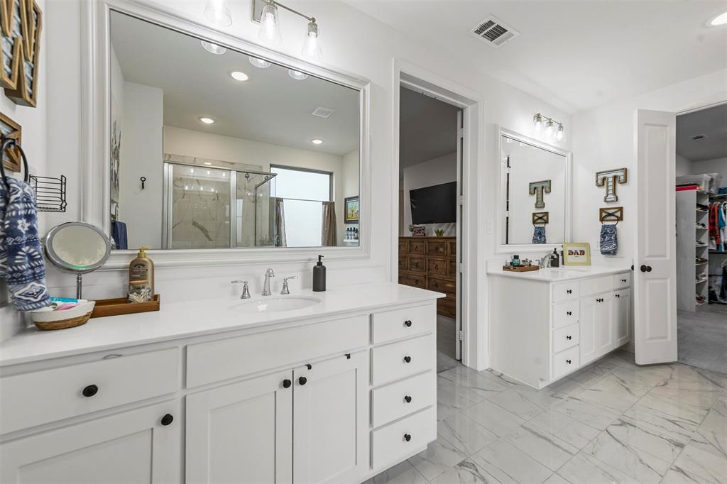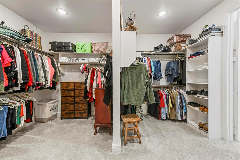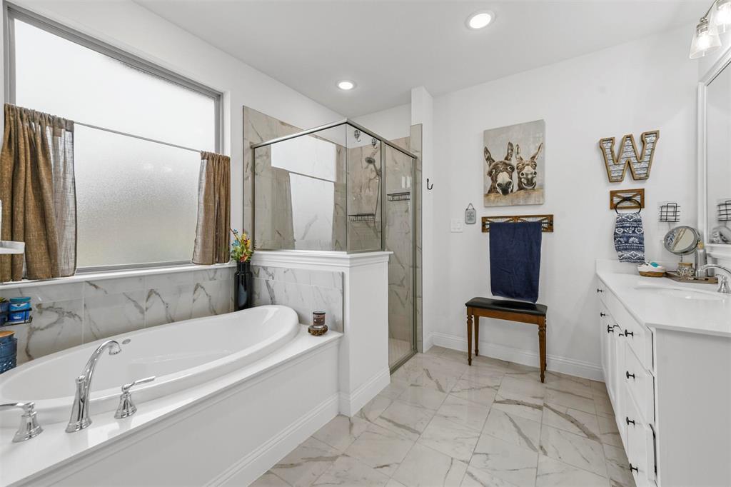 Primary bedroom includes large walk-in shower, separate tub, and huge walk-through closet with access to an oversized laundry room with space for additional storage or freezer. There’s also a mud area tucked in close to the garage entrance with easy access to the laundry room making daily routines seamless and keeping clutter contained.