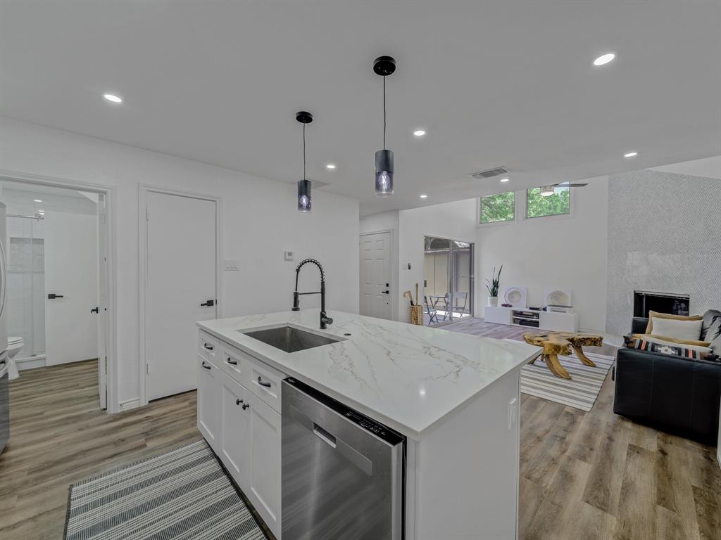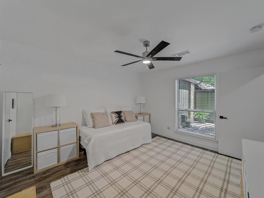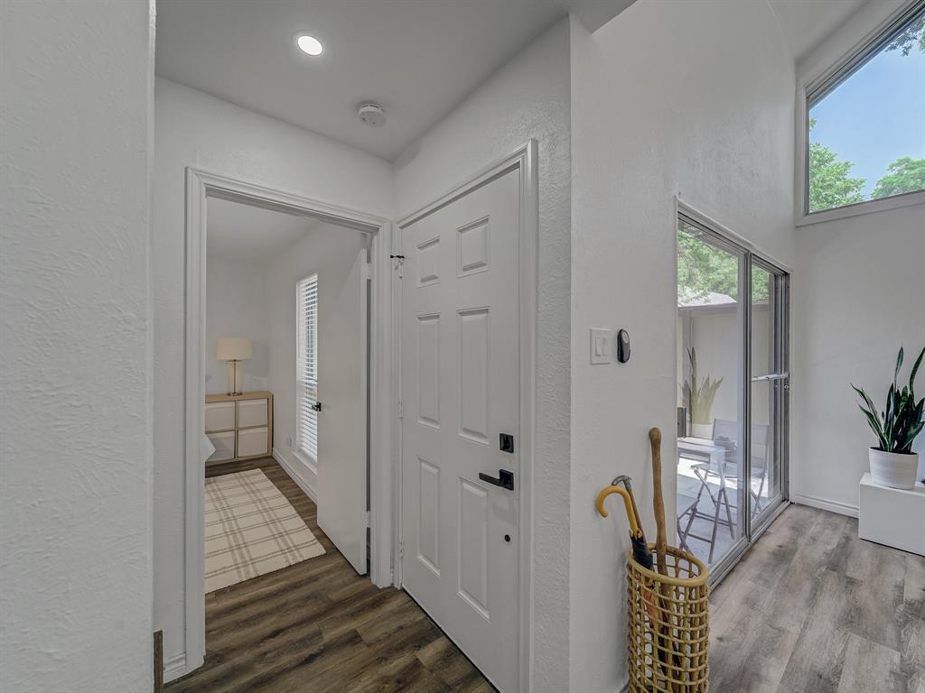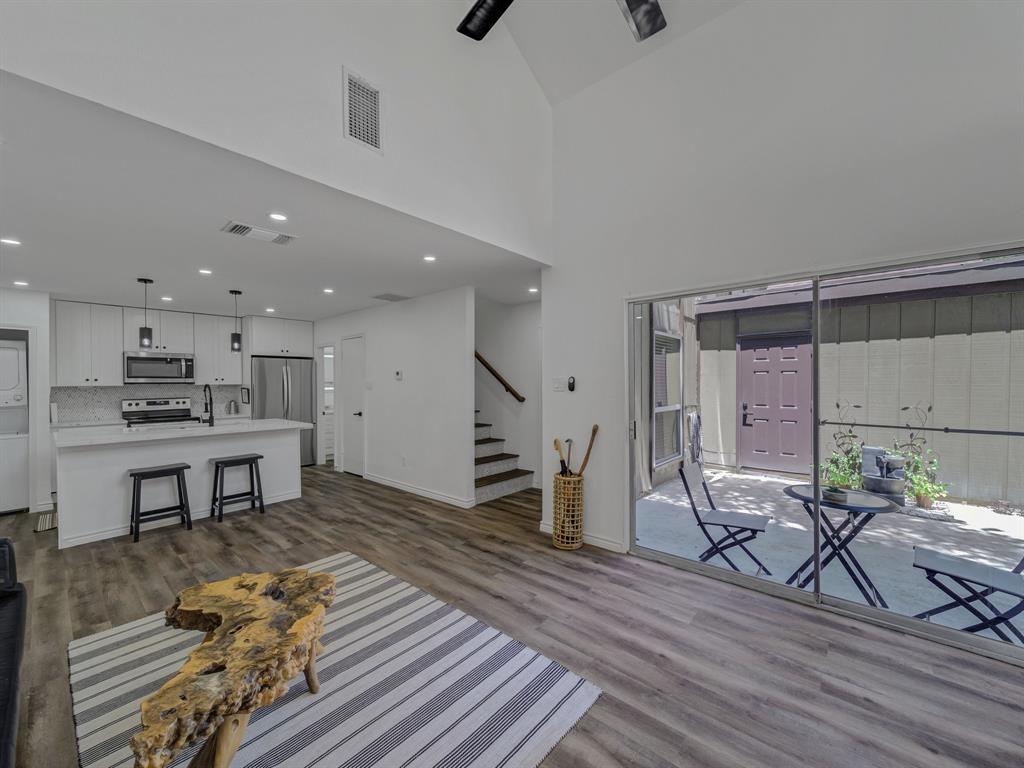 Welcome to a community of nearly 20 tranquil wooded acres nestled alongside a quiet creek. A private fenced and gated courtyard patio leads you into this invitingly open and spacious modern residence with plenty of natural light and vaulted cathedral ceilings. Step into luxury, as a full interior renovation was completed in 2024 including a reconfigured kitchen with island, quartz counters, built-in cabinets, SS appliances, built-in microwave, new flooring and stairs, fireplace surround, ceiling fans, lighting, replacement windows, HVAC, and full-size stackable laundry closet. The flexible floorplan allows you to use either bedroom as primary with the other being a secondary bedroom, office, second living area, craft room, play room, whatever you desire. Storage space is abundant, as both bedrooms have walk-in closets and there is additional storage under the stairs plus a storage room off the patio. This peaceful retreat surrounded by nature will make you feel like you're living outside the city limits yet with convenient access to Loop 12, US Hwy 67, and I-20. Check out the 3D tour link under Virtual Tours!