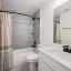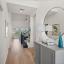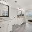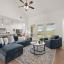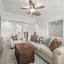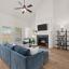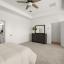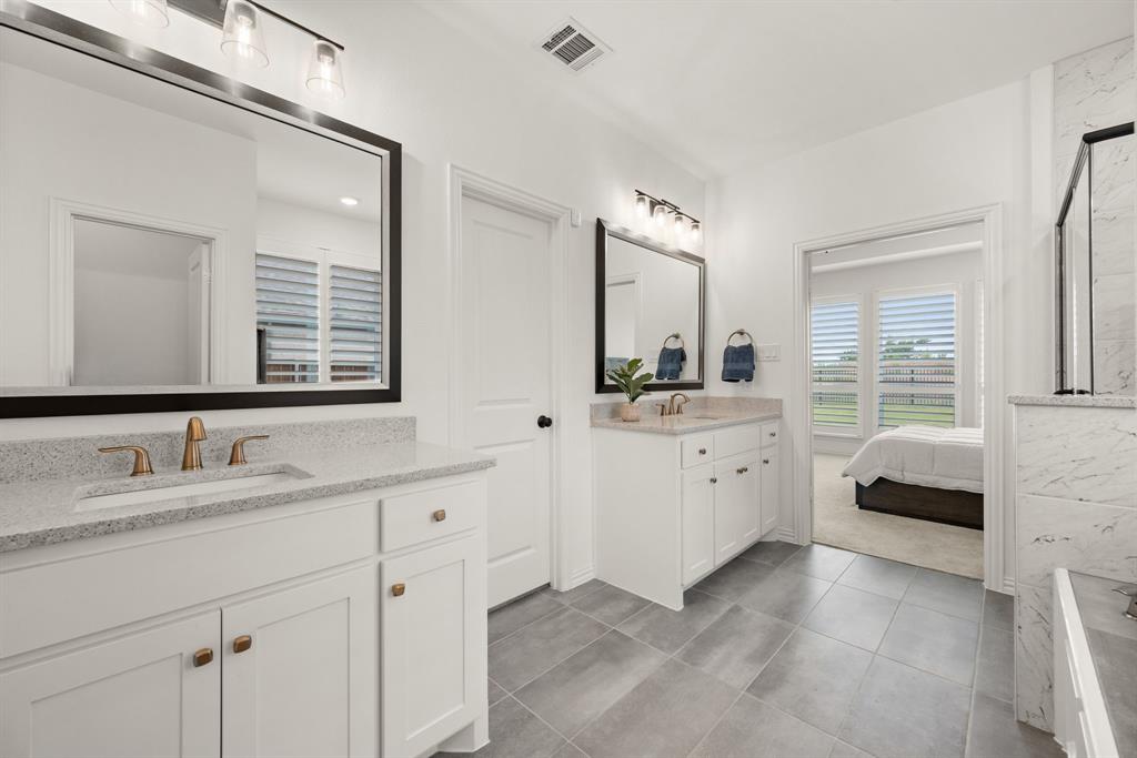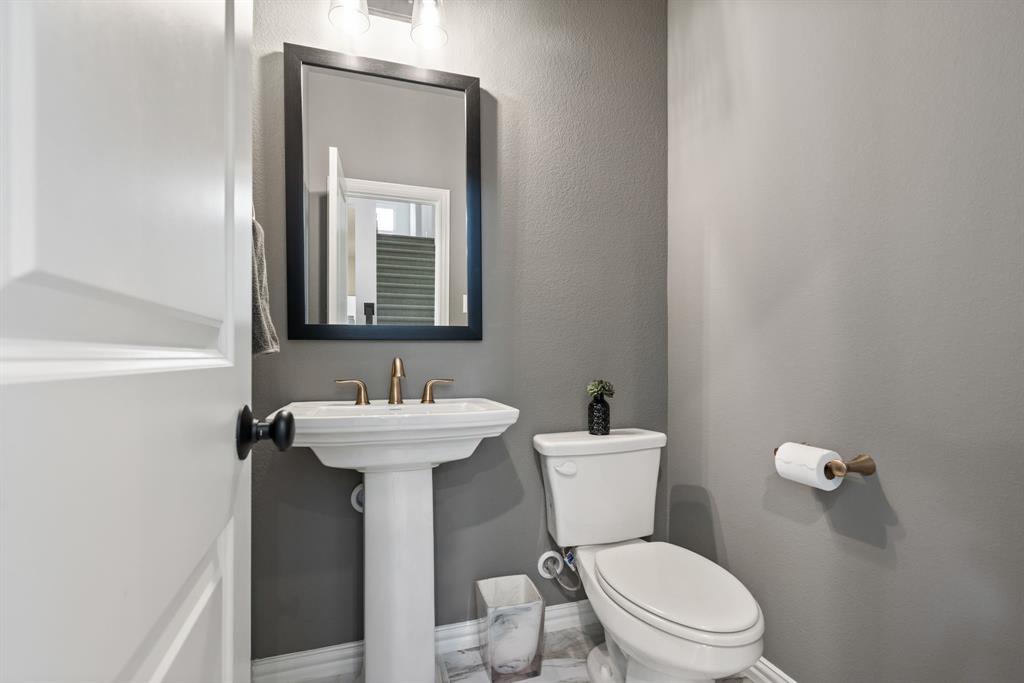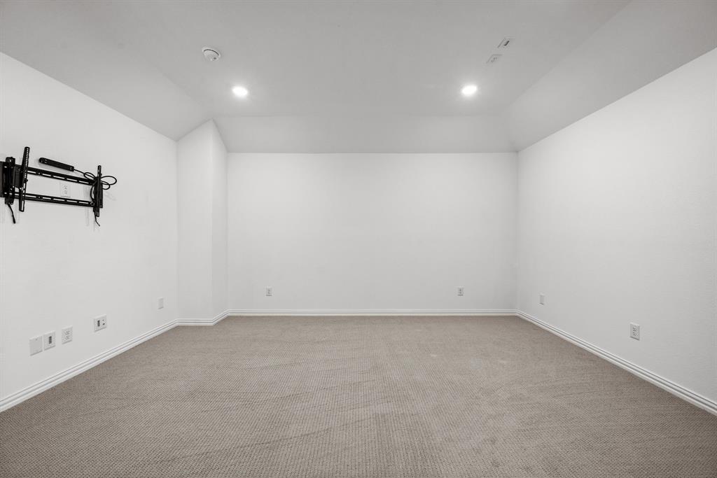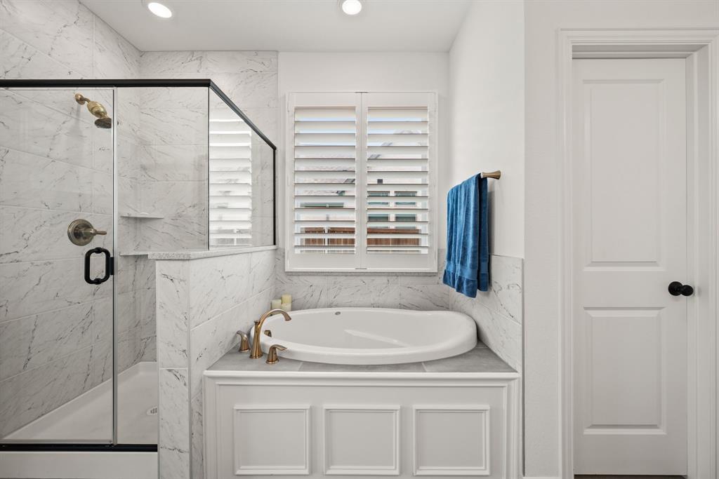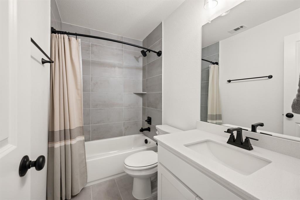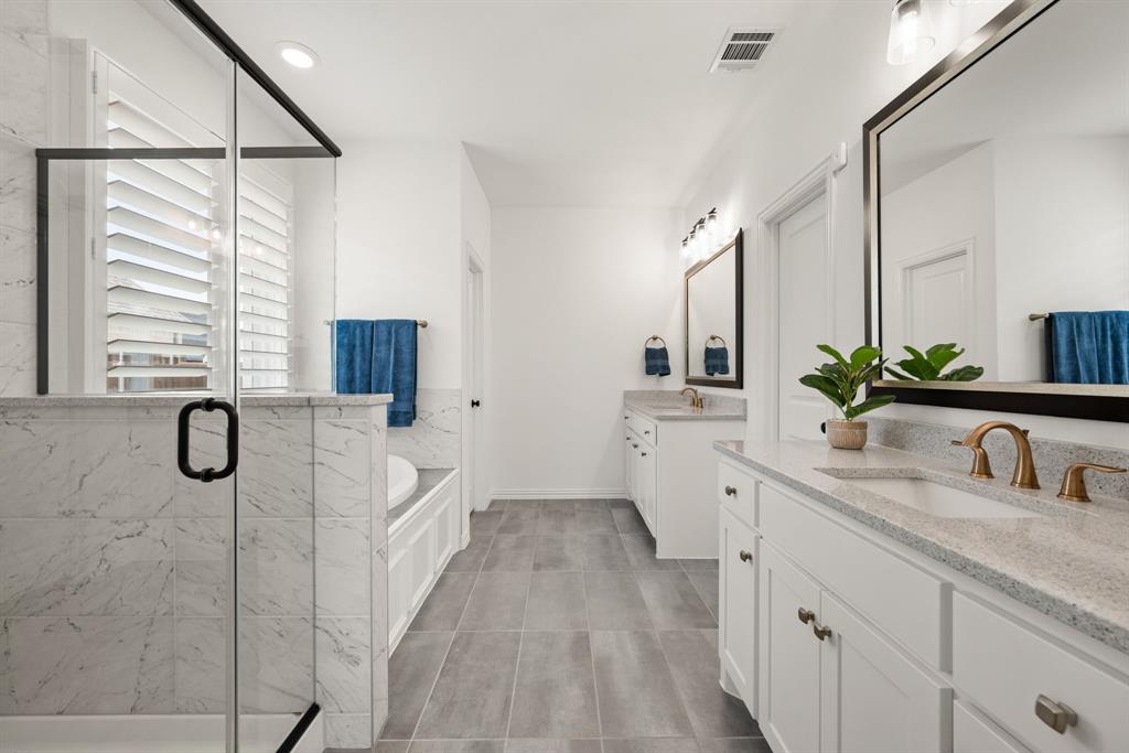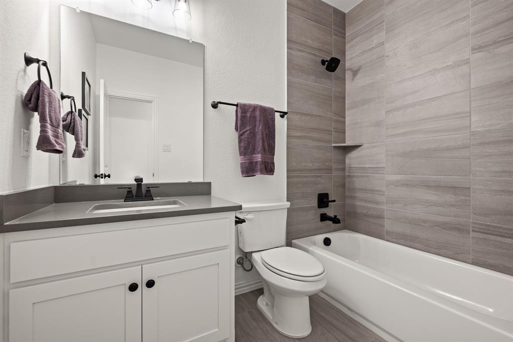 The primary suite on the main level and offers a private retreat with quartz dual vanities, a garden tub, separate shower, and large walk-in closet. Two bedrooms are located downstairs and two upstairs, creating a functional and private layout. Upstairs, a game room and dedicated media room are perfect for entertaining or family time. Step outside to a covered patio overlooking the large backyard—complete with a gas line ready for your grill—ideal for weekend BBQs or relaxing evenings. French drains are already installed to help manage water runoff. The backyard looks out into a green space, providing privacy and beauty.