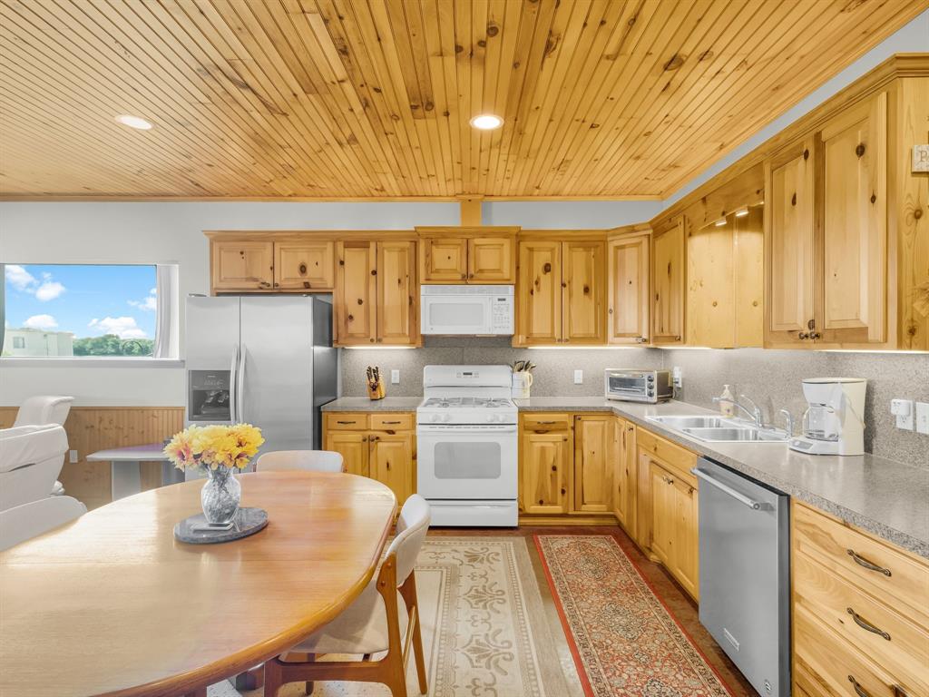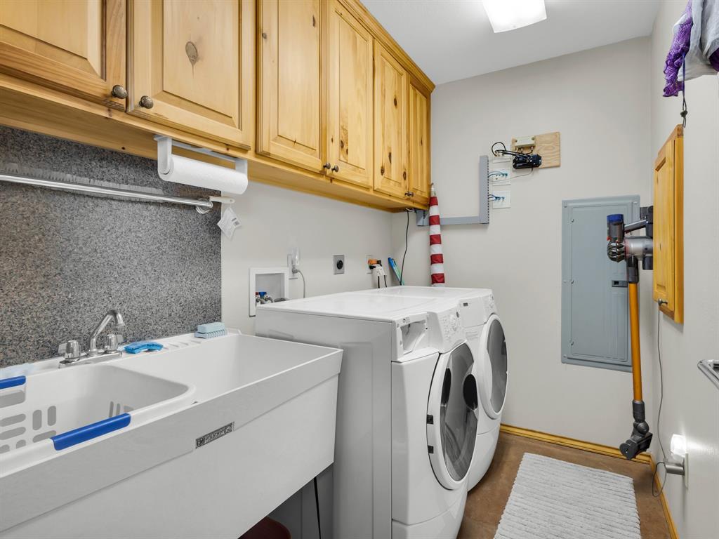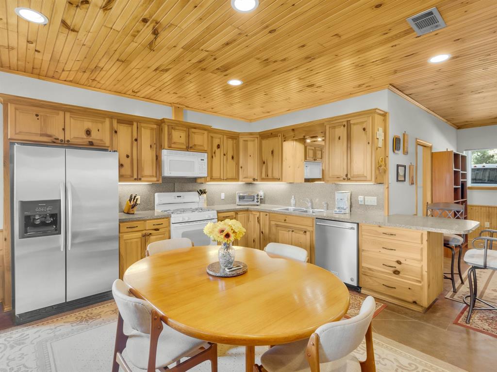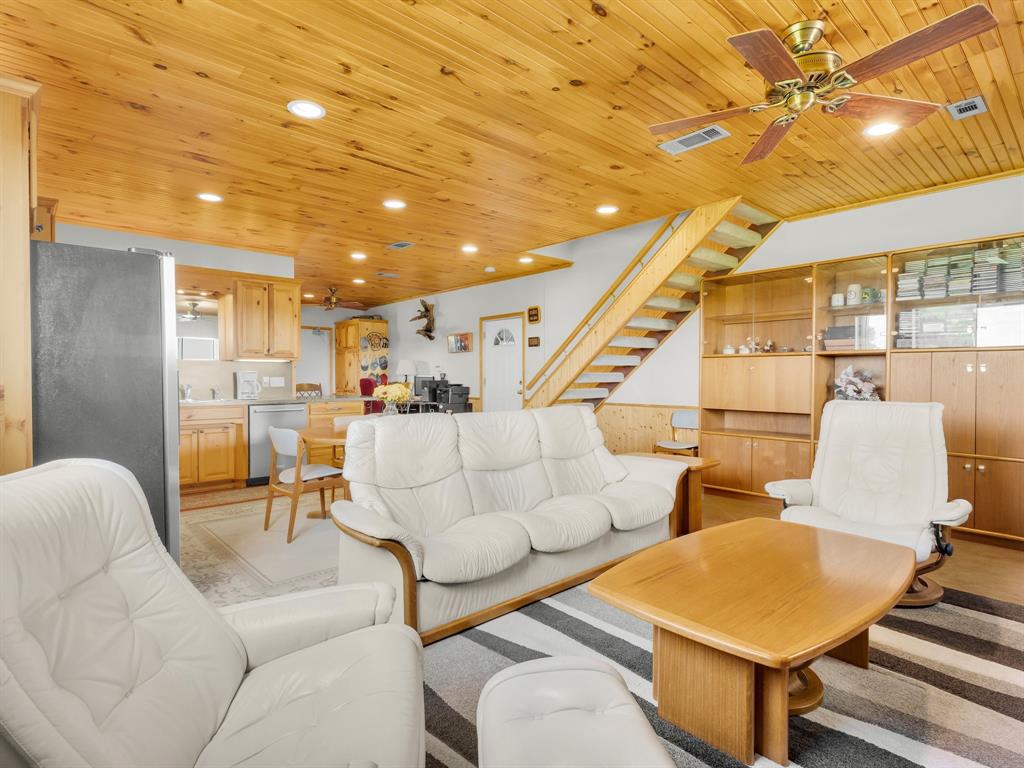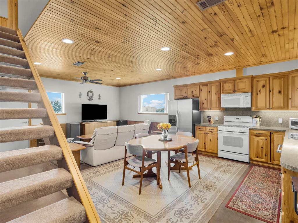 Inside, you’ll find custom handcrafted pine cabinetry, durable stained concrete floors downstairs, plush carpet in the upstairs bedroom, and a tankless water heater for on-demand efficiency.