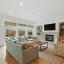 Expansive windows showcase the resort-style backyard, complete with a sparkling pool with room to gather around a table or lounge with grassy lawn beyond the pool for pets or play.
