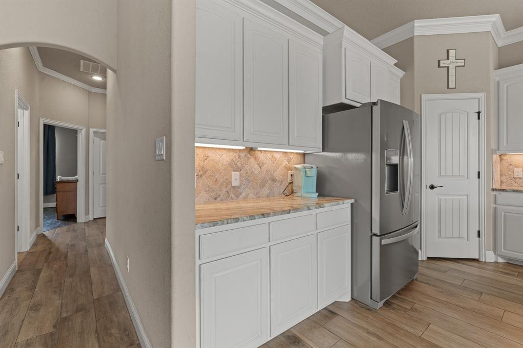 The oversized laundry room offers additional storage, cabinetry, and space for a second refrigerator. Step outside to a covered back patio ideal for entertaining or simply enjoying the beauty of Texas sunsets. The backyard also includes a large storage shed for added convenience.