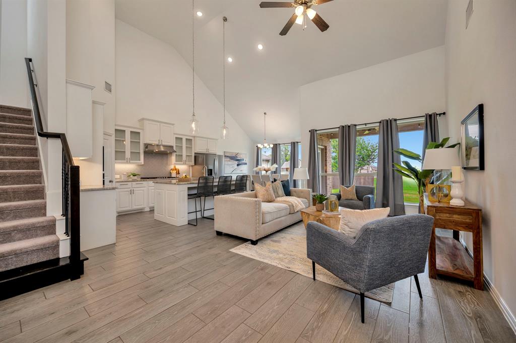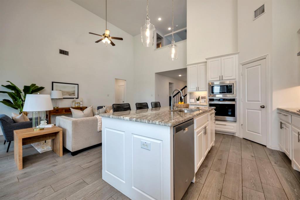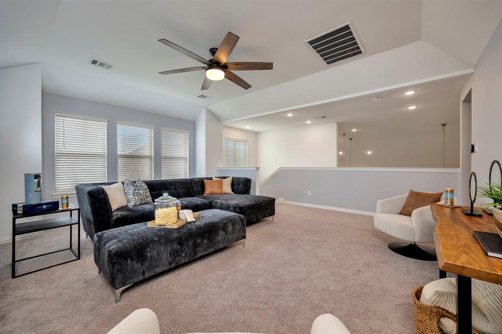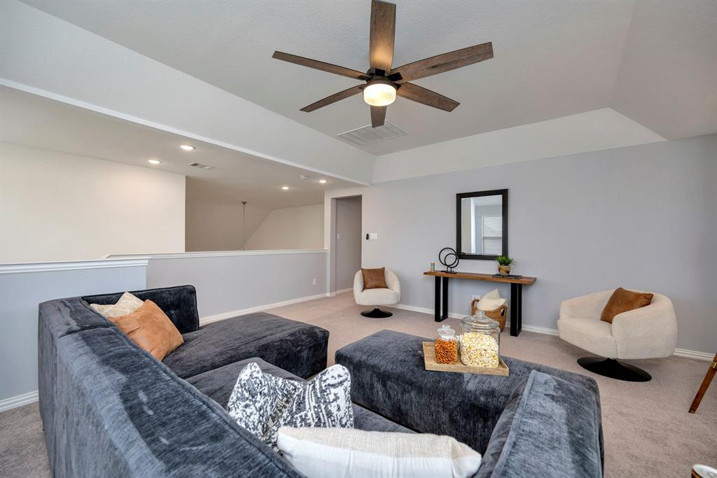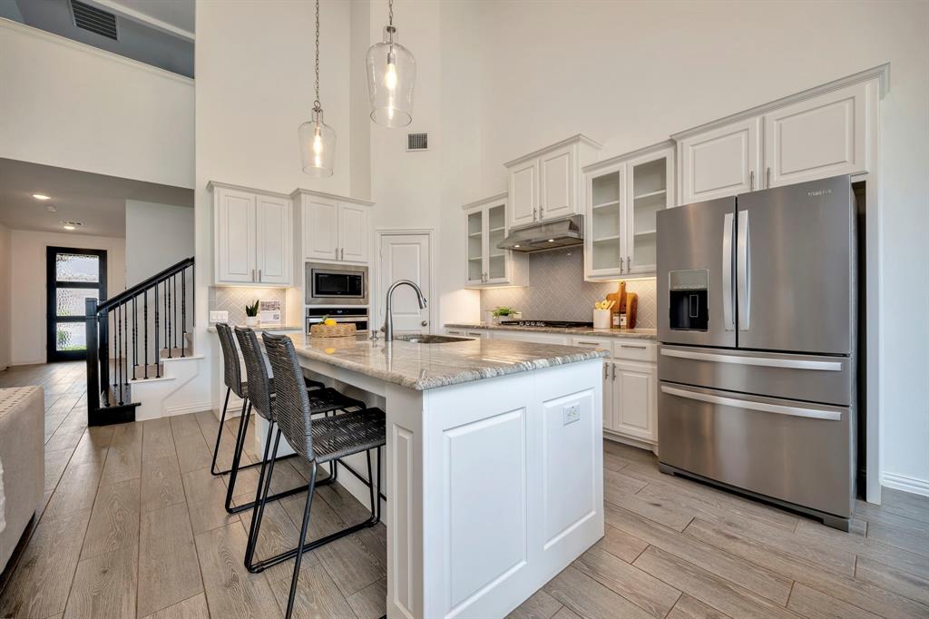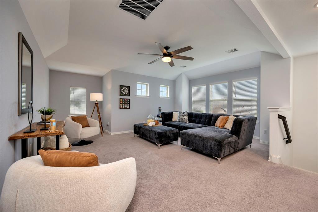 Gorgeous home in a great location near the end of a cul de sac street, in the desirable community of Canyon Falls! A fantastic floor plan with the primary bedroom and a second bedroom, plus a second full bathroom downstairs. The second bedroom could easily be used as an office. Upstairs is a large open game room, two more bedrooms and a full bathroom. The gourmet kitchen boasts beautiful granite counters, white cabinetry, a gas cooktop, a stainless built-in oven, microwave, and the stainless refrigerator stays! The kitchen is open to the large living area with high ceilings! Out back is a long, covered patio and huge back yard with a green space behind the home. Its perfect for entertaining guests and having lots of family fun! Membership in the Canyon Falls HOA comes with high speed internet, lawn maintenance in the front and side yard, and full use of the two community pools, fitness center, dog park, playground, jogging trails and hay barn! There are regularly scheduled community social events that are fun for the whole family! Attends highly rated NWISD schools - Thompson Elementary, Medlin Middle School and Byron Nelson High School! Conveniently located near Roanoke dining and entertainment. Come see why people love living in Canyon Falls!