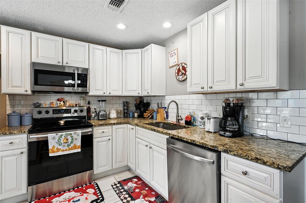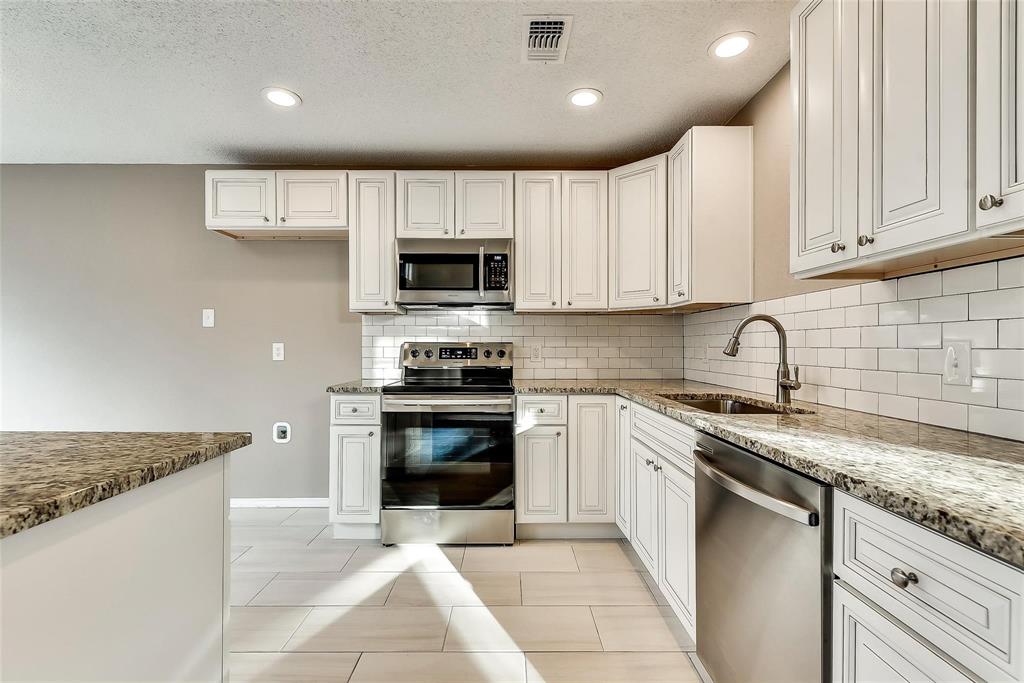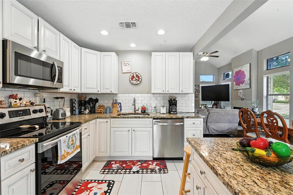 Thoughtfully updated in recent years, the home features an open kitchen with soft-close cabinets, granite countertops, stainless steel appliances, and elegant porcelain tile and luxury laminate flooring throughout the main areas.
