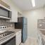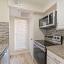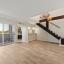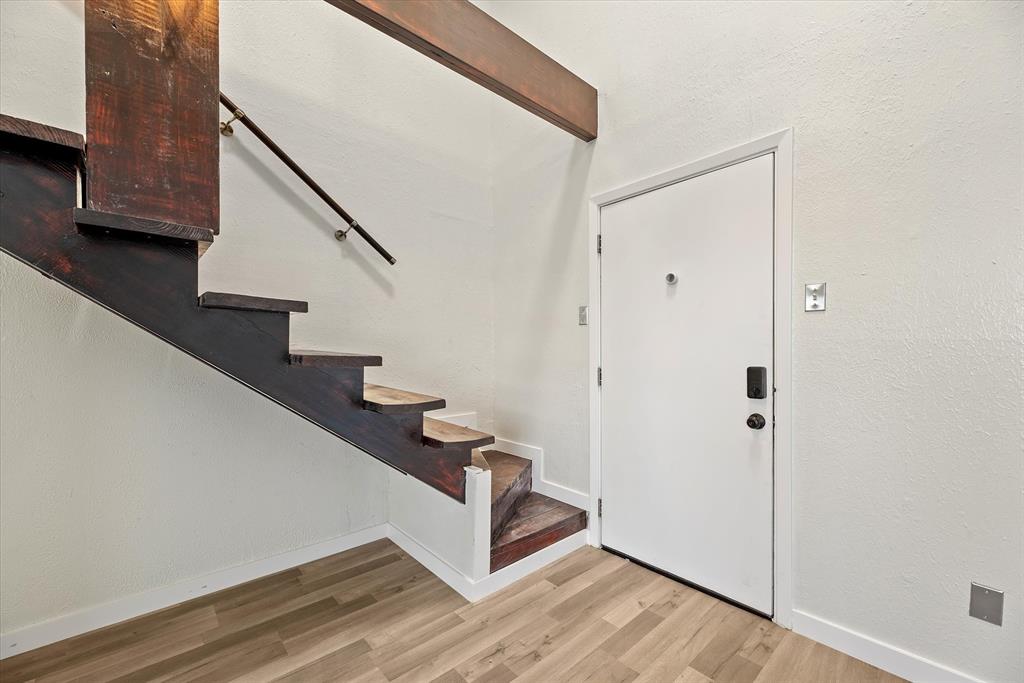 The open floor plan connects the airy living room to a bright kitchen with stainless steel appliances, brand-new refrigerator, white cabinets, and granite countertops. A stunning floating staircase leads to the upstairs bedroom, which overlooks the living area, adding a unique architectural flair. This condo features new modern flooring throughout (carpet-free), a stylish new vanity, beautiful shower, new AC system, and chic lighting fixtures.