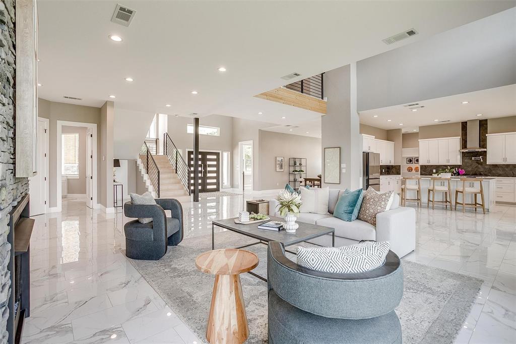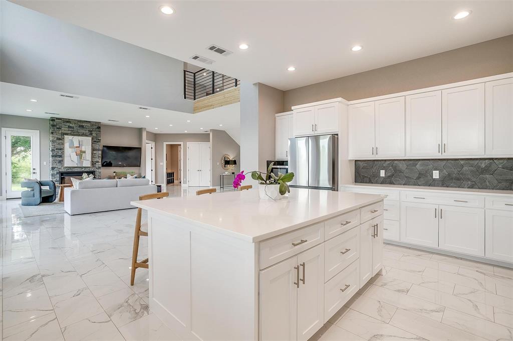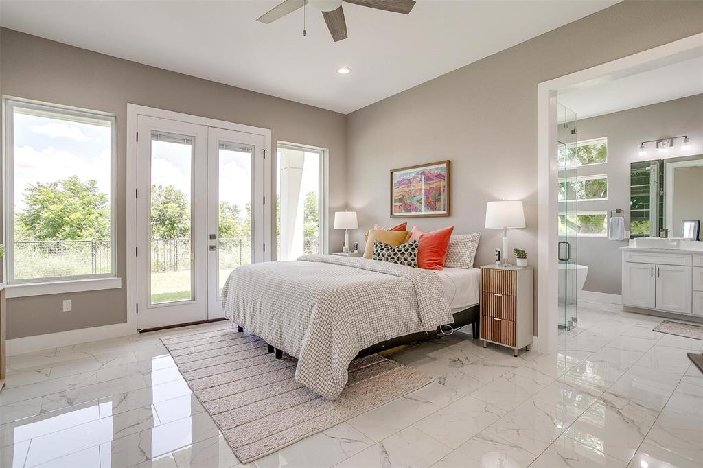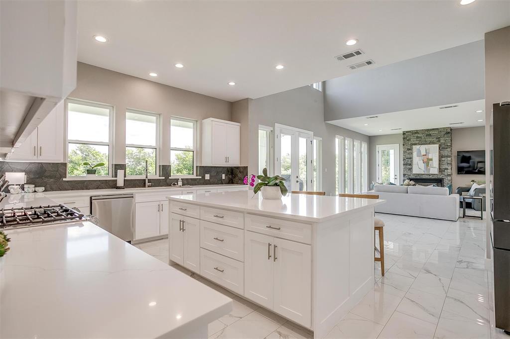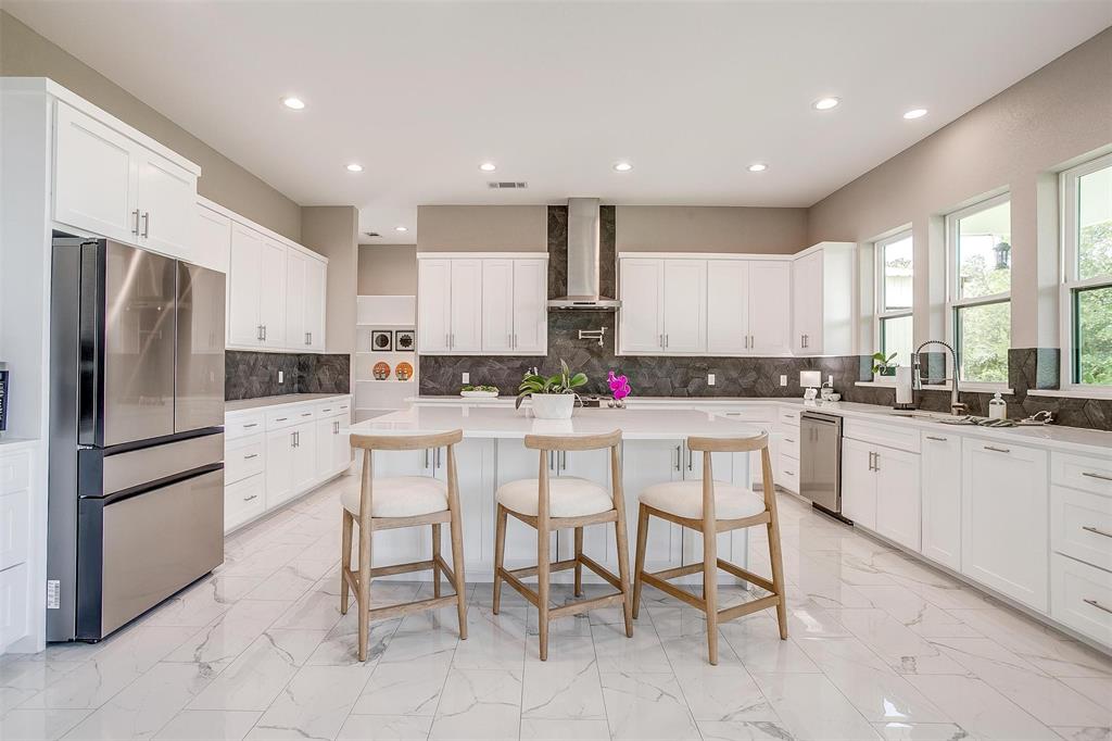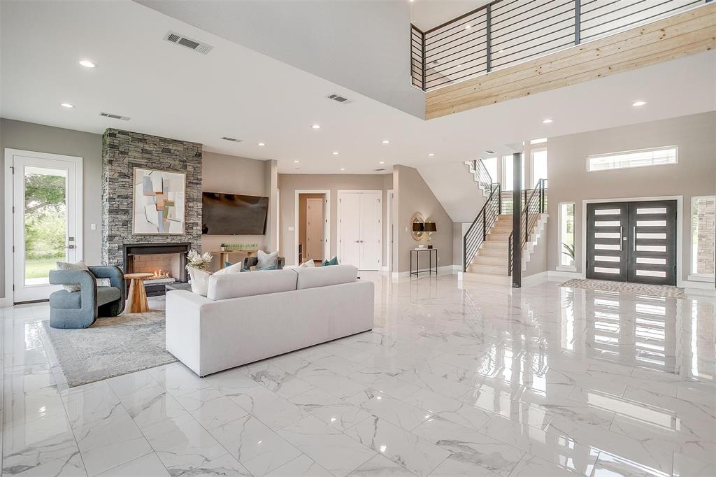 Nestled onto a Secluded Street, you will find this Gated 2 acre lot with a Ton of Native Trees and a One of a Kind Modern Home. Boasting over 5600 sqft, this Home offers 5 bedrooms, 4.5 bathrooms and Views for Miiles from the 2 Balconies and Private Seclusion on the 2 Backyard Patios. The Exterior is Studded with a Modern Design mix of Wood, Steel & Hardie Board, featuring Double Iron Front Doors & a 3-car Garage with Glass & Metal Doors. As you walk into this Custom Home you will find Clean Lines, an Abundance of Natural Light, a Blend of Marble, Wood & Steel, Open Living Spaces, Generous Room sizes & Custom Finishes that set this home apart. In the Entertainer’s Kitchen, you will never lack for Cabinet Space and the Stainless Appliances, Gas Range & Oversized Island add to the Luxury of the space. Off of the Kitchen you will find the Pantry with Plenty of Room to store bulky appliances & including a Prep Area. Enjoy Holiday Meals in the Dining Room that could Easily Accommodate a table Large enough for the Whole Family. The Office provides Ample Space for a Large Desk and all of your accompanying work needs. The Downstairs Primary Bedroom offers a Private Patio for morning coffee and a Closet that you don’t want to miss! As you move Upstairs you will find a 2nd Primary Bedroom complete with Fireplace and its own Balcony that has Stunning Views. Also Upstairs are an Additional Ensuite Bedroom, 2 other Large Bedrooms sharing a Jack & Jill Bathroom and a Game Room Perfect for all of your Fitness Goals, Movie Nights & Teenage Hangouts. After you finish taking in the Wow Factor of the Interior of the Home, also consider the Water Well, Double Tankless Water Heaters & Fully Encapsulated Spray Foam that add to the Functionality of this Pristine Home. The 2 acre lot is Fully Pipe Fenced, has a Barn for storage, a Playhouse, Custom Exterior Lighting, a Seasonal Pond, Plenty of Room for a Pool, all backing up to a Sensational Cliffside View of the Neighboring Lake.
