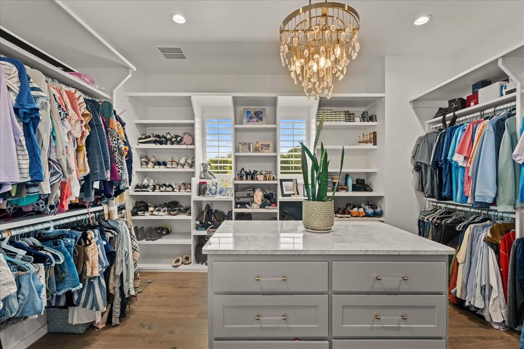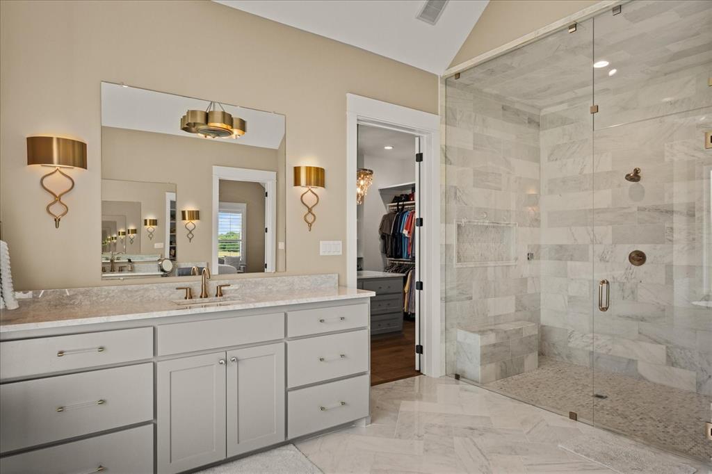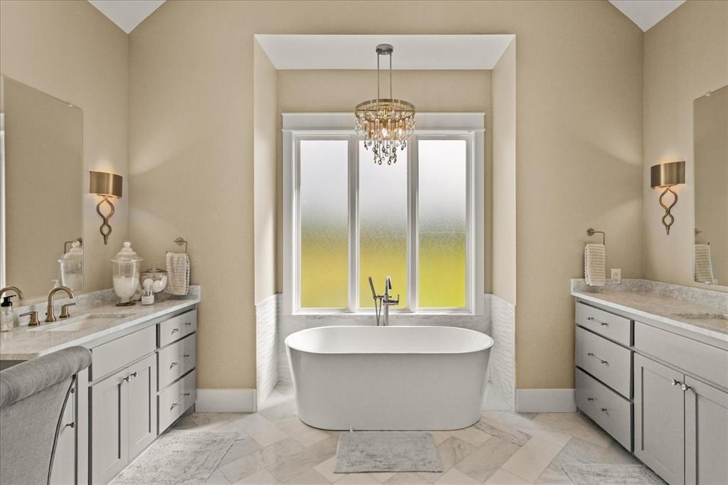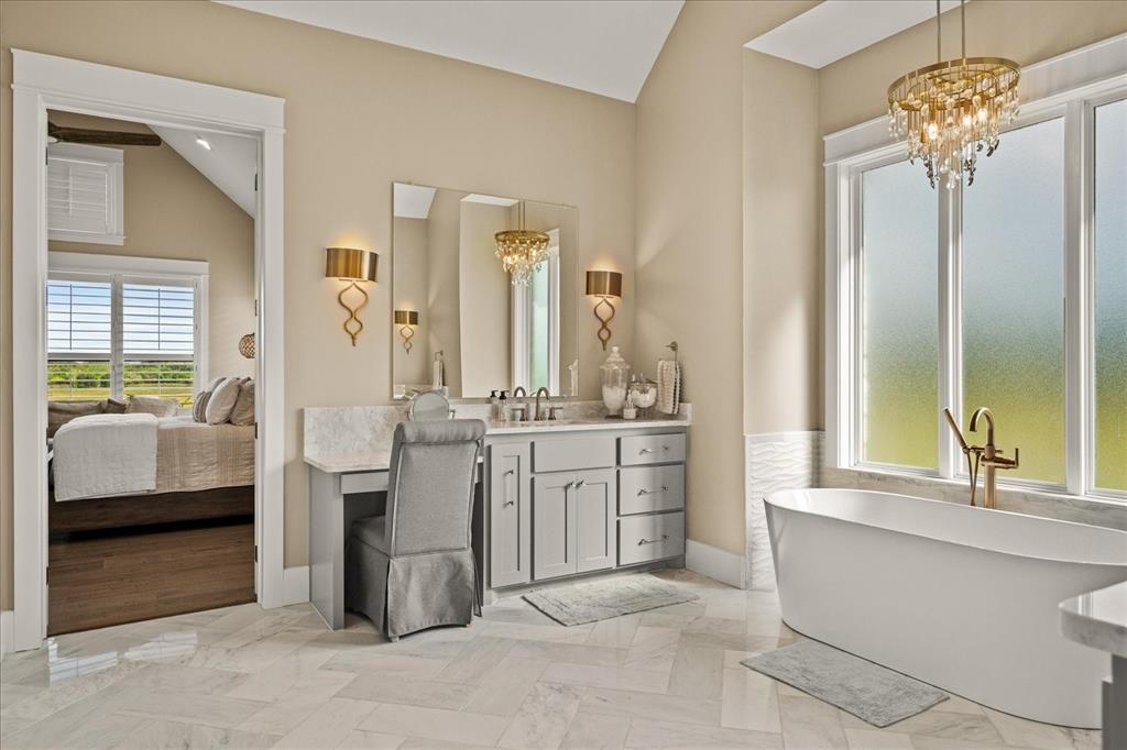 The gourmet kitchen is a chef’s dream, showcasing premium appliances including a 6-foot built-in refrigerator, gas range, and custom cabinetry. An open-concept layout connects seamlessly to the elegant living and dining spaces, making this home ideal for both quiet retreats and stylish gatherings. The primary suite offers a spa-like escape with an oversized marble steam shower, freestanding tub, and a boutique-style custom closet complete with multiple crystal chandeliers.