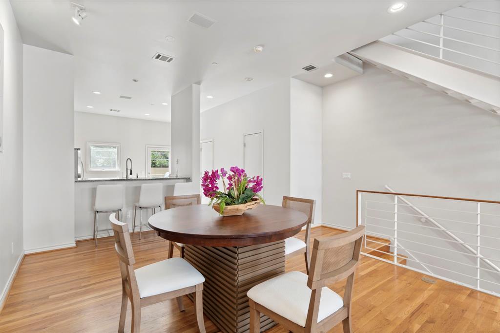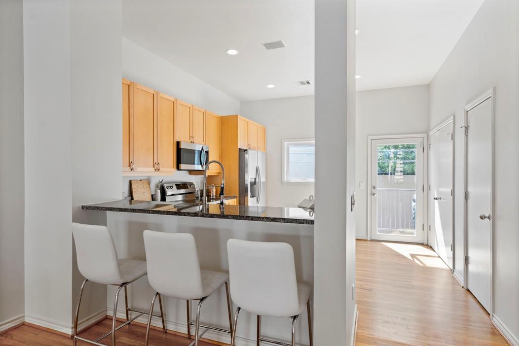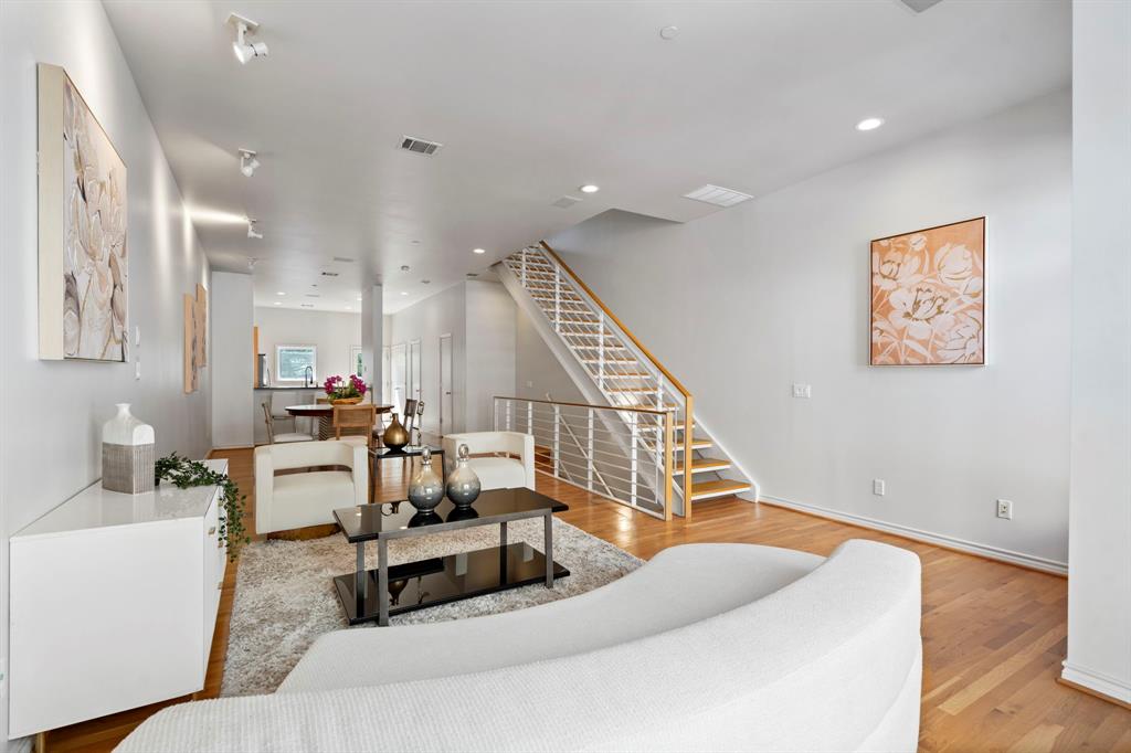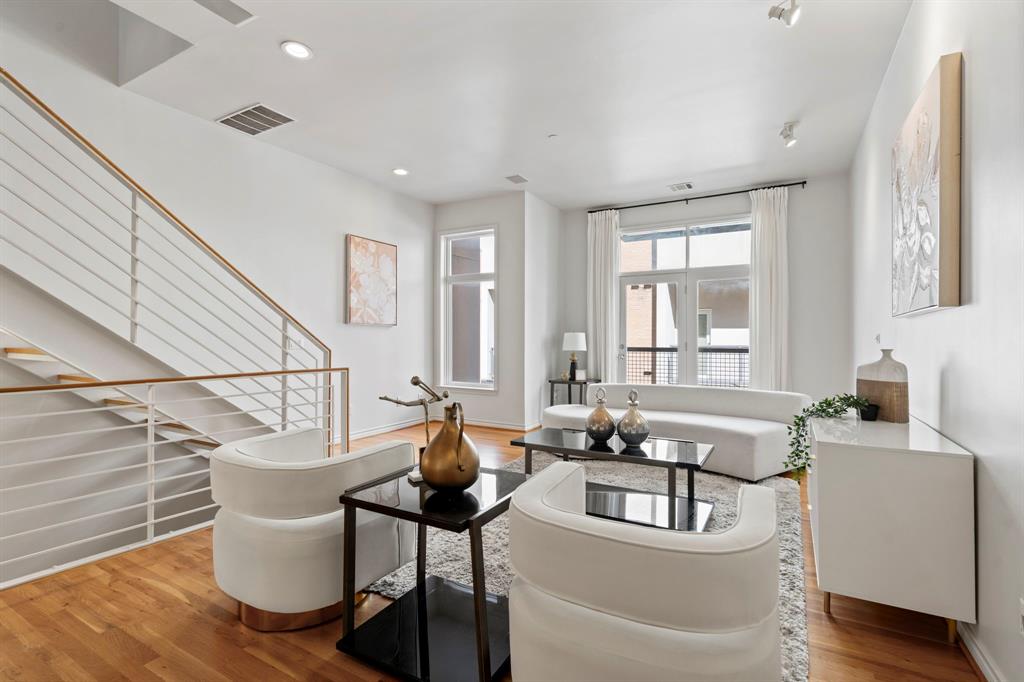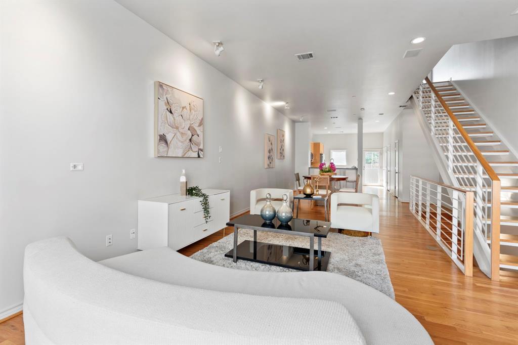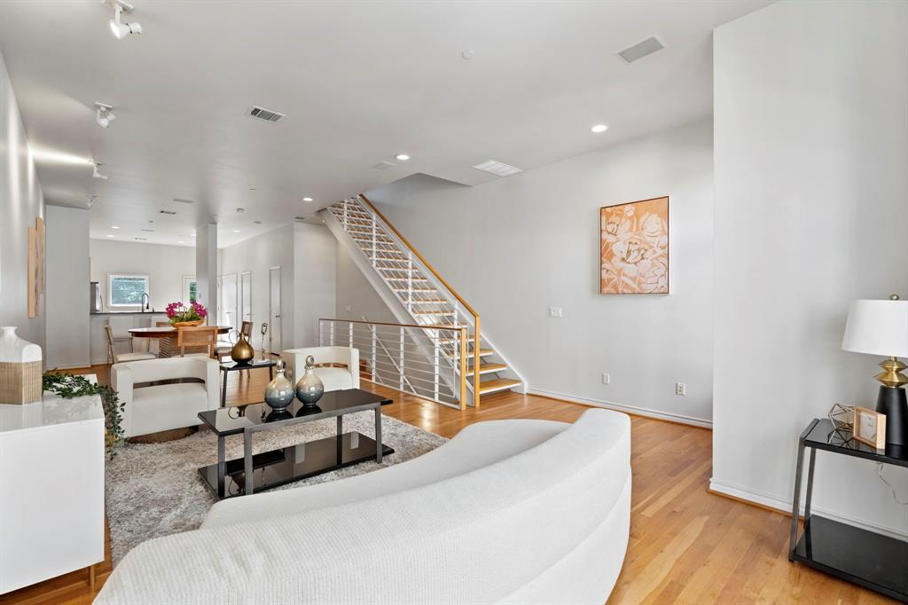 Inside, the home spans three spacious stories, offering fresh style and functionality with brand new carpet, new paint, and recently refreshed hardwoods. Soaring ceilings, large windows, accent lighting, and hardwood floors create a bright and welcoming main level. The open-concept kitchen features bar seating, granite counters, and stainless appliances, ideal for entertaining or everyday living.