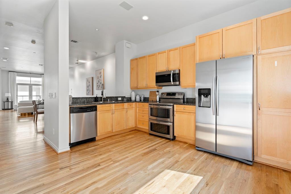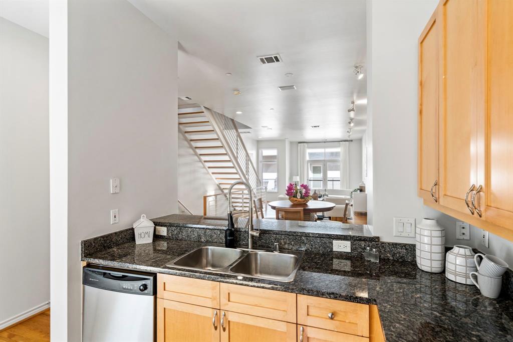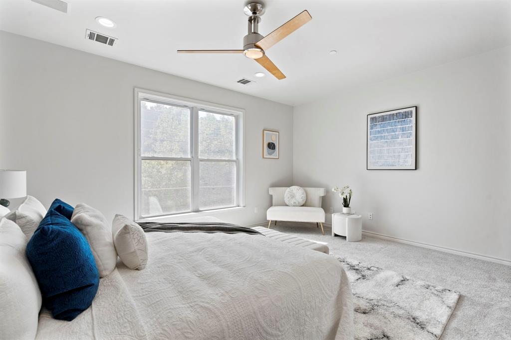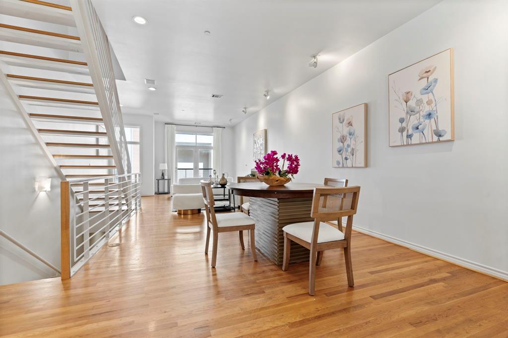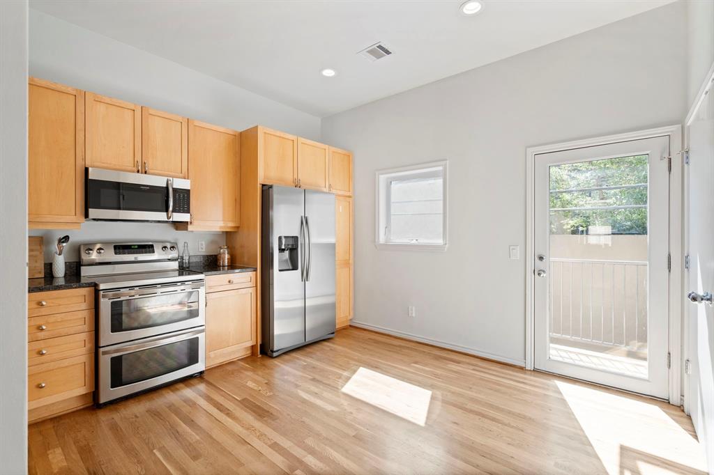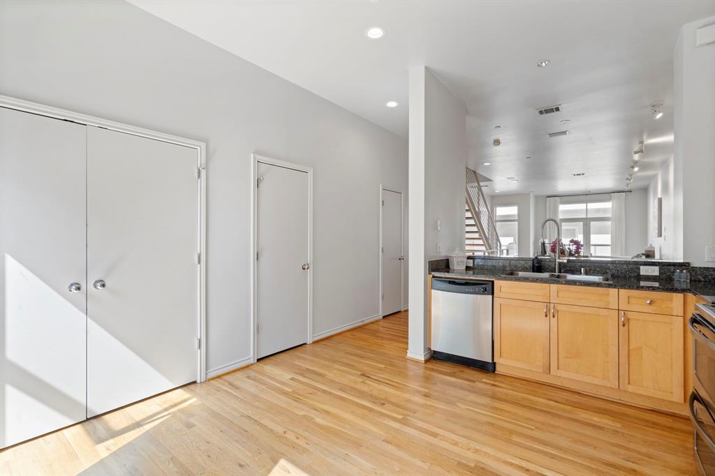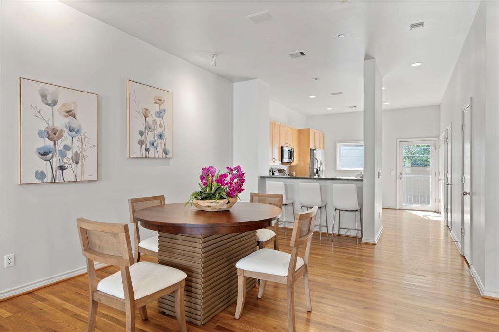 Inside, the home spans three spacious stories, offering fresh style and functionality with brand new carpet, new paint, and recently refreshed hardwoods. Soaring ceilings, large windows, accent lighting, and hardwood floors create a bright and welcoming main level. The open-concept kitchen features bar seating, granite counters, and stainless appliances, ideal for entertaining or everyday living.