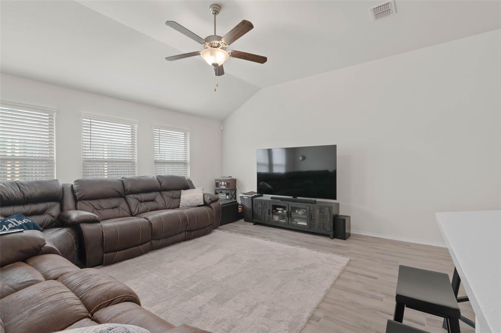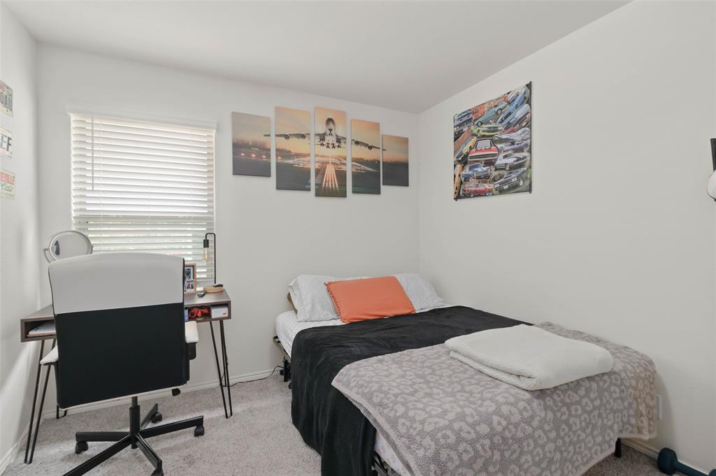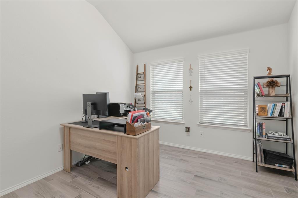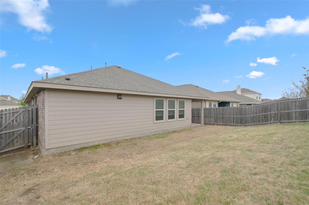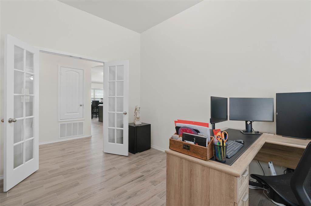 Step into comfort and style with this beautifully designed Lennar Bluebonnet floor plan featuring 4 spacious bedrooms, 2 full bathrooms, and a dedicated study with elegant French doors making this perfect for a home office or flex space. The open concept layout is ideal for both everyday living and entertaining, showcasing a modern kitchen with quartz countertops, stainless steel appliances, and ample cabinetry that flows effortlessly into the living and dining areas. The private primary suite offers a relaxing retreat with a luxurious ensuite bath complete with a separate soaking tub, walk in shower, and a generous walk-in closet. Additional highlights include a 1 YEAR OLD ROOF, multiple Smart Home features, an energy efficient 16 SEER HVAC system, and carpet only in the bedrooms. Enjoy outdoor living on the covered patio overlooking a grassy backyard, perfect for gatherings or quiet evenings at home. This energy efficient, well-appointed home blends comfort and functionality in every corner.