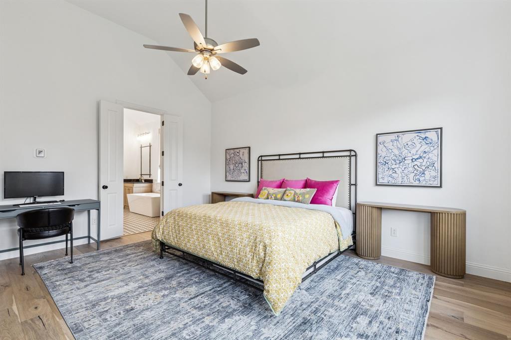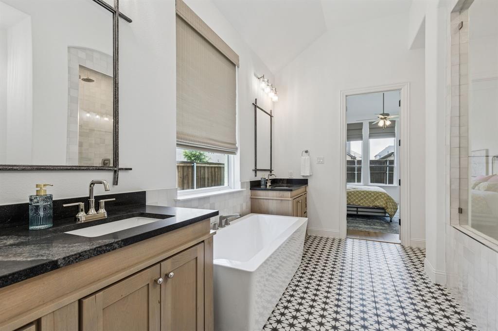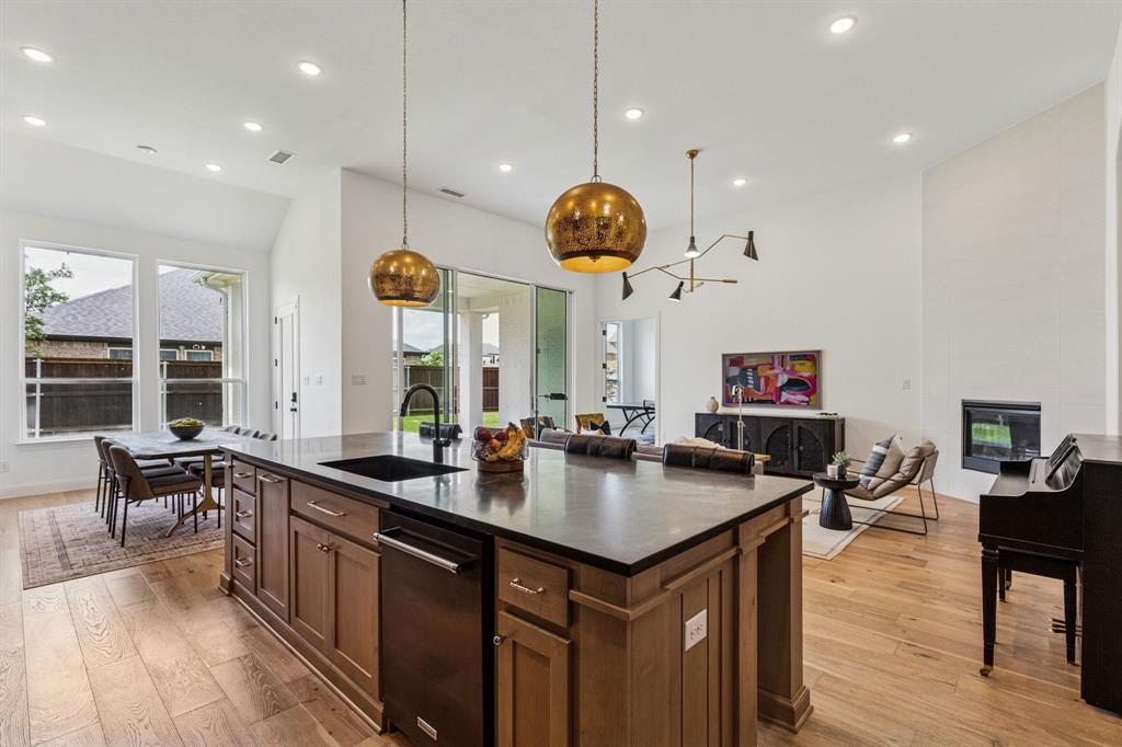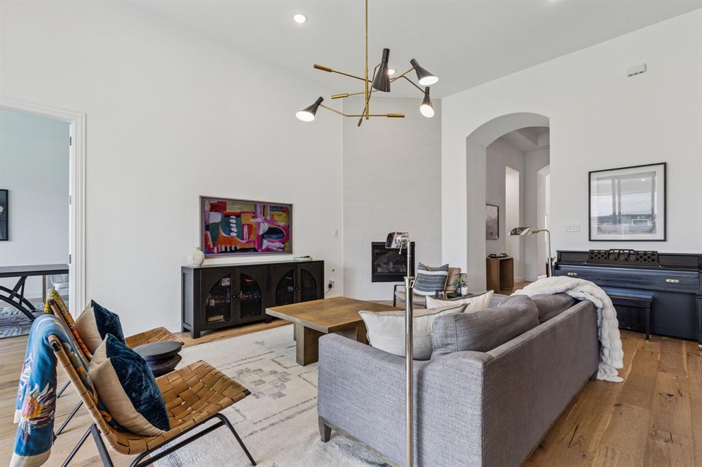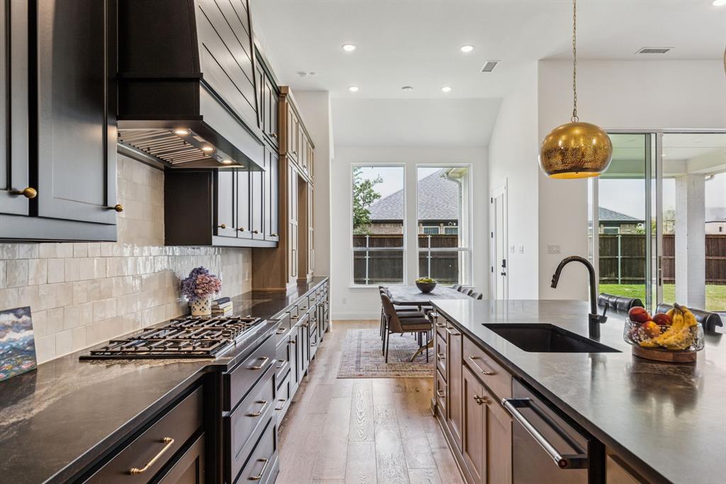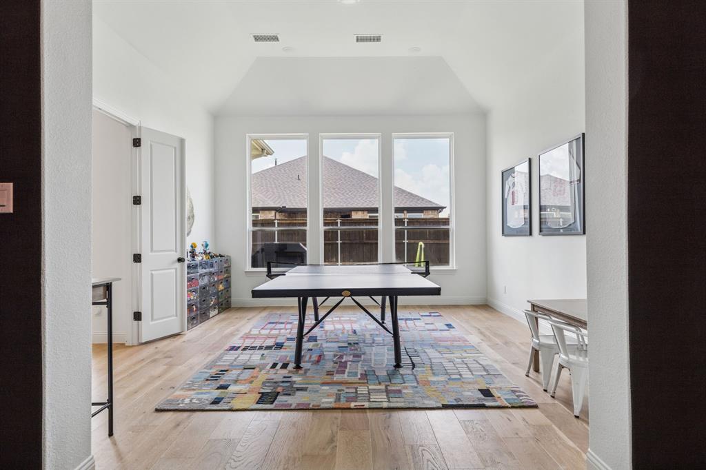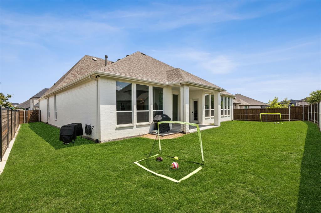 Custom-designed single-story home with luxury finishes and an impressive list of features, situated on a rare 70-foot oversized corner lot. 4 Bedroom, 4 Full Baths, Media Room and Game Room located in a community that offers so much more! Step inside to soaring tall ceilings and engineered wood flooring that flow throughout the main living areas, creating an open and inviting atmosphere. A split-bedroom layout offers privacy for the primary suite and separation from the secondary bedrooms, ideal for families and guests alike. The designer's inspired kitchen includes stunning two tone cabinets, wooden and black, topped with exotic book-match granite countertops and extended backsplash to the ceiling. For the chef in the family, cook endlessly with black stainless steel KitchenAid appliances, including a 5-burner gas range, double ovens, ice maker, and an oversized island with plenty of prep space. The kitchen opens seamlessly to the bright family room featuring tiled gas fireplace and a sliding glass door leading to a spacious covered patio. Family night has never been so great, with the game room and media room featuring custom surround sound speaker system right off the main living area. The luxurious primary suite serves as your personal retreat, featuring double vanities, luxury bathtub, walk-in shower, and oversized walk-in closet. Large secondary bedrooms make the perfect family home. Outside, enjoy the oversized corner lot with plenty of room for outdoor activities, gardening, and more! The large covered patio invites you to unwind or entertain in style, extending your living space into the fresh air. All of this, set within a vibrant master-planned community boasting resort-style amenities: a sparkling pool, splash pad for kids, state-of-the-art fitness center, scenic walking trails, and an adventure park featuring climbing structures and a ninja course—perfect for active families and outdoor enthusiasts. Designed for the way you live—inside and out!