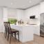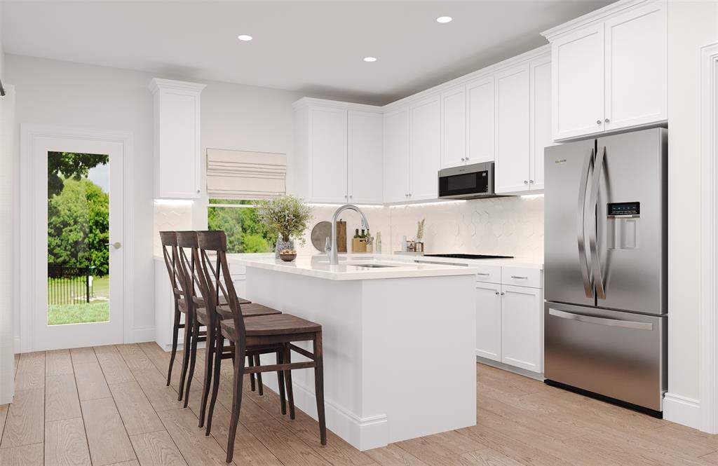 Designed with the latest trends in mind, this home showcases quartz countertops, light colored hardwood flooring, and striking tan cabinetry.
