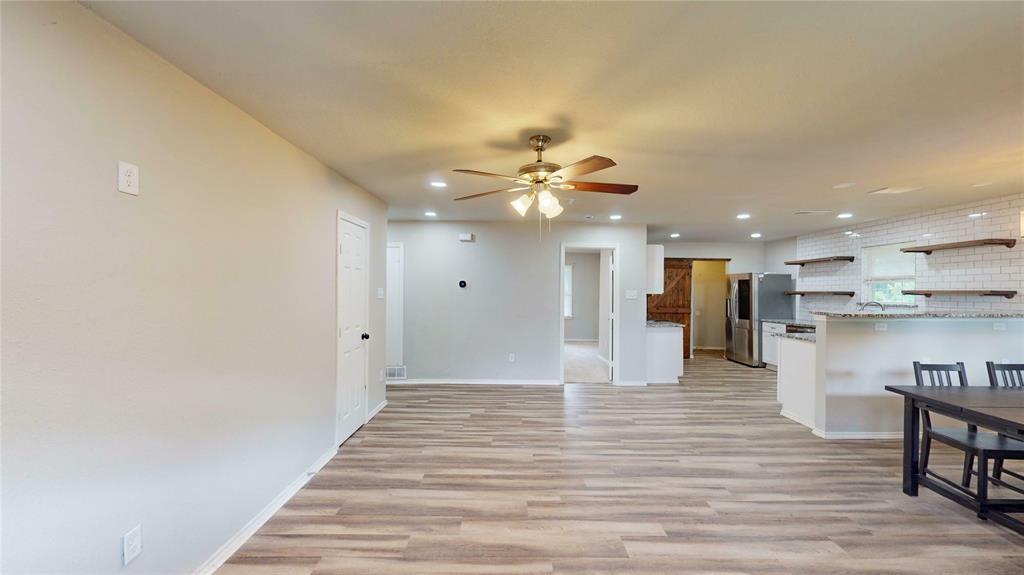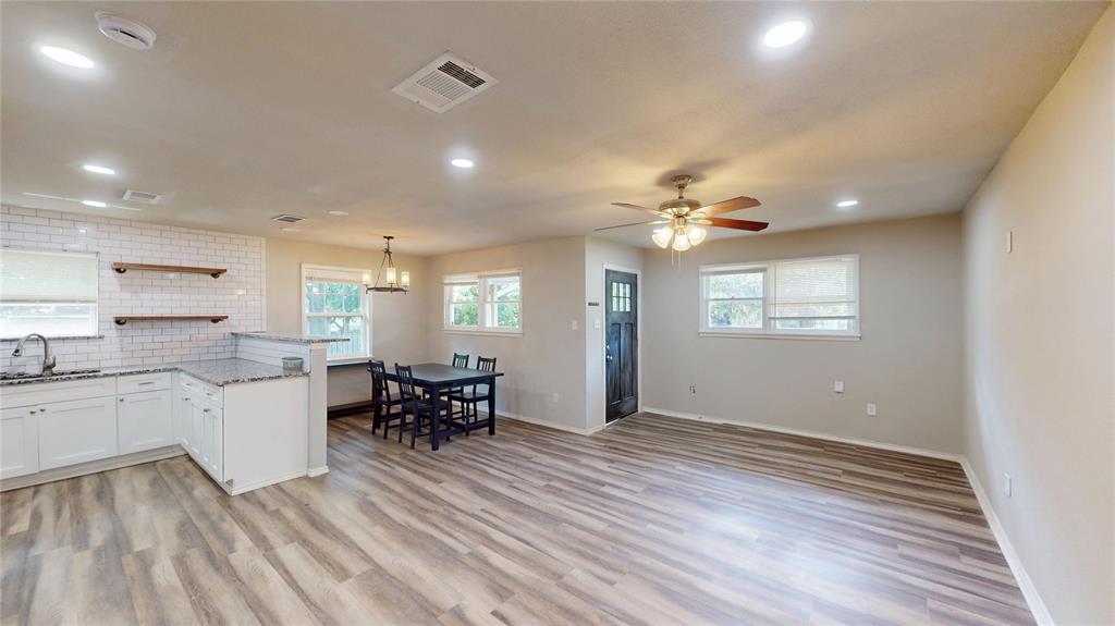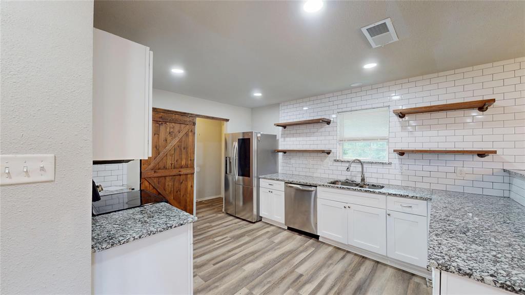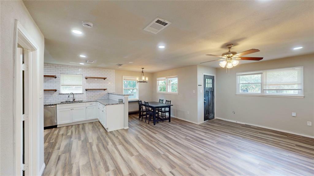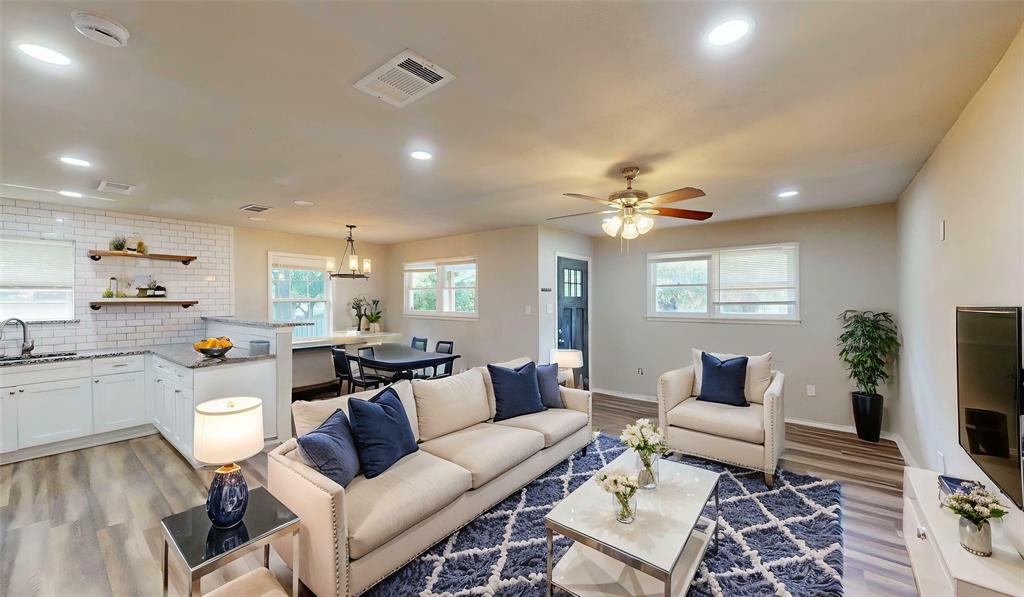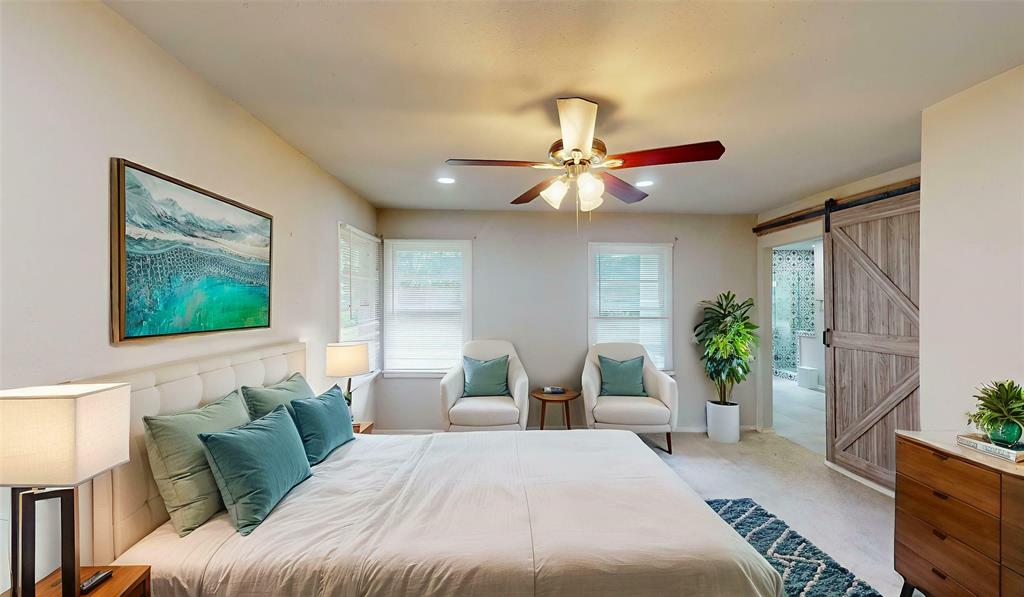 Welcome to this charming and meticulously updated home, nestled in a desirable neighborhood with a spacious, lush front yard that offers a warm and inviting curb appeal. This delightful residence features a modern open-concept living area, seamlessly connecting the living room and a beautifully updated kitchen. The kitchen boasts elegant countertops, contemporary white cabinetry, and sleek stainless steel appliances, providing a perfect backdrop for both casual dining and entertaining. The living area's large windows flood the space with natural light, highlighting the elegant flooring and creating a cozy, yet sophisticated ambiance. Each bedroom is generously sized, offering ample space for relaxation, with the master suite featuring a unique sliding barn door leading to an en-suite bathroom. The bathrooms are thoughtfully designed with stylish tilework and modern fixtures. Step outside to the expansive backyard—a true sanctuary with plenty of shade and privacy, ideal for outdoor activities or tranquil evenings. This home combines comfort, style, and functionality, making it an ideal choice for those seeking a move-in-ready gem in a vibrant community.