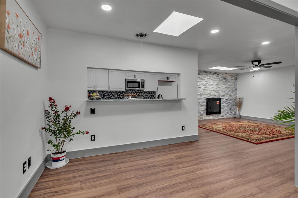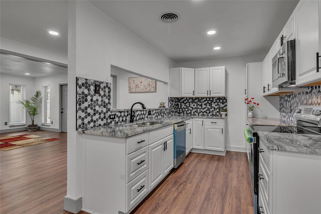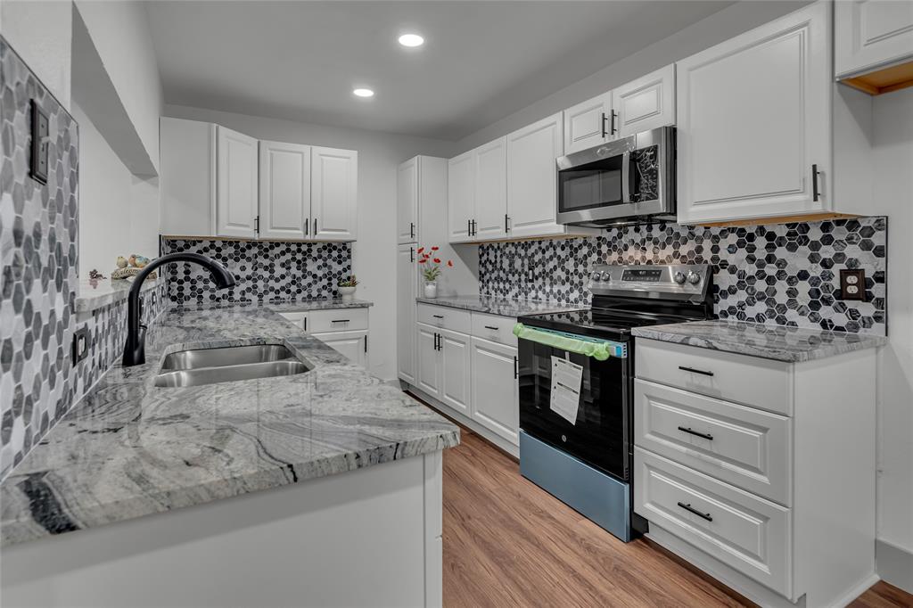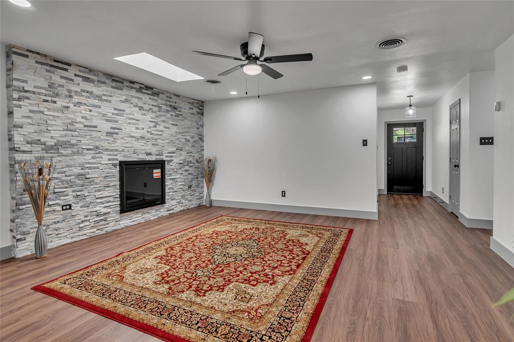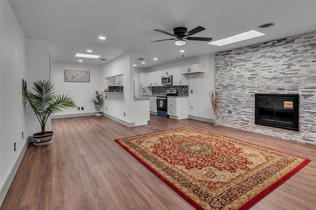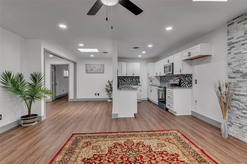 Inside, you’ll find all-new hard surface flooring throughout (no carpet!), granite countertops, and brand-new stainless steel appliances. The open-concept layout is filled with natural light and features a spacious living area with a stunning stone-accented fireplace. The kitchen has been fully redone with white cabinetry, sleek finishes, and a stylish backsplash—ideal for cooking or entertaining.