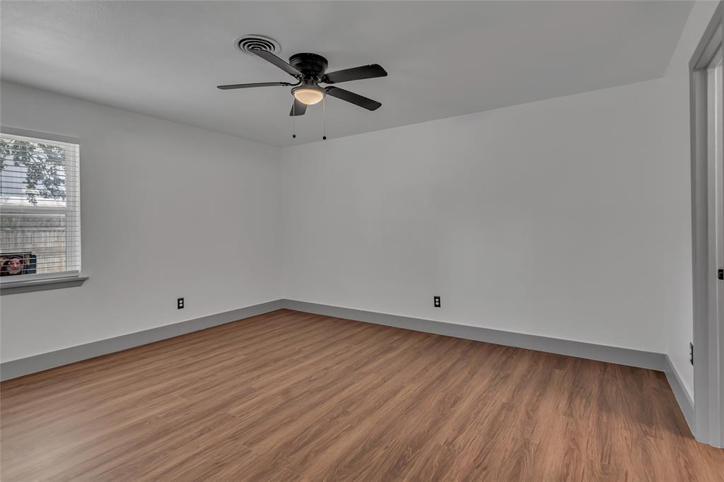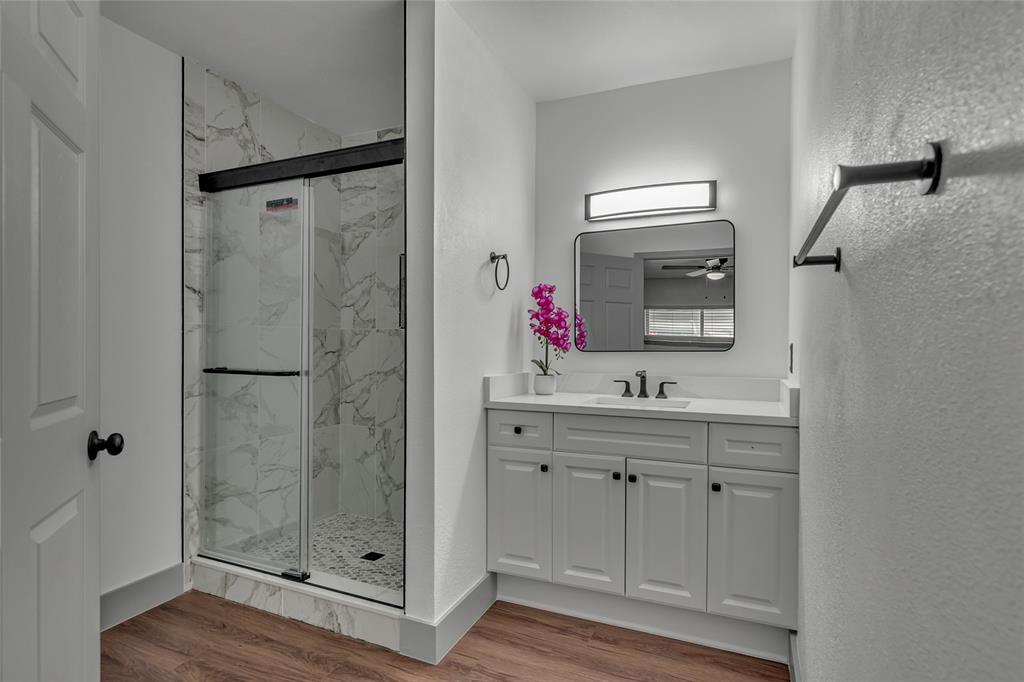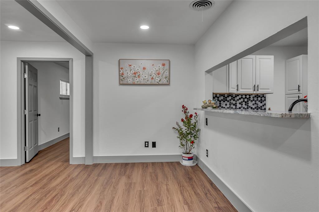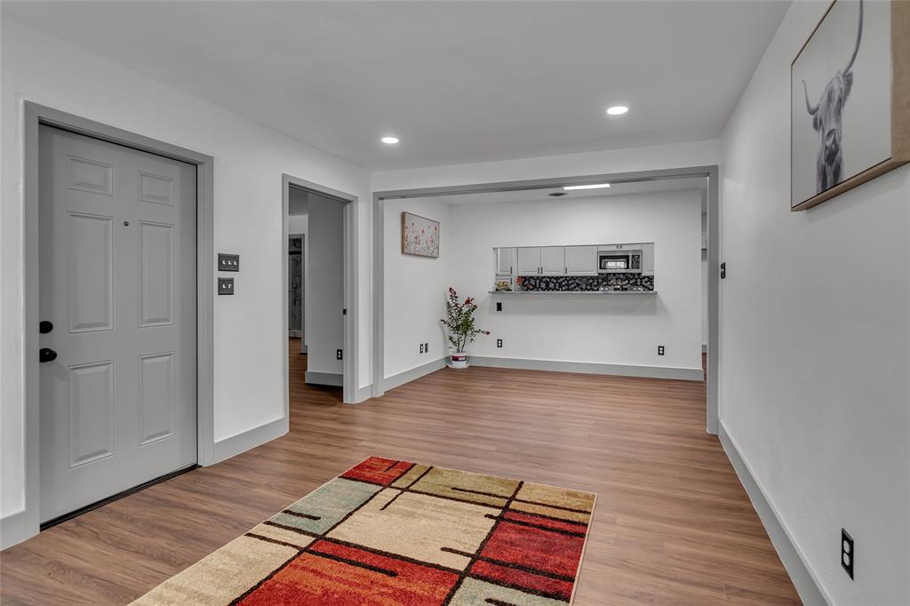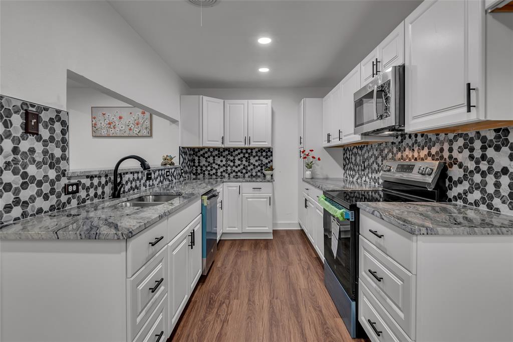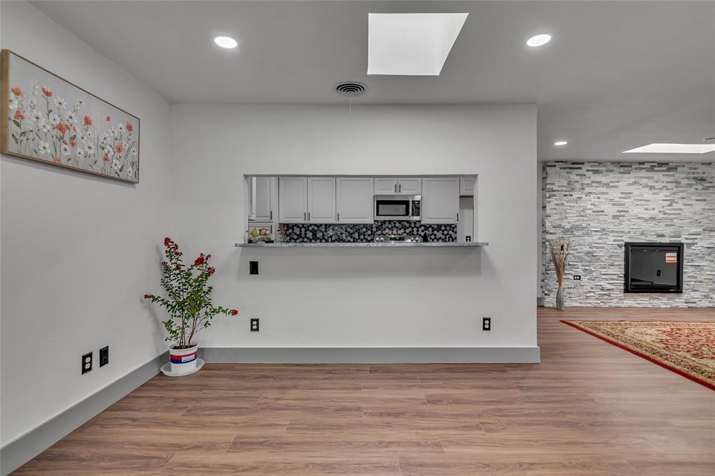 Inside, you’ll find all-new hard surface flooring throughout (no carpet!), granite countertops, and brand-new stainless steel appliances. The open-concept layout is filled with natural light and features a spacious living area with a stunning stone-accented fireplace. The kitchen has been fully redone with white cabinetry, sleek finishes, and a stylish backsplash—ideal for cooking or entertaining.
