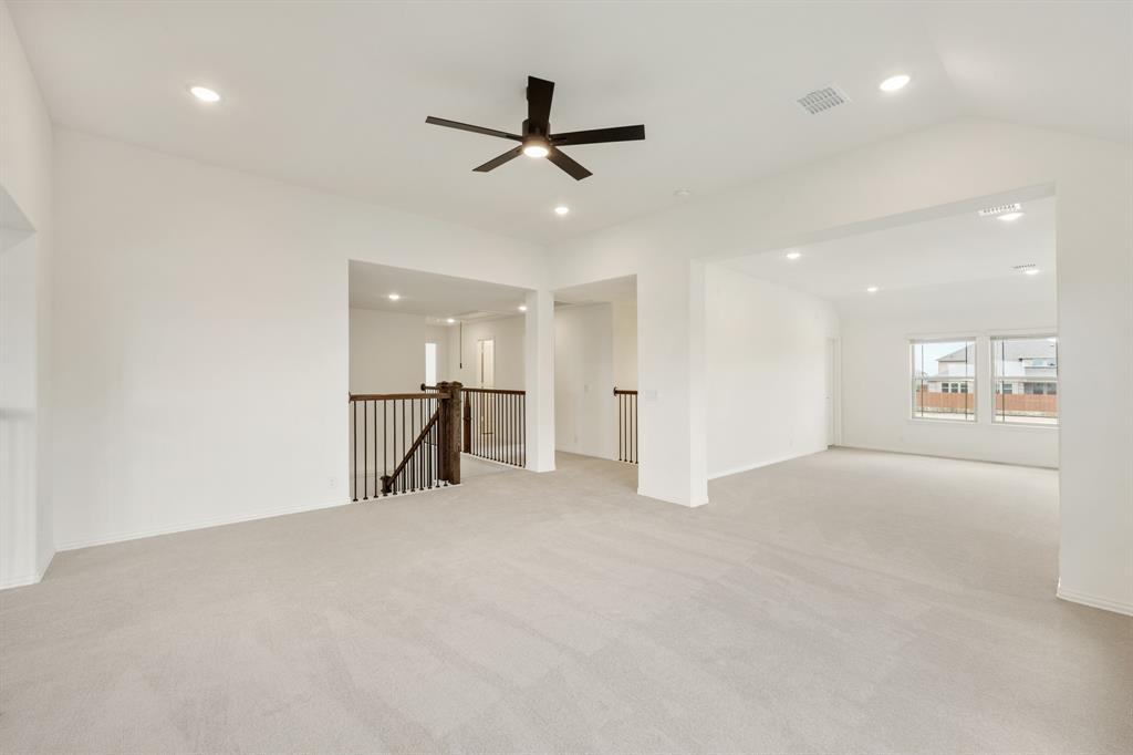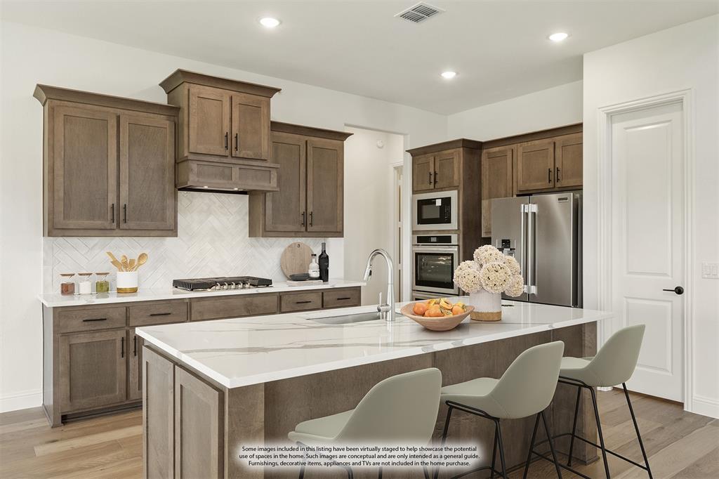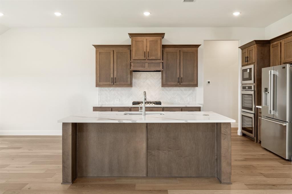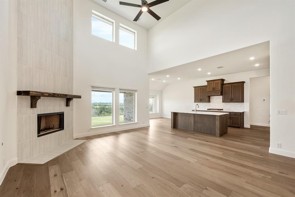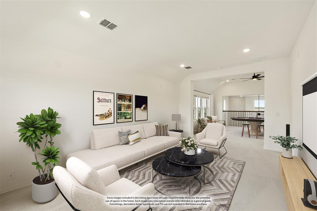 NEW! NEVER LIVED IN! Bloomfield’s Bellflower II on an oversized greenbelt lot welcomes you with timeless curb appeal, featuring a full brick exterior and an impressive 8' front door. Inside, the Family Room impresses with soaring 17' ceilings and a striking tile-to-ceiling fireplace with cedar mantel, delivering both warmth and wow factor. The open-concept Deluxe Kitchen is designed for both beauty and function, showcasing a double oven, 5-burner gas cooktop, quartz countertops, a large California island, custom cabinetry, and a spacious walk-in pantry. Just off the Kitchen, a convenient mudroom provides everyday organization. Thoughtful upgrades continue throughout with engineered wood floors flowing from the entry to to the Family Room and Kitchen, INCLUDING the Primary Suite. The expansive Primary Suite is a serene retreat with an enlarged shower, dual vanities, and a generously sized walk-in closet. This flexible floor plan also includes a private Study, Formal Dining, Powder Room, and Guest Suite on the first level. Upstairs, a large Game Room, two secondary bedrooms connected by a Jack & Jill bath, and a Media Room complete the space—ideal for family living or entertaining. Additional highlights include 8' interior doors on the first floor, metal fencing, and a spacious 2.5-car garage, perfect for storage or hobbies. Visit Bloomfield Homes today to tour the Bellflower II—a home that blends custom design, elevated finishes, and everyday functionality in one remarkable package.
