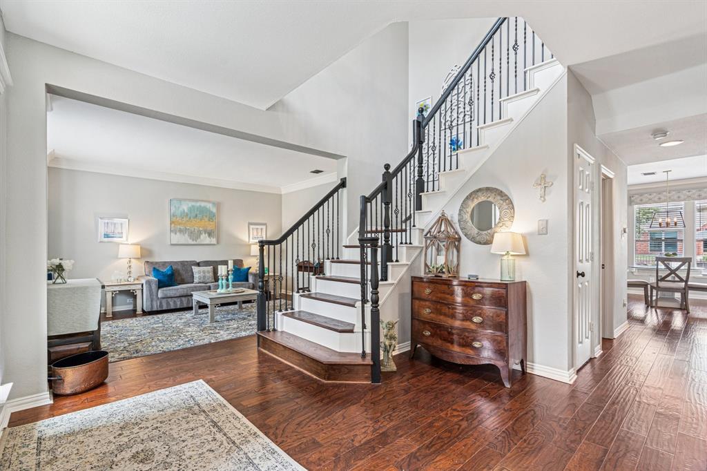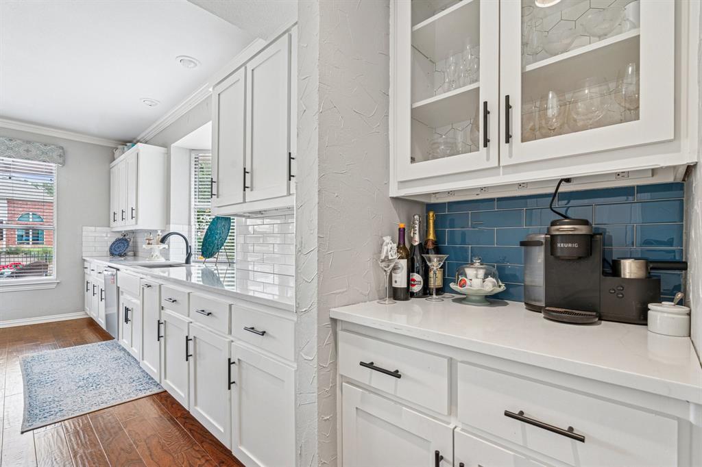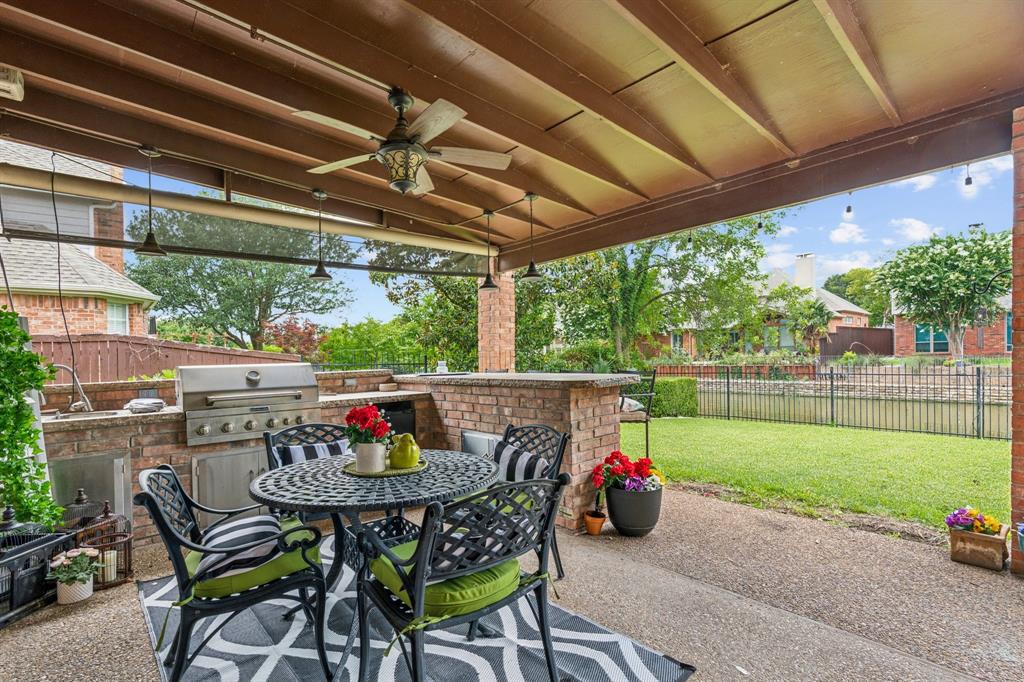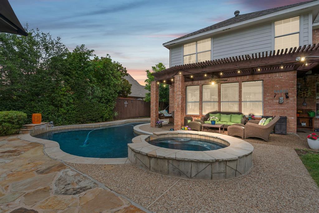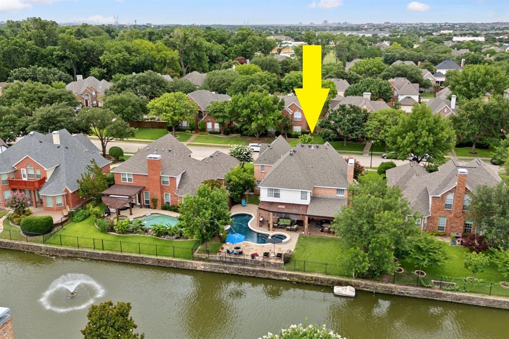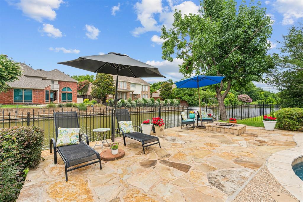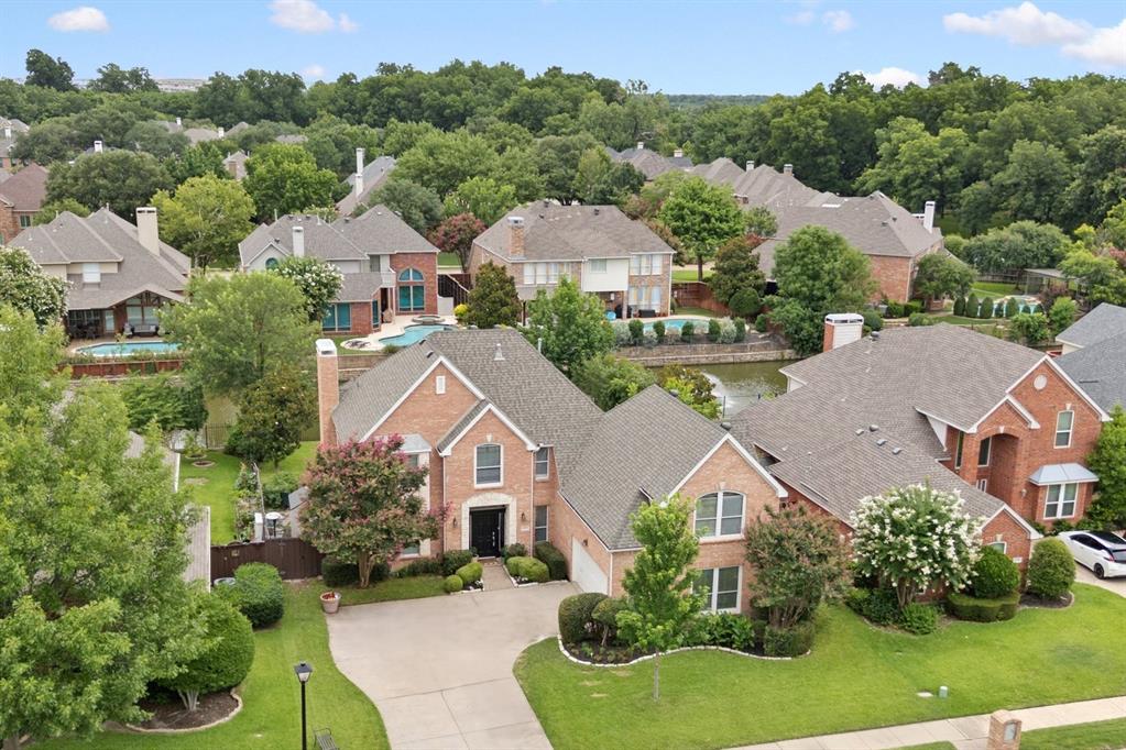 Welcome to 1032 Basilwood Drive — a stunning custom Coppell home perfectly situated on a tranquil canal with fountain views and a resort-style backyard. This rare 5-bedroom, 4-bathroom home features a desirable downstairs guest suite, elegant living spaces, and exceptional upgrades throughout. From the moment you step inside, you're greeted by wood floors, abundant natural light, and beautifully updated finishes. The completely remodeled kitchen is the heart of the home, showcasing Quartz countertops, stainless steel appliances, a deep farmhouse sink, under-cabinet lighting, hidden electrical outlets, and an island with bar seating. Adjacent to the kitchen is a bright breakfast area with a built-in work space and views to the backyard. Pass through elegant French doors into the family room featuring rows of windows with views of the canal and pool, a modernized gas fireplace and subtle recessed lighting. The spacious primary suite upstairs includes a spa-like bath with a jetted tub, walk-in shower with tiled niches, dual vanities, and a generous walk-in closet. Upstairs also includes three additional guest suites for friends and family. A massive upstairs flex room with vaulted ceilings provides space for a game room, gym, or dual home offices, and includes two built-in desks, built in entertainment system, a separate AC unit, and access to a 100 sq ft climate-controlled storage room. Step outside to your private retreat: a heated pool and spa, oversized firepit by the canal, and three separate seating areas including a covered patio with grill, fridge, sink, and roll-down sunshades. A beautiful arbor with ceiling fan and a large grassy yard complete the outdoor living experience. Enjoy this amazing neighborhood with walking paths along the canals and nearby Lakeside Elementary.