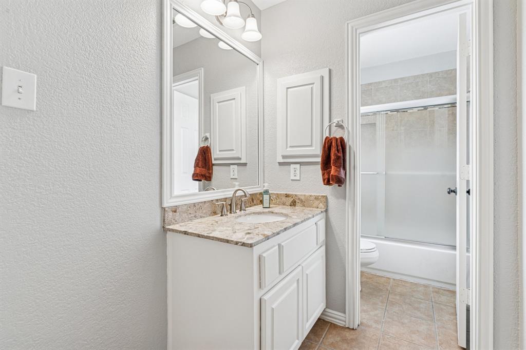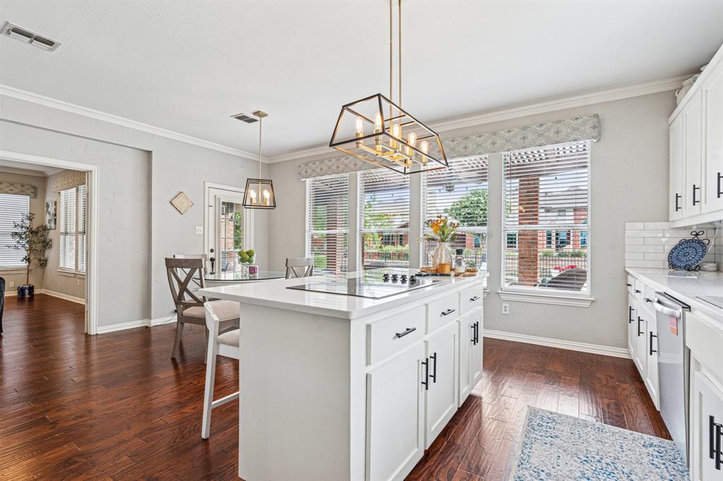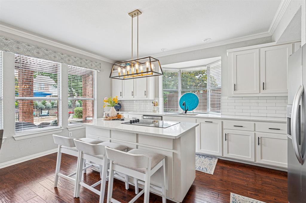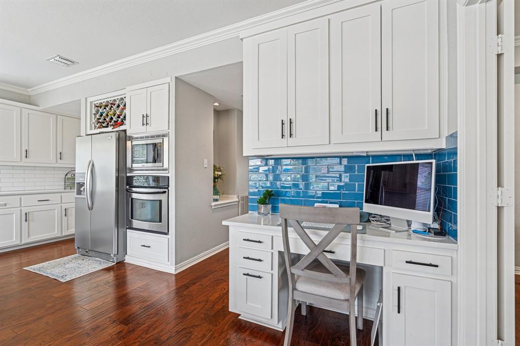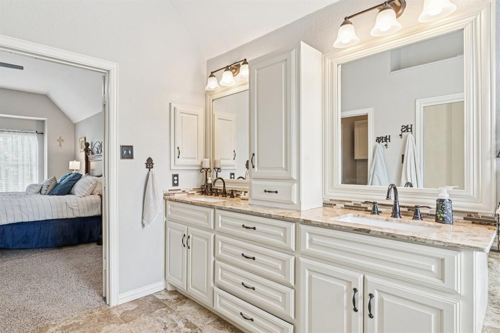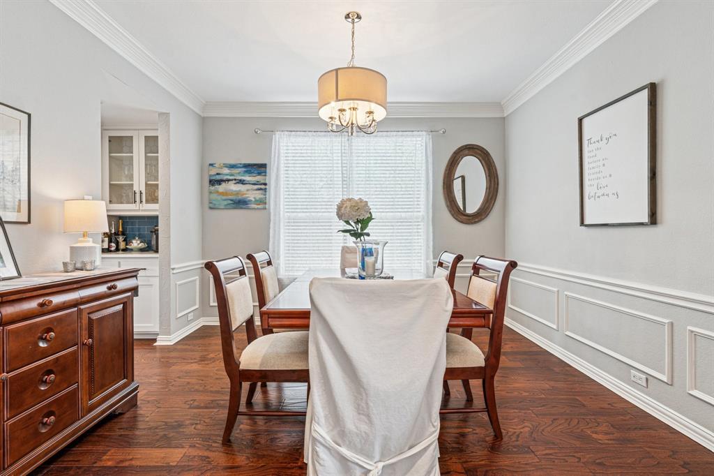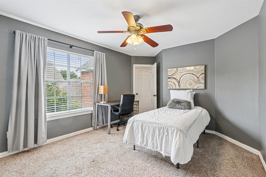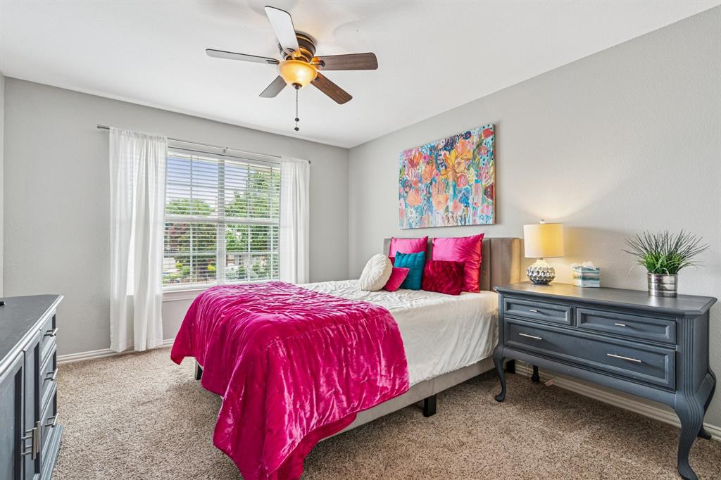 Welcome to 1032 Basilwood Drive — a stunning custom Coppell home perfectly situated on a tranquil canal with fountain views and a resort-style backyard. This rare 5-bedroom, 4-bathroom home features a desirable downstairs guest suite, elegant living spaces, and exceptional upgrades throughout. From the moment you step inside, you're greeted by wood floors, abundant natural light, and beautifully updated finishes. The completely remodeled kitchen is the heart of the home, showcasing Quartz countertops, stainless steel appliances, a deep farmhouse sink, under-cabinet lighting, hidden electrical outlets, and an island with bar seating. Adjacent to the kitchen is a bright breakfast area with a built-in work space and views to the backyard. Pass through elegant French doors into the family room featuring rows of windows with views of the canal and pool, a modernized gas fireplace and subtle recessed lighting. The spacious primary suite upstairs includes a spa-like bath with a jetted tub, walk-in shower with tiled niches, dual vanities, and a generous walk-in closet. Upstairs also includes three additional guest suites for friends and family. A massive upstairs flex room with vaulted ceilings provides space for a game room, gym, or dual home offices, and includes two built-in desks, built in entertainment system, a separate AC unit, and access to a 100 sq ft climate-controlled storage room. Step outside to your private retreat: a heated pool and spa, oversized firepit by the canal, and three separate seating areas including a covered patio with grill, fridge, sink, and roll-down sunshades. A beautiful arbor with ceiling fan and a large grassy yard complete the outdoor living experience. Enjoy this amazing neighborhood with walking paths along the canals and nearby Lakeside Elementary.