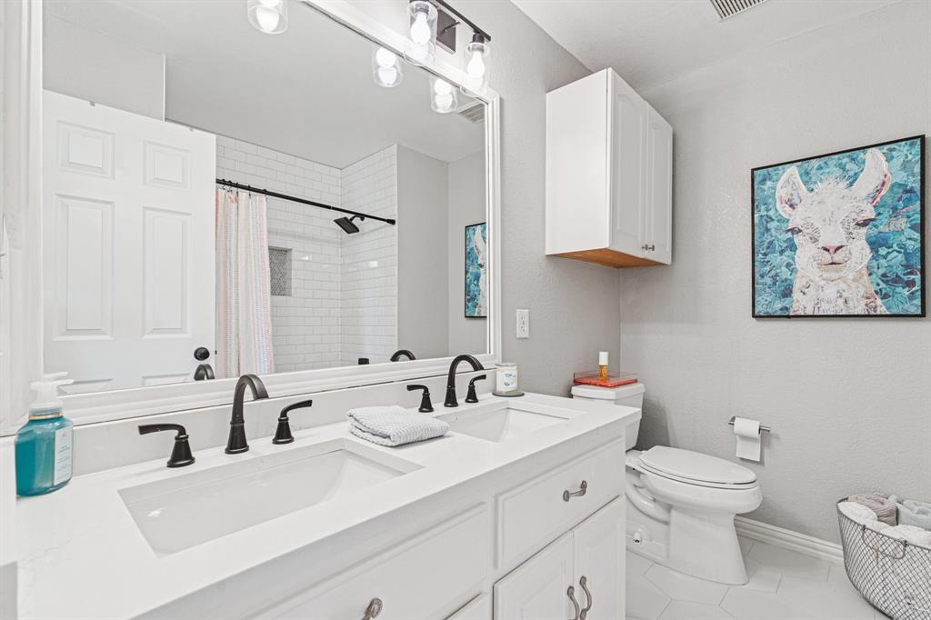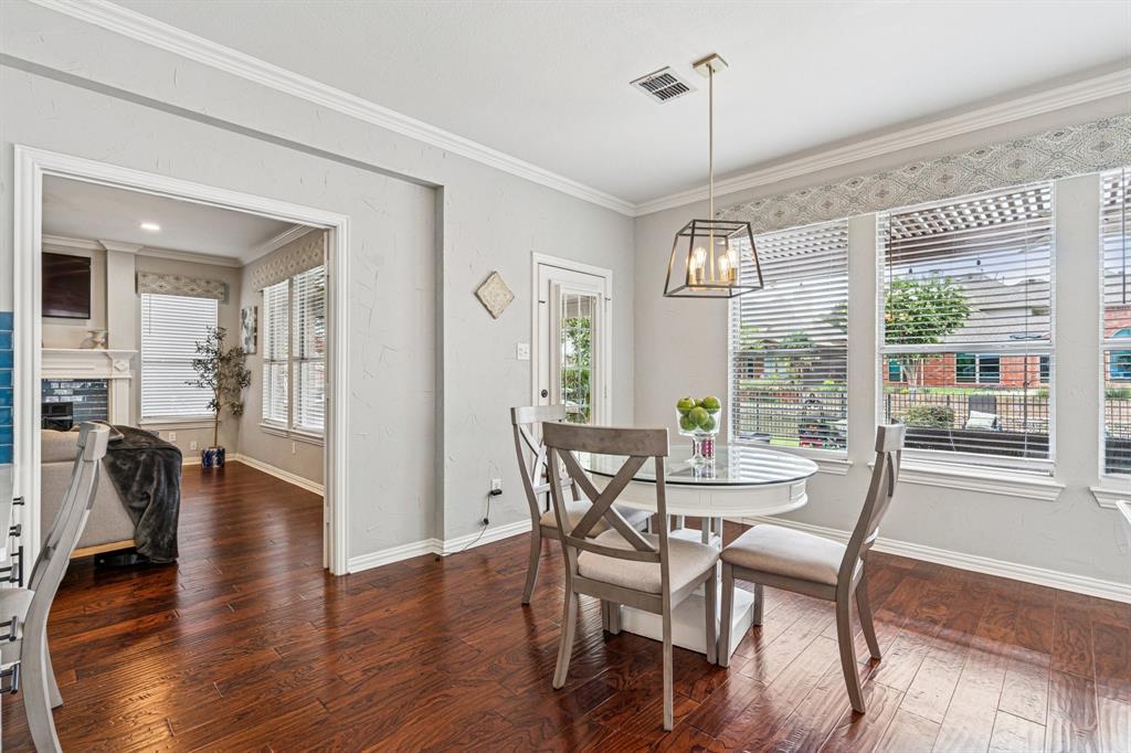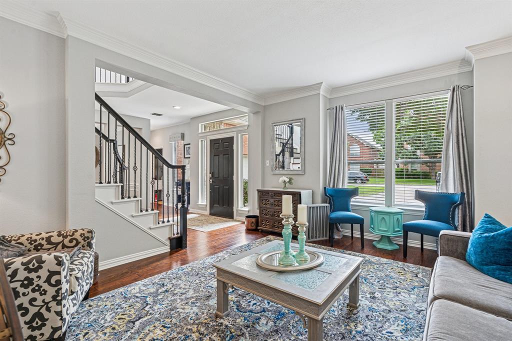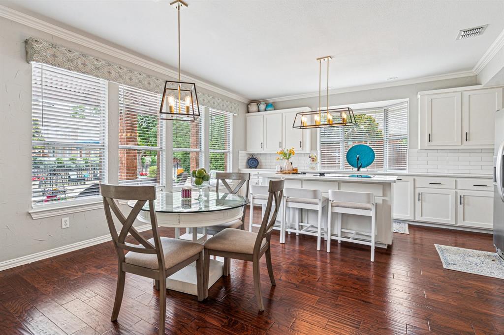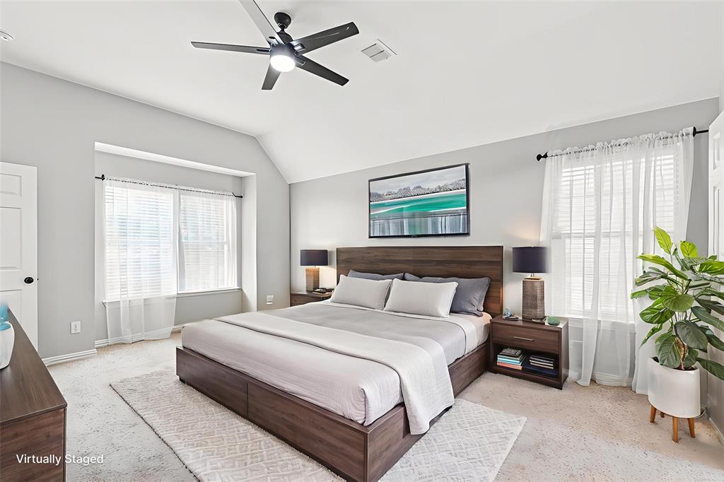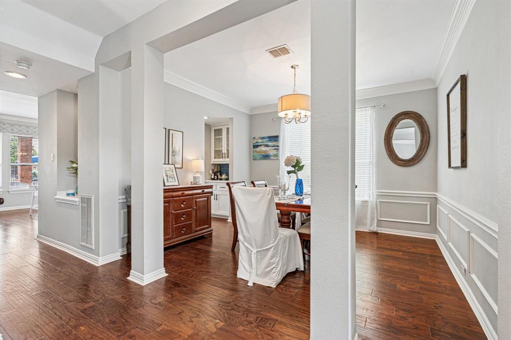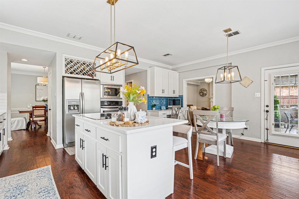 Welcome to 1032 Basilwood Drive — a stunning custom Coppell home perfectly situated on a tranquil canal with fountain views and a resort-style backyard. This rare 5-bedroom, 4-bathroom home features a desirable downstairs guest suite, elegant living spaces, and exceptional upgrades throughout. From the moment you step inside, you're greeted by wood floors, abundant natural light, and beautifully updated finishes. The completely remodeled kitchen is the heart of the home, showcasing Quartz countertops, stainless steel appliances, a deep farmhouse sink, under-cabinet lighting, hidden electrical outlets, and an island with bar seating. Adjacent to the kitchen is a bright breakfast area with a built-in work space and views to the backyard. Pass through elegant French doors into the family room featuring rows of windows with views of the canal and pool, a modernized gas fireplace and subtle recessed lighting. The spacious primary suite upstairs includes a spa-like bath with a jetted tub, walk-in shower with tiled niches, dual vanities, and a generous walk-in closet. Upstairs also includes three additional guest suites for friends and family. A massive upstairs flex room with vaulted ceilings provides space for a game room, gym, or dual home offices, and includes two built-in desks, built in entertainment system, a separate AC unit, and access to a 100 sq ft climate-controlled storage room. Step outside to your private retreat: a heated pool and spa, oversized firepit by the canal, and three separate seating areas including a covered patio with grill, fridge, sink, and roll-down sunshades. A beautiful arbor with ceiling fan and a large grassy yard complete the outdoor living experience. Enjoy this amazing neighborhood with walking paths along the canals and nearby Lakeside Elementary.