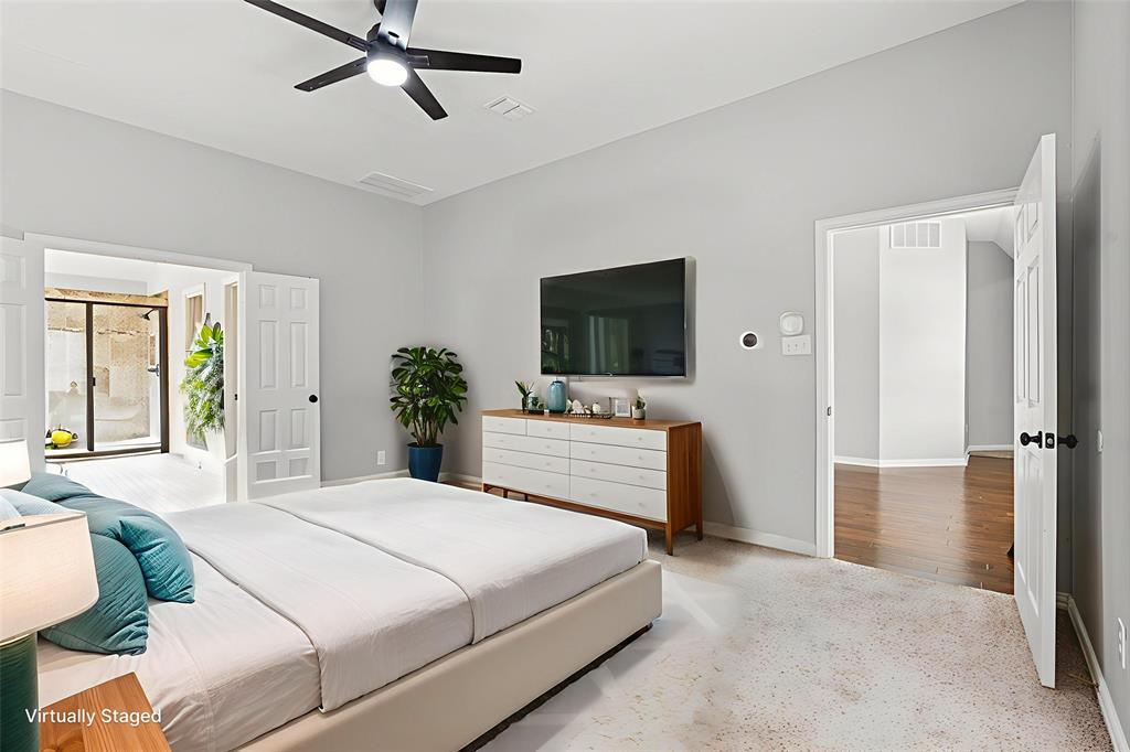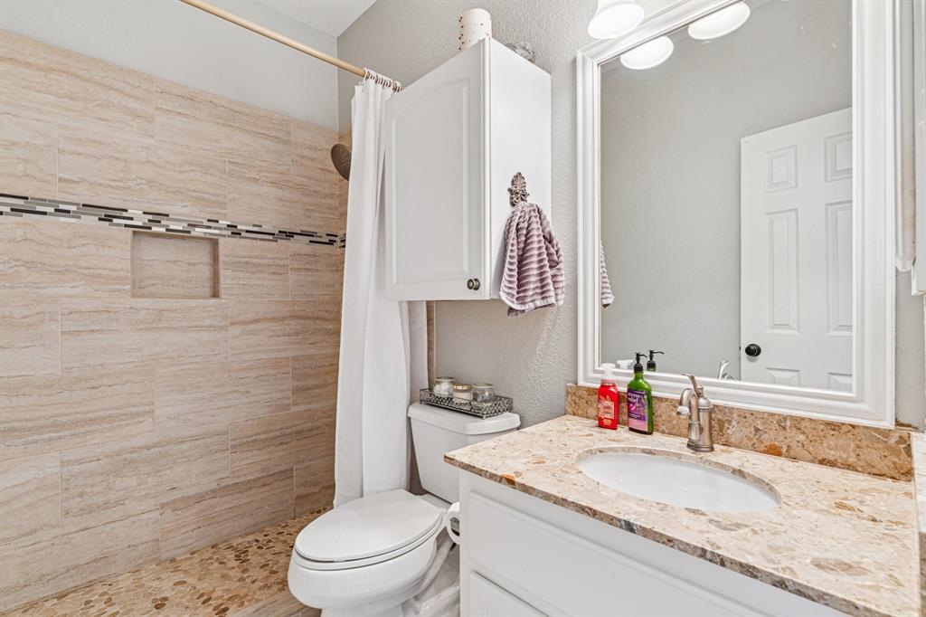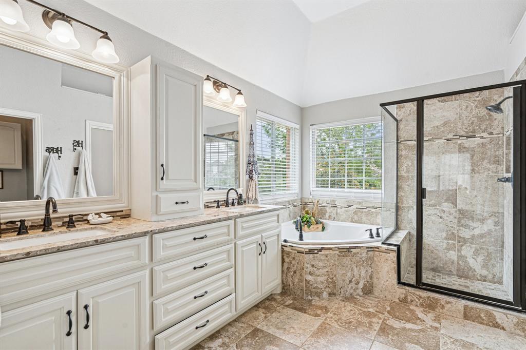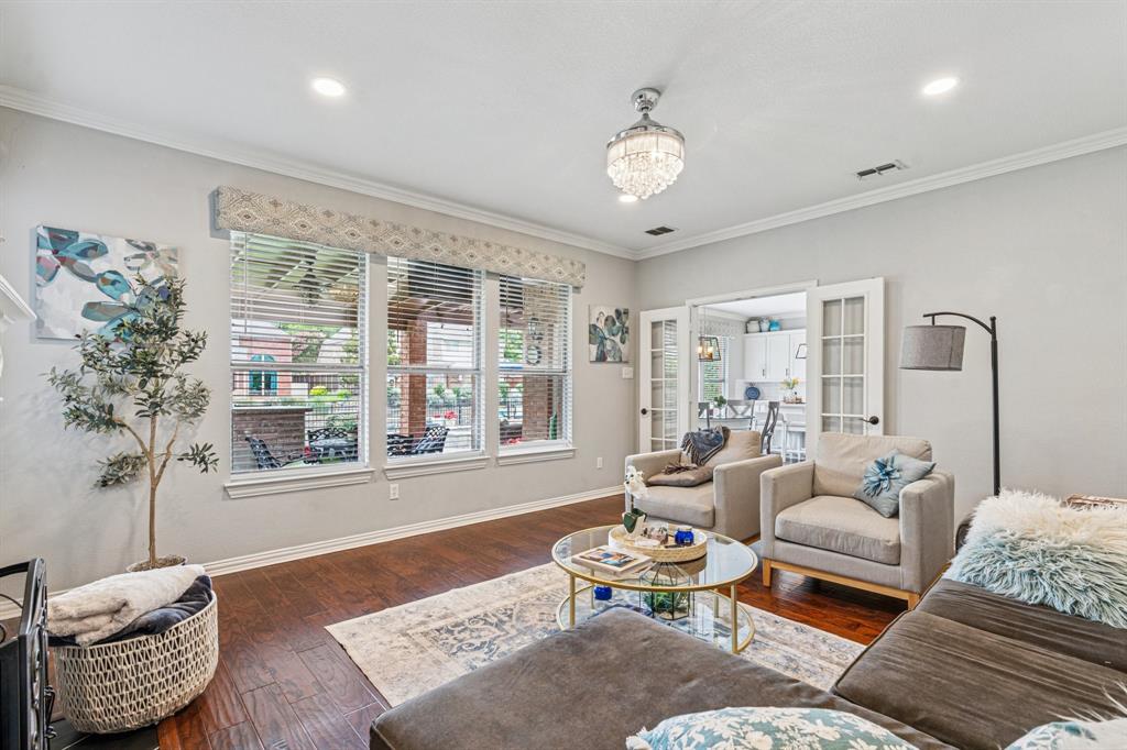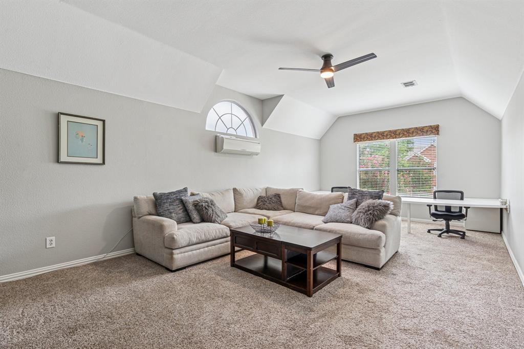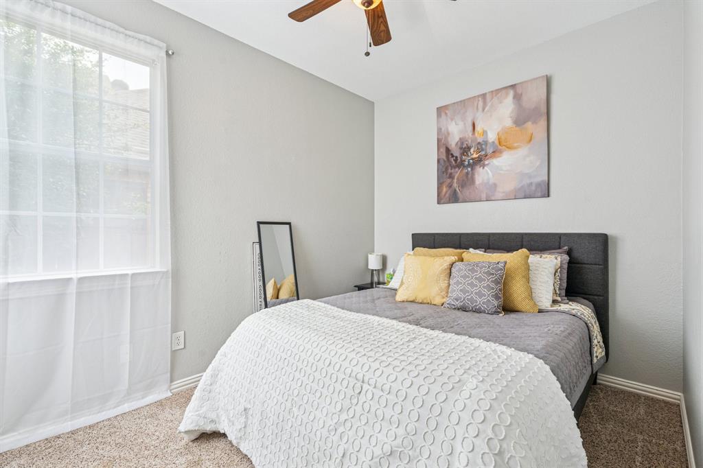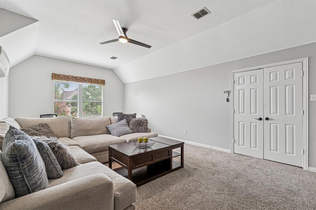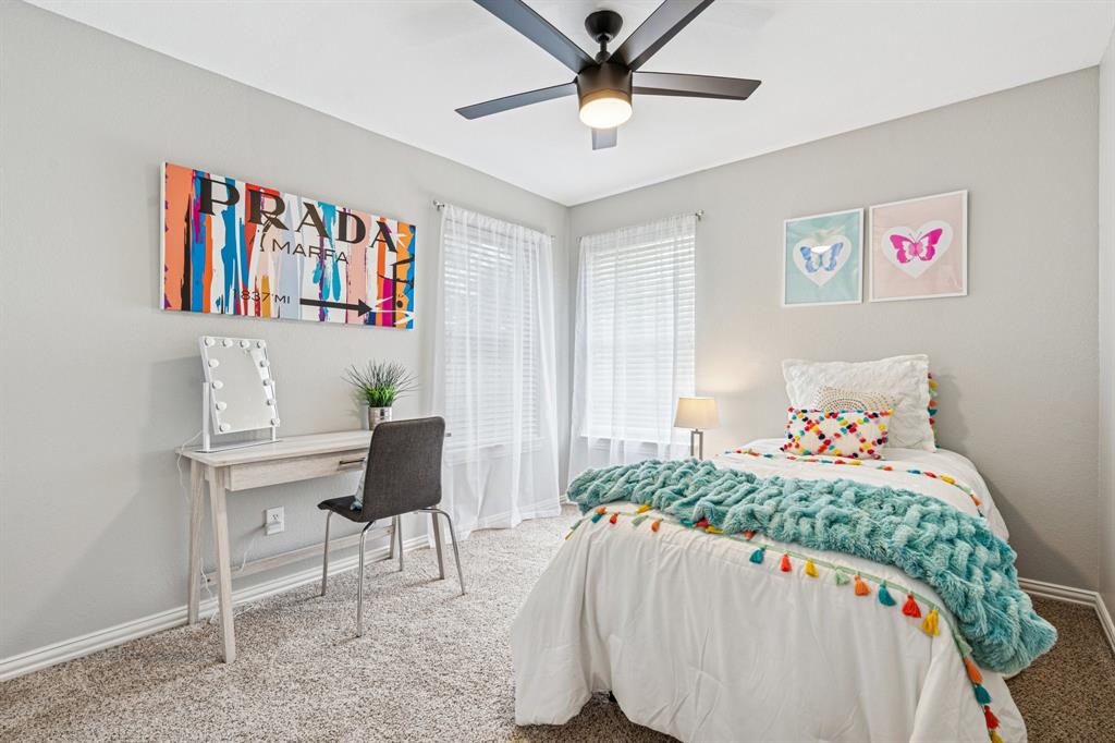 Welcome to 1032 Basilwood Drive — a stunning custom Coppell home perfectly situated on a tranquil canal with fountain views and a resort-style backyard. This rare 5-bedroom, 4-bathroom home features a desirable downstairs guest suite, elegant living spaces, and exceptional upgrades throughout. From the moment you step inside, you're greeted by wood floors, abundant natural light, and beautifully updated finishes. The completely remodeled kitchen is the heart of the home, showcasing Quartz countertops, stainless steel appliances, a deep farmhouse sink, under-cabinet lighting, hidden electrical outlets, and an island with bar seating. Adjacent to the kitchen is a bright breakfast area with a built-in work space and views to the backyard. Pass through elegant French doors into the family room featuring rows of windows with views of the canal and pool, a modernized gas fireplace and subtle recessed lighting. The spacious primary suite upstairs includes a spa-like bath with a jetted tub, walk-in shower with tiled niches, dual vanities, and a generous walk-in closet. Upstairs also includes three additional guest suites for friends and family. A massive upstairs flex room with vaulted ceilings provides space for a game room, gym, or dual home offices, and includes two built-in desks, built in entertainment system, a separate AC unit, and access to a 100 sq ft climate-controlled storage room. Step outside to your private retreat: a heated pool and spa, oversized firepit by the canal, and three separate seating areas including a covered patio with grill, fridge, sink, and roll-down sunshades. A beautiful arbor with ceiling fan and a large grassy yard complete the outdoor living experience. Enjoy this amazing neighborhood with walking paths along the canals and nearby Lakeside Elementary.
