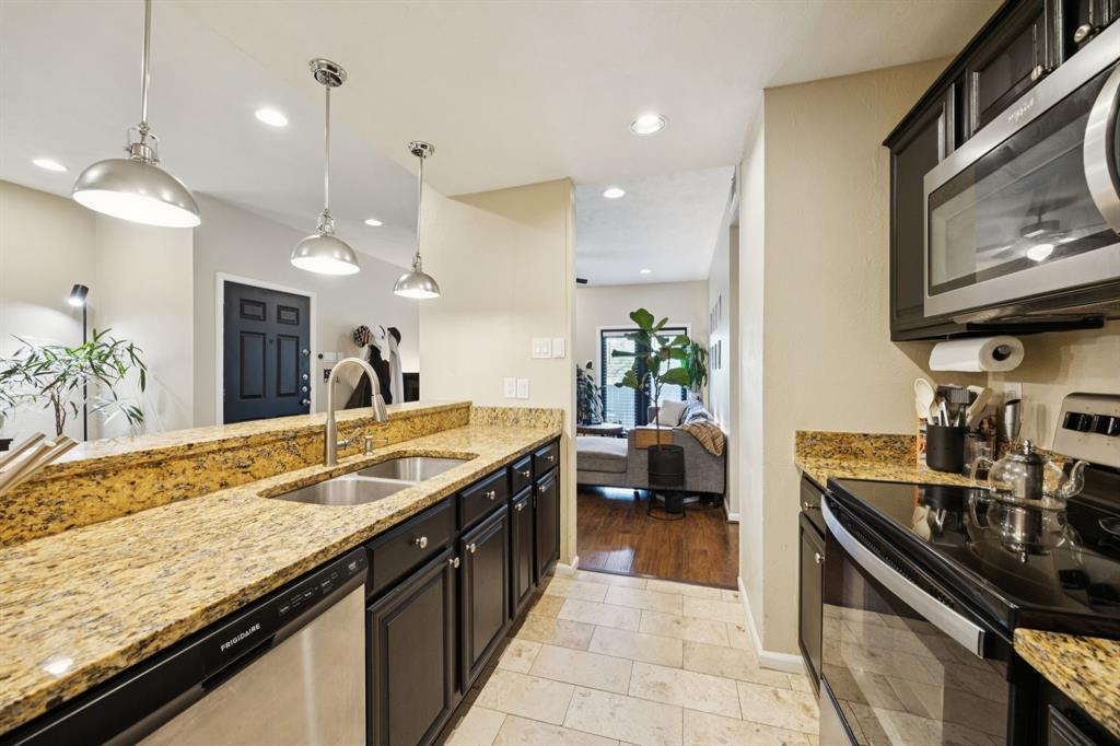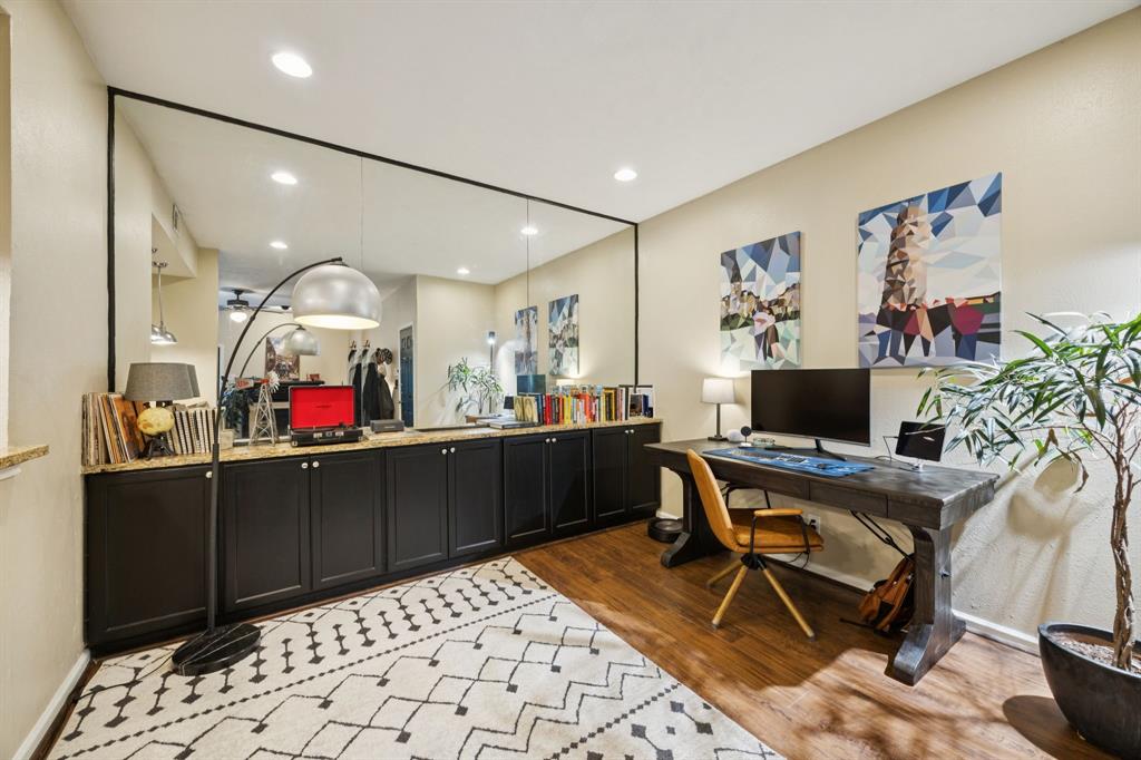 The kitchen boasts sleek black cabinetry, granite countertops, and stainless steel appliances, along with a breakfast bar and pendant lighting for casual dining or entertaining. Just off the kitchen is a bonus flex space with built-in cabinetry and a mirrored wall, perfect for a home office, creative nook, or formal dining area.