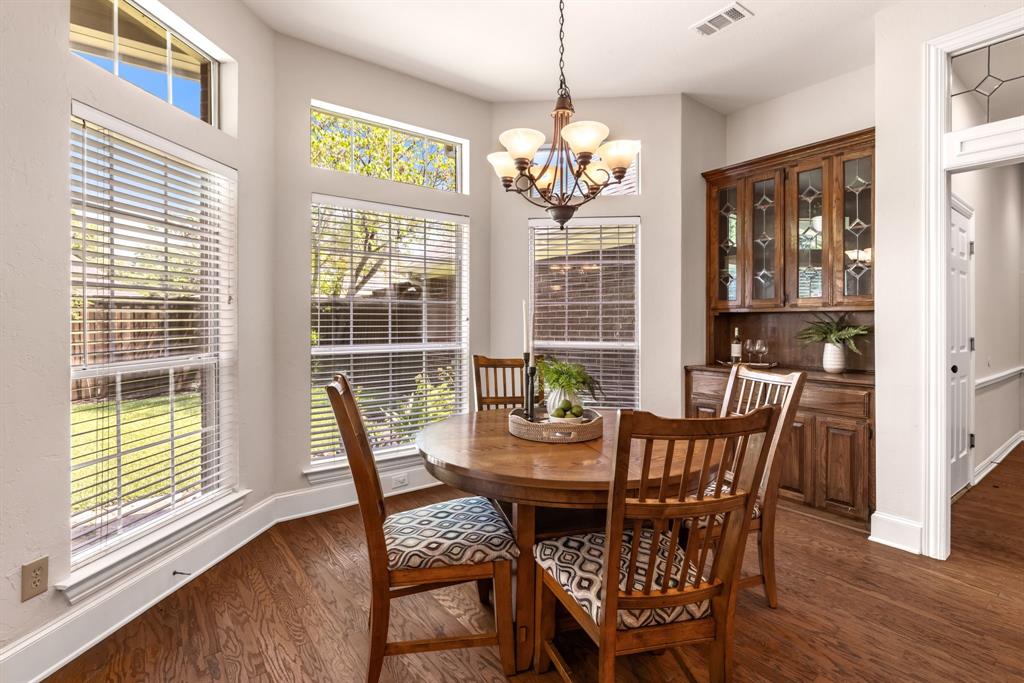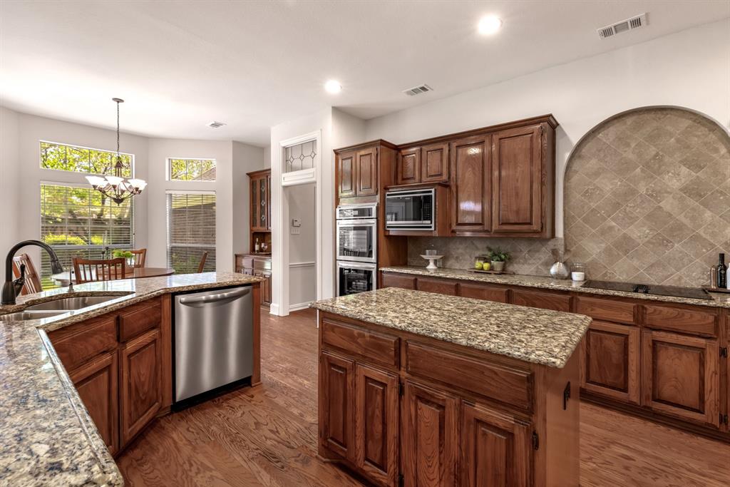 If you've been waiting for an opportunity to put down roots in highly sought after Deerfield at the very BEST neighborhood price...here it is! Same Floorplan just sold for $240,000 MORE! Tucked away on a quiet cul-de-sac and shaded by mature oaks, this immaculate home offers classic traditional charm and a modern open floorplan! Step inside to a bright, two-story foyer with soaring ceilings and a lovely winding staircase that is sure to impress. Split formals include an elegant Dining Room with hardwood floors; plantation shutters and built-in wine chiller and the formal Living makes the perfect STUDY! The open family room is filled with natural light and features a raised brick hearth fireplace flanked by built-in bookshelves and media center and new carpet replaced in 2025. The Family Room is open to the BIG island kitchen with ample granite countertops, stainless steel Frigidaire Gallery series appliances including double ovens! The family chef will love the HUGE walk-in pantry, and the tea drinkers will adore the instant hot water dispenser! The cooking area is plumbed for gas. A bay window Breakfast Nook features a built-in hutch and offers views of the private backyard + garden brimming with hydrangeas! Owner's Suite is truly private on the first level and features elegant bay window sitting area with plantation shutters, HUGE walk -in closet and oversized bath with double walk-in shower! Upstairs you’ll find three generously sized bedrooms, all will easily fit king-sized beds, two full baths + BIG Game Room with walk-in closet perfect for your large LEGO collection, books + games galore! Deerfield's IDEAL DREAM LOCATION allows children to walk to Grades K-10 of Plano West's best rated schools, Lifetime Fitness + indoor Tennis. Working at Legacy West? Your commute will be under 10 minutes and when you aren't working, you'll enjoy being a short drive to Legacy West's best Dining, Shopping+Entertainment.
