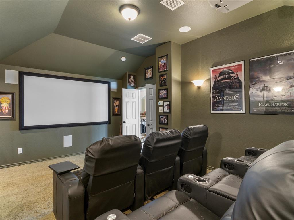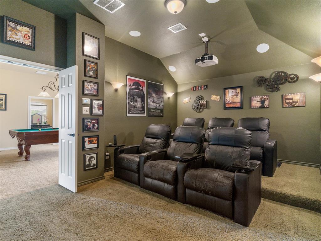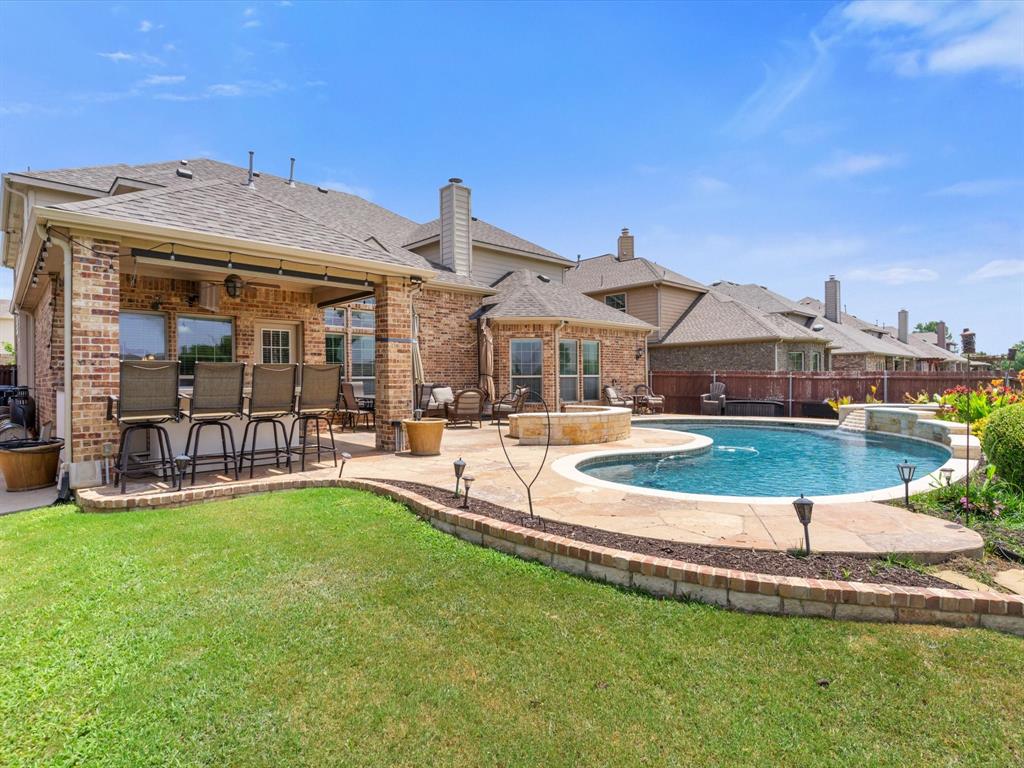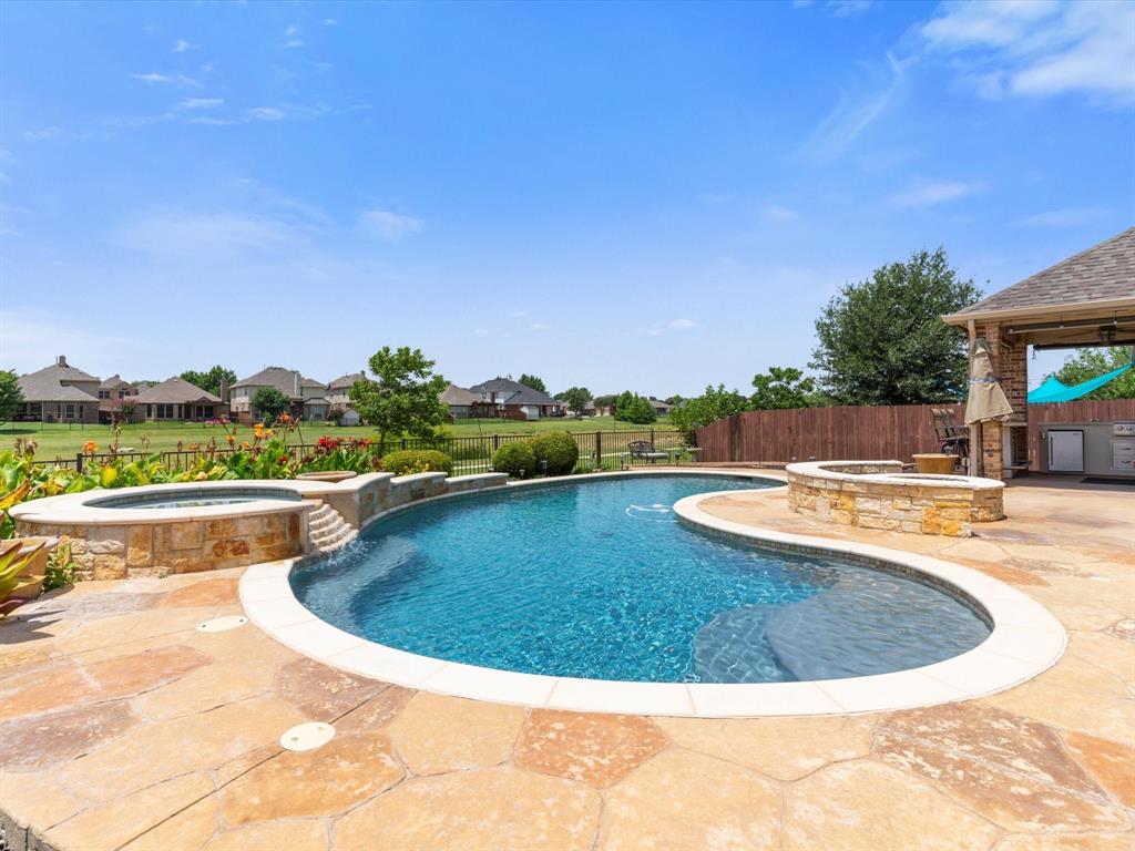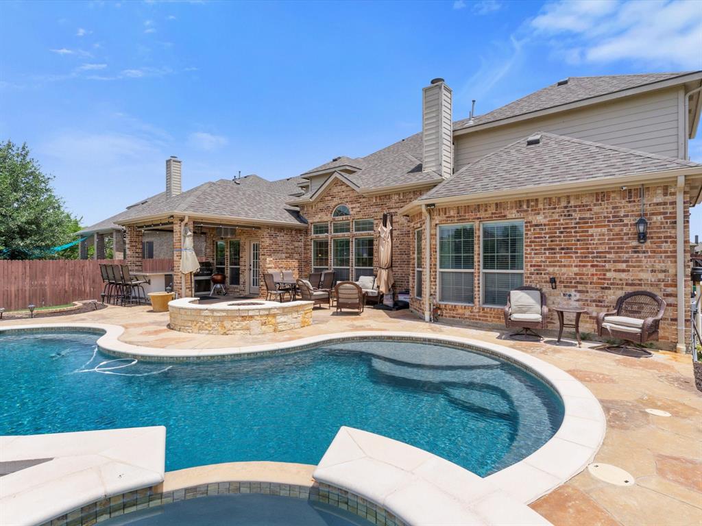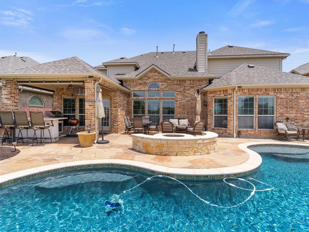 This beautifully maintained 5 bedroom, 4 bathroom home offers the perfect blend of luxury, functionality, and style. Nestled on a premium lot backing to a scenic community greenbelt with a peaceful pond and fountain, this property delivers unmatched views and privacy. Step inside to soaring ceilings, rich hardwood floors, elegant wainscoting, and an open concept layout flooded with natural light. The heart of the home features a chef’s kitchen with solid wood cabinetry, double ovens, a gas cooktop, and a spacious butler’s pantry perfect for entertaining. The formal dining room and dedicated office provide both sophistication and practicality. The upstairs media room is a true cinematic experience with 7.1 surround sound, stadium seating, and a mini kitchen for movie night snacks. The game room features built-in desks and custom cabinetry ideal for homework or hobbies. Retreat outdoors to your private oasis complete with a covered patio, full outdoor kitchen, sparkling swimming pool, hot tub, cozy fire pit, and lush landscaping all overlooking the tranquil greenbelt. Additional highlights include spacious walk in closets throughout, 3 car garage with a large tornado shelter, tankless gas water heaters, built-in sound system, and beautiful architectural details throughout. This home is a rare find with room for everyone and every occasion. Come experience the perfect balance of everyday comfort and elevated living! Youtube 2832 Stackhouse for a full video walkthrough.