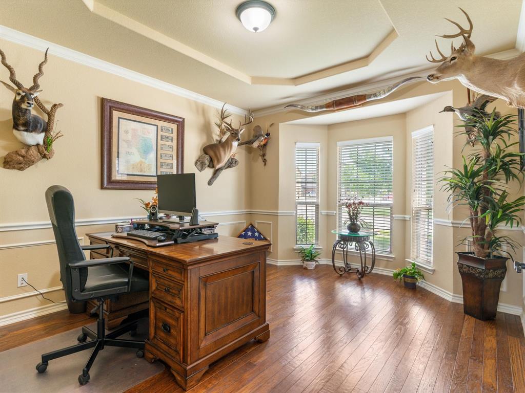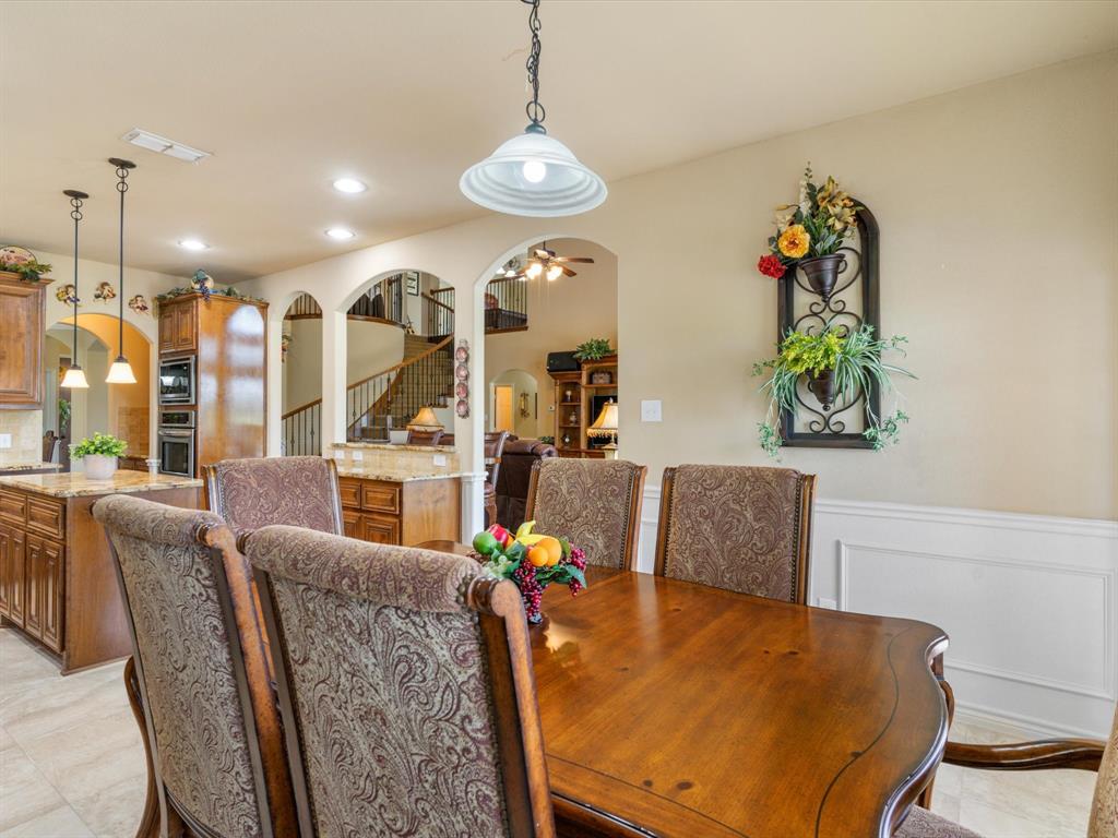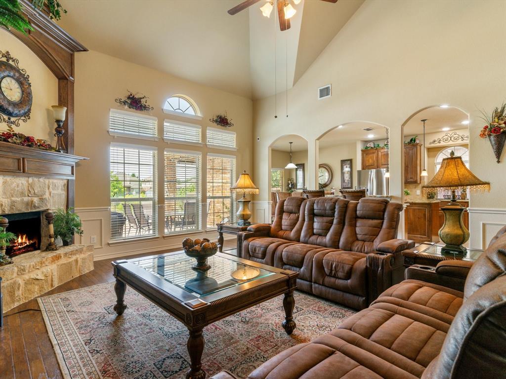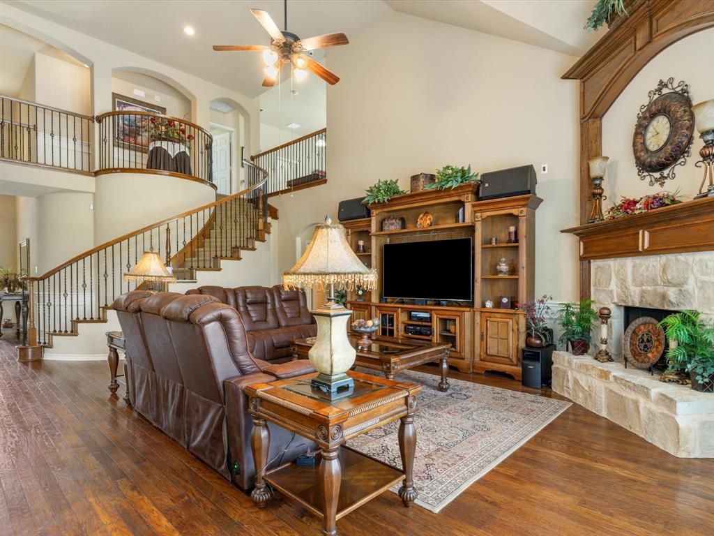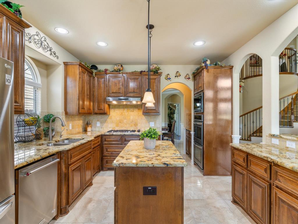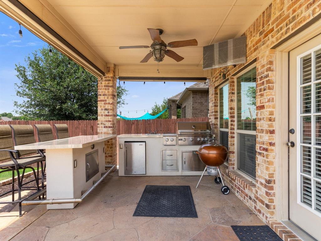 This beautifully maintained 5 bedroom, 4 bathroom home offers the perfect blend of luxury, functionality, and style. Nestled on a premium lot backing to a scenic community greenbelt with a peaceful pond and fountain, this property delivers unmatched views and privacy. Step inside to soaring ceilings, rich hardwood floors, elegant wainscoting, and an open concept layout flooded with natural light. The heart of the home features a chef’s kitchen with solid wood cabinetry, double ovens, a gas cooktop, and a spacious butler’s pantry perfect for entertaining. The formal dining room and dedicated office provide both sophistication and practicality. The upstairs media room is a true cinematic experience with 7.1 surround sound, stadium seating, and a mini kitchen for movie night snacks. The game room features built-in desks and custom cabinetry ideal for homework or hobbies. Retreat outdoors to your private oasis complete with a covered patio, full outdoor kitchen, sparkling swimming pool, hot tub, cozy fire pit, and lush landscaping all overlooking the tranquil greenbelt. Additional highlights include spacious walk in closets throughout, 3 car garage with a large tornado shelter, tankless gas water heaters, built-in sound system, and beautiful architectural details throughout. This home is a rare find with room for everyone and every occasion. Come experience the perfect balance of everyday comfort and elevated living! Youtube 2832 Stackhouse for a full video walkthrough.