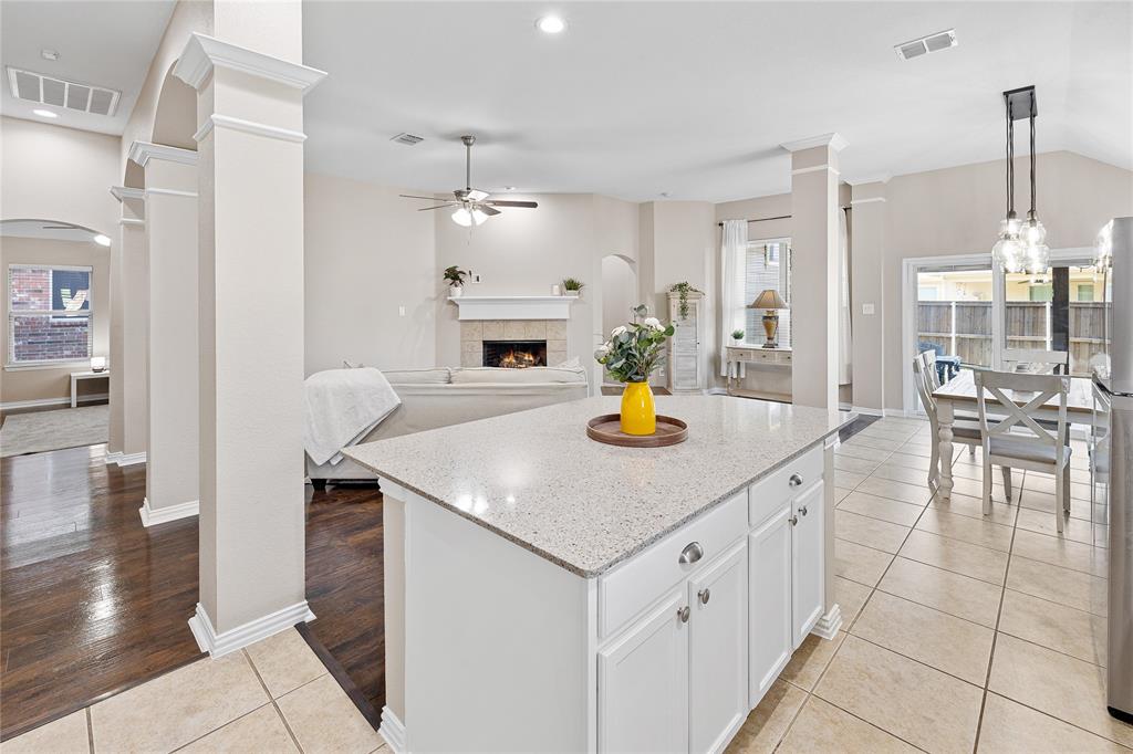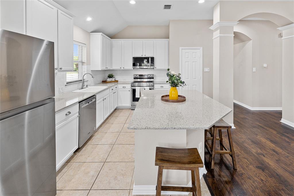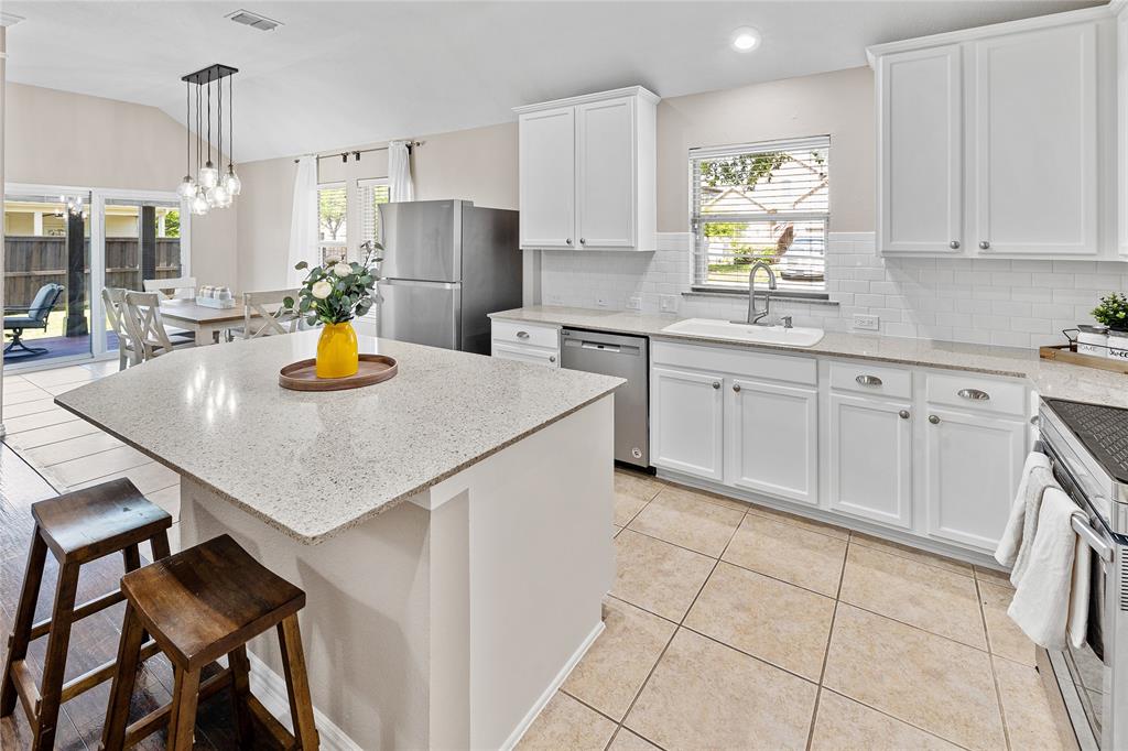 Step into a chef’s dream kitchen, featuring gleaming granite countertops, a spacious center island, premium stainless steel appliances, a smart sink, and sophisticated new fixtures. The open-concept layout flows seamlessly into the expansive living area and sunlit breakfast room, highlighted by an exquisite designer light fixture that adds a touch of brilliance to every morning.
