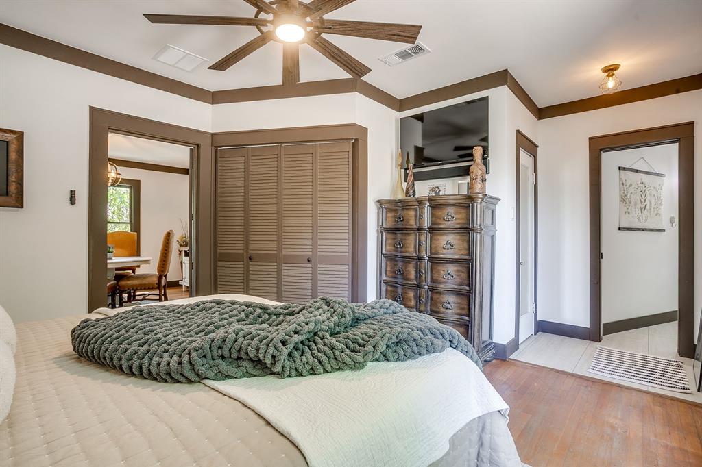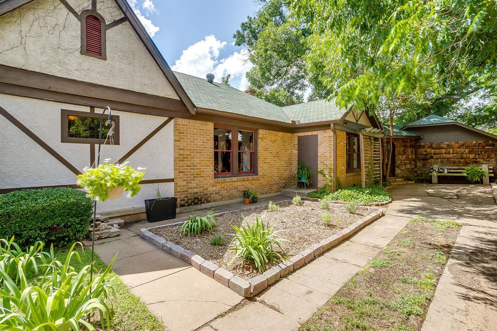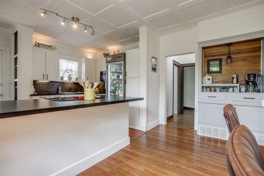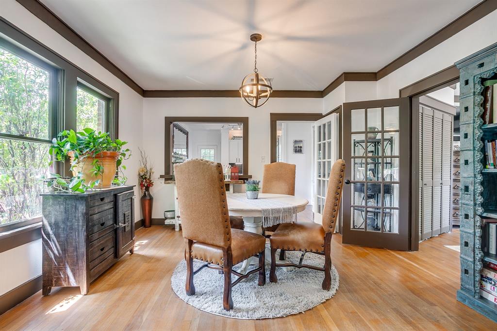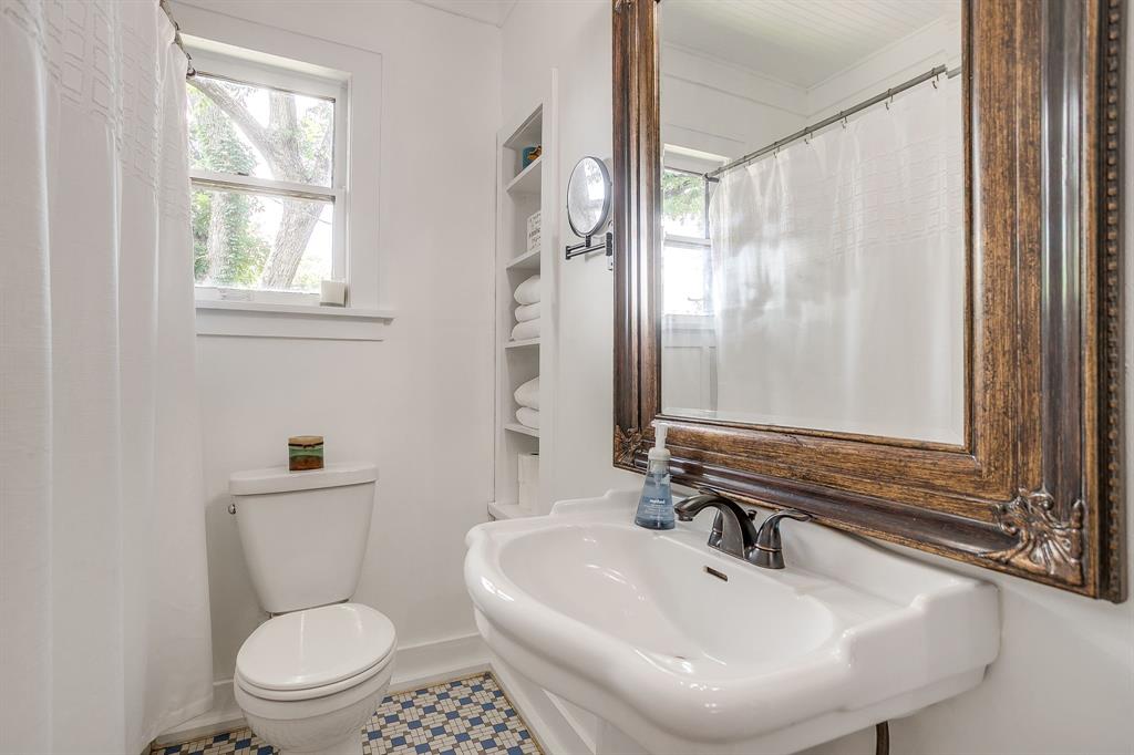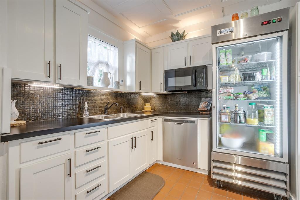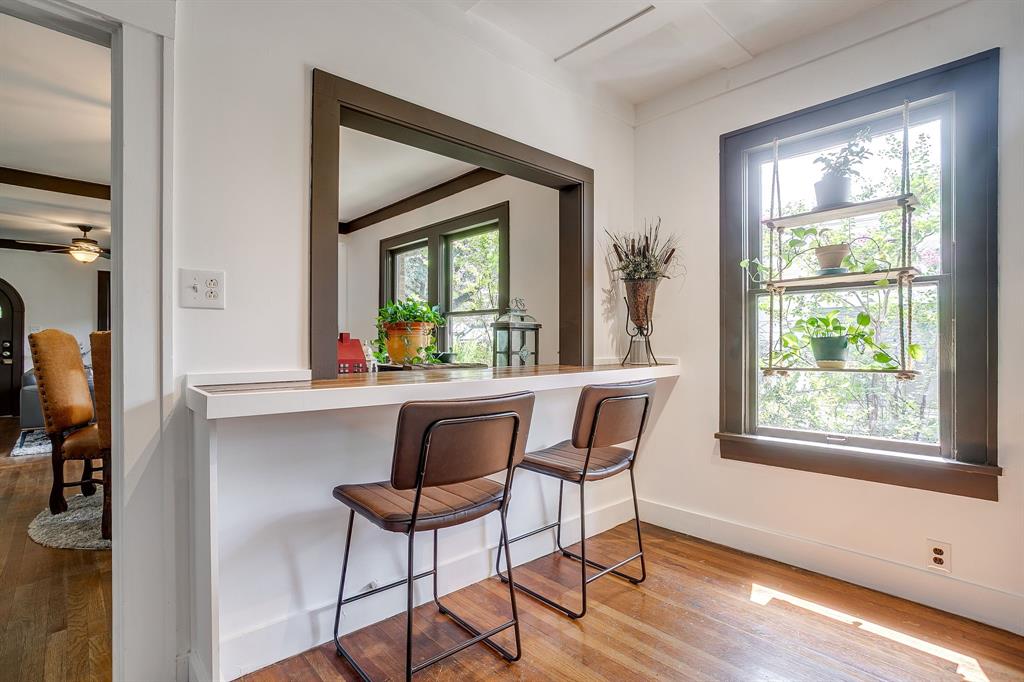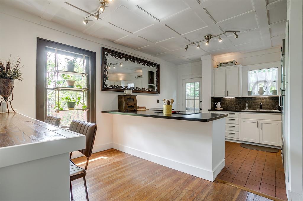 From the arched doors to the whimsical green shingle roof and window awnings, every detail speaks of craftsmanship and character. The owners thoughtfully expanded the home with an additional bedroom and bath, carefully sourcing reclaimed wood so the original hardwood floors flow seamlessly throughout.