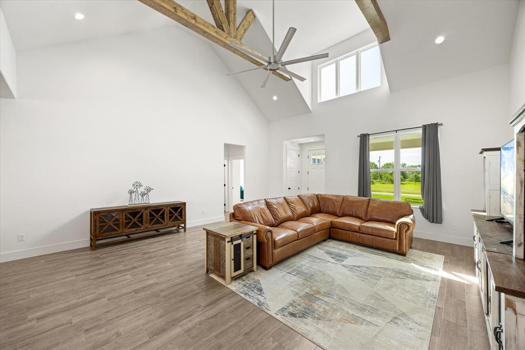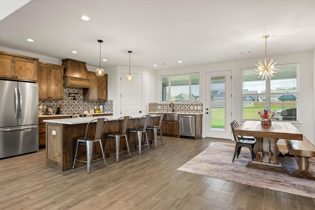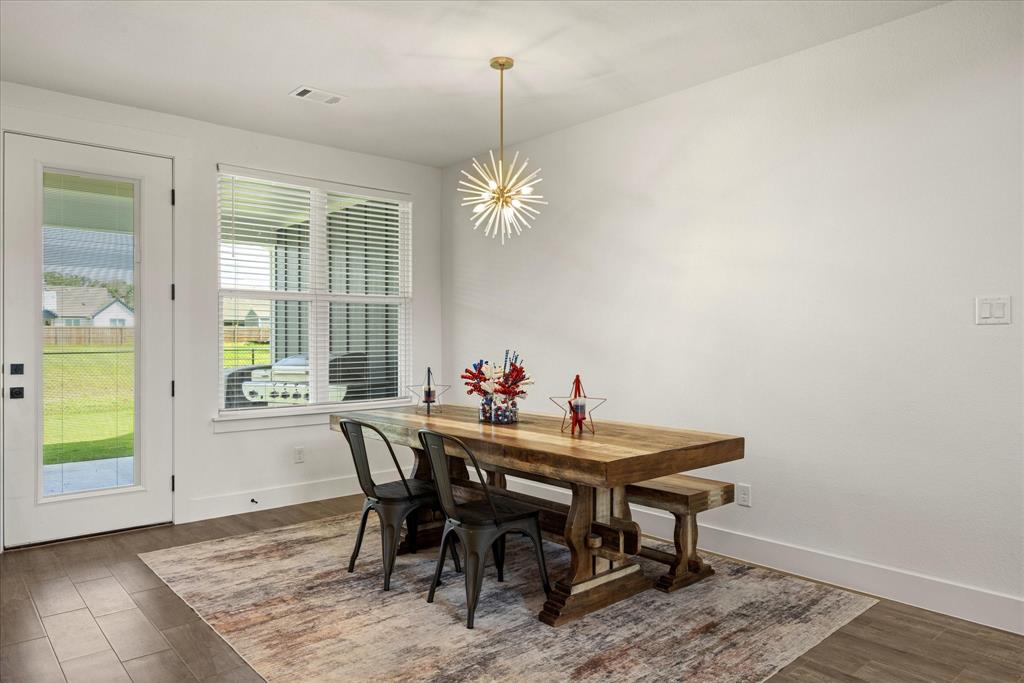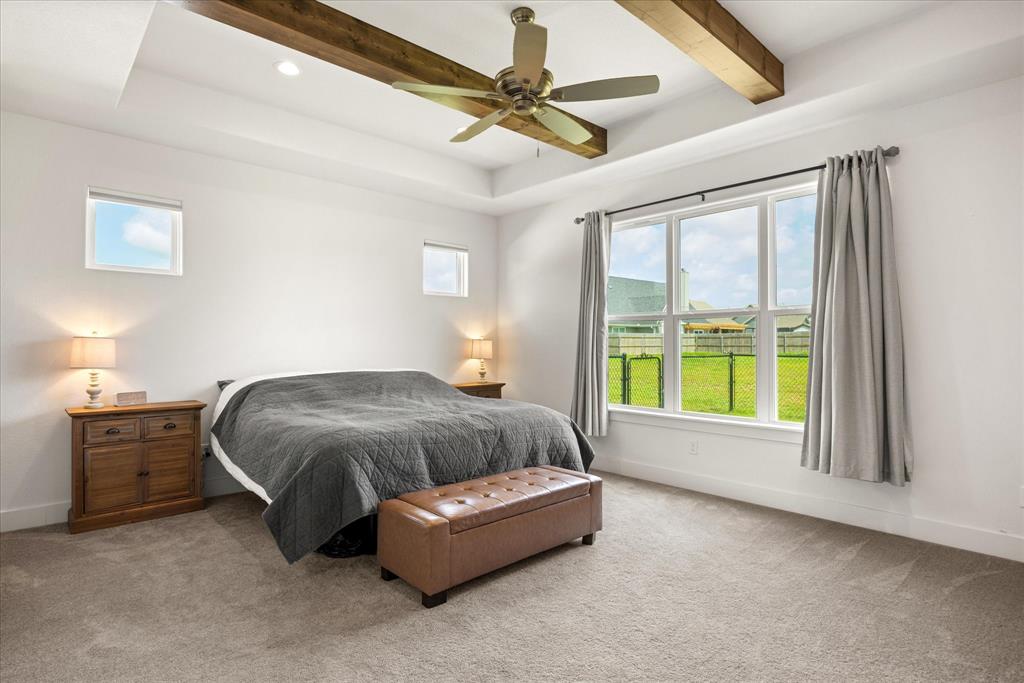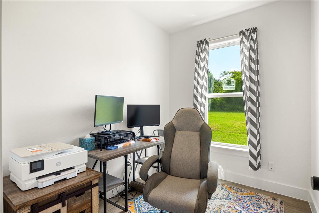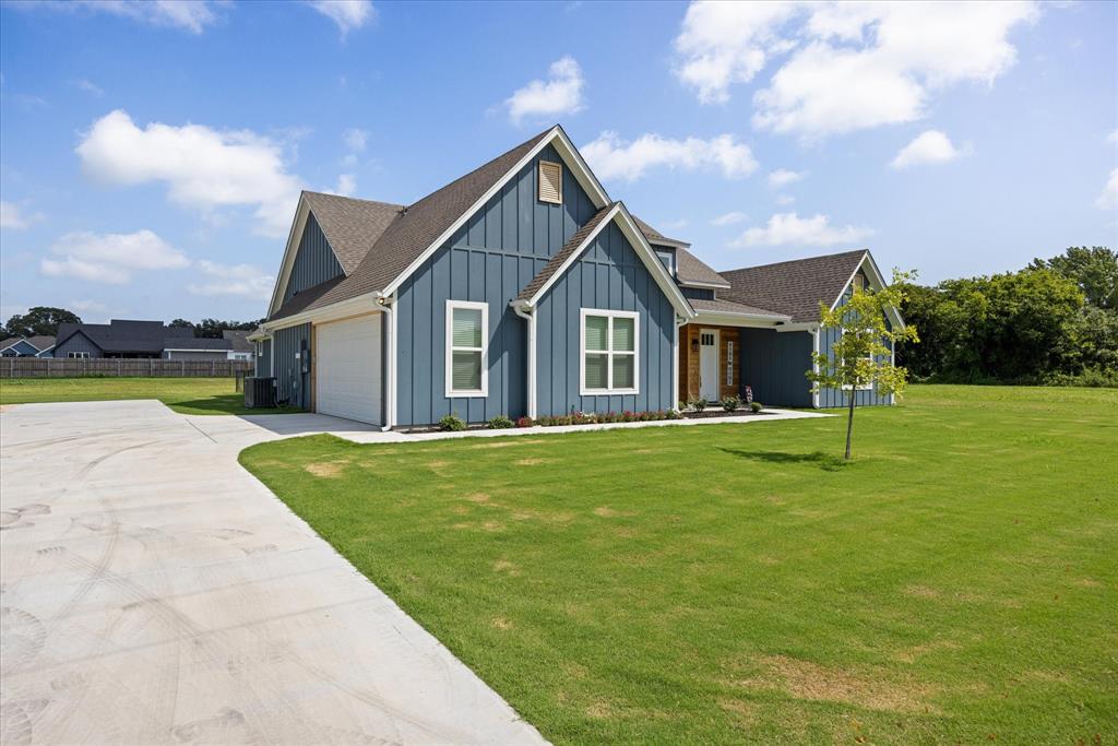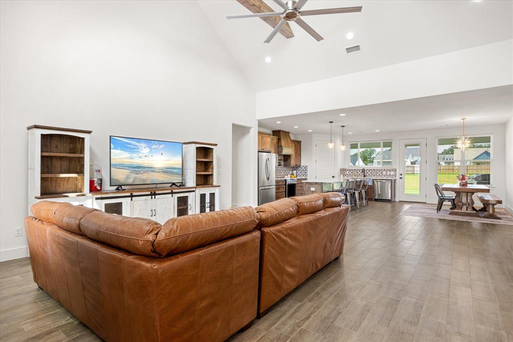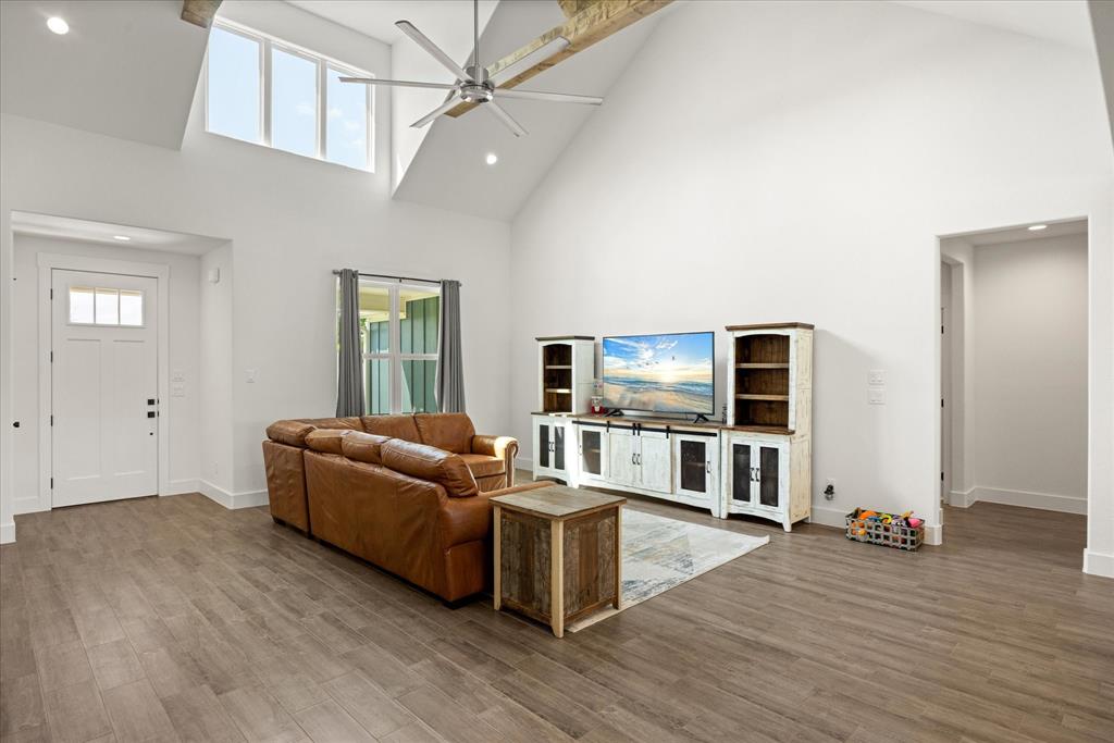 Don’t miss the opportunity to own this stunning home that perfectly blends modern open-concept living with timeless exterior charm, all set on a spacious .847-acre lot. The exterior features a large front porch, covered back patio, and partial fencing—ideal for enjoying outdoor living in comfort and privacy. The thoughtfully designed single-story layout offers a generous living area with a striking vaulted ceiling and exposed beams, creating a warm and inviting atmosphere. The kitchen is a chef’s dream, complete with quartz countertops, a breakfast bar, stainless steel appliances, pot filler, walk-in pantry, built-in microwave, and a sleek vent hood. The split floor plan includes four spacious bedrooms, two and a half bathrooms, a dedicated office, full-size walk through laundry room, mud room and ample storage throughout. Interior finishes include ceramic tile and carpet flooring, decorative lighting, ceiling fans, and central heating and air via an energy-efficient electric heat pump. High-speed internet and cable TV are also available. Located in a quiet, friendly small-town setting, the property benefits from the adjacent vacant lot owned by the City of Tolar—with no current plans for development—providing the homeowner with added privacy and a sense of open space. All this with the added convenience of nearby Granbury amenities just minutes away. French door refrigerator, clothes washing machine and dryer will convey. Sellers are having to move closer to elderly parents to assist them. Hurry and make this great property yours. Chain link fence is for dogs. THE PROPERTY IS is .847 ACRES AND GOES TO THE BACK WOOD FENCE BEHIND HOME. SURVEY IS ONLINE SO ASK YOUR AGENT FOR A COPY. NO HOA! Plenty of room for a shop, pool and playsets.