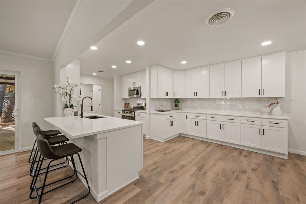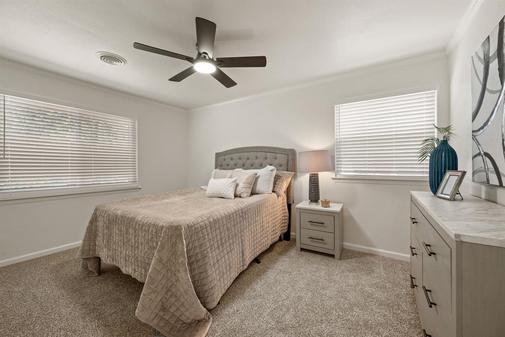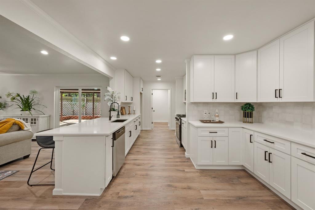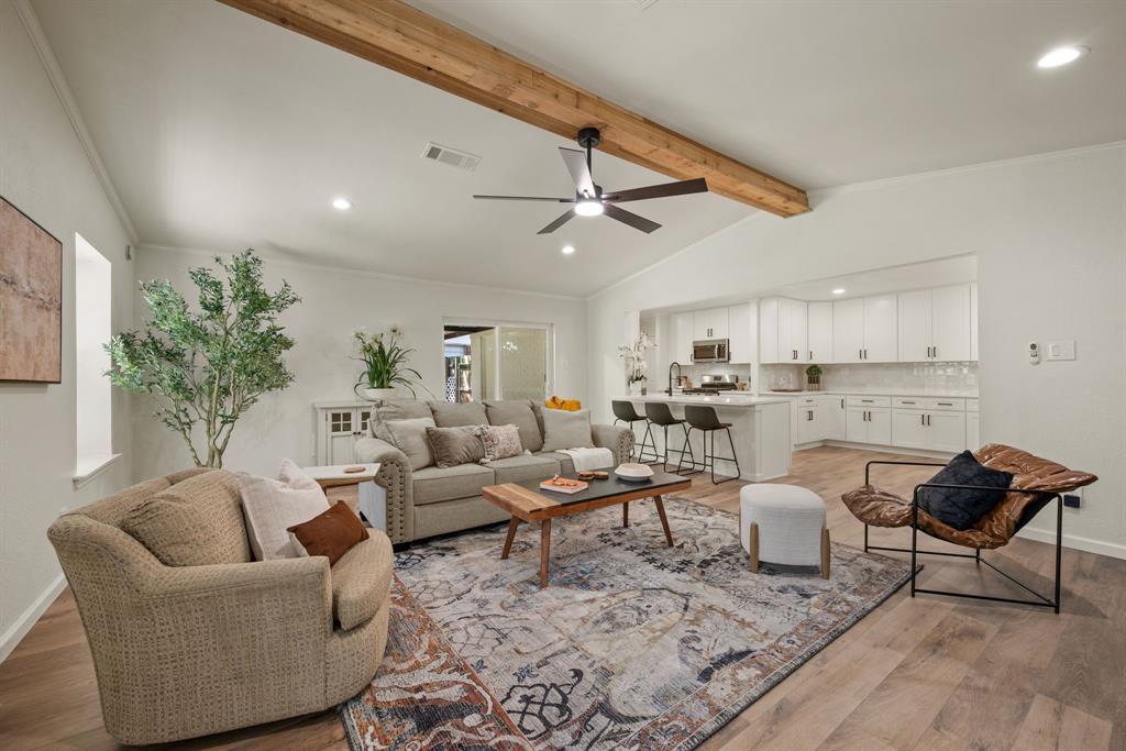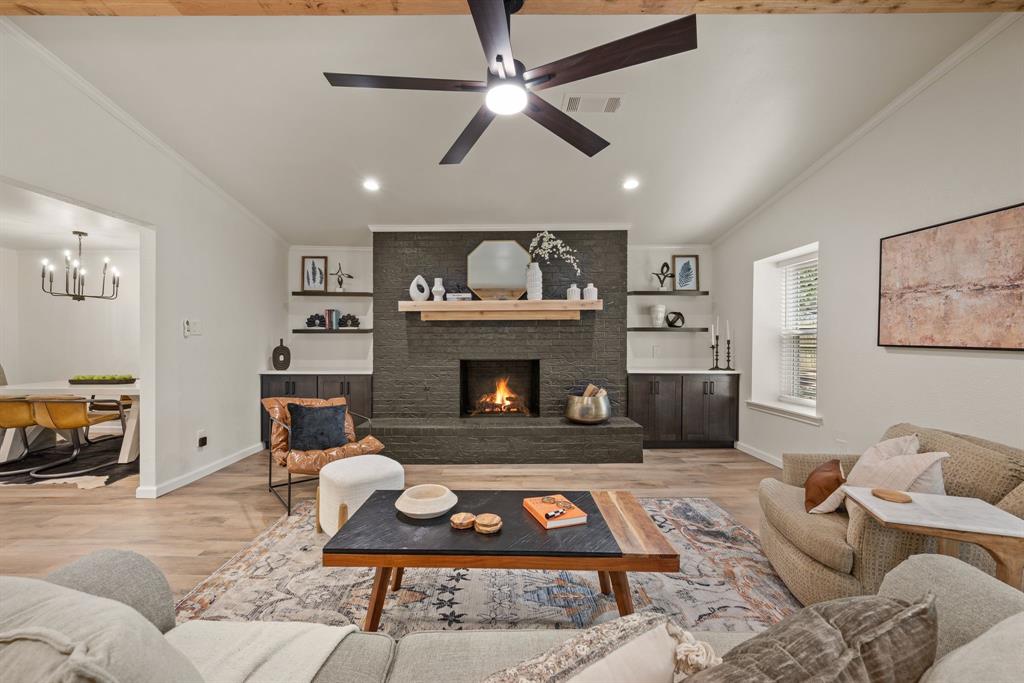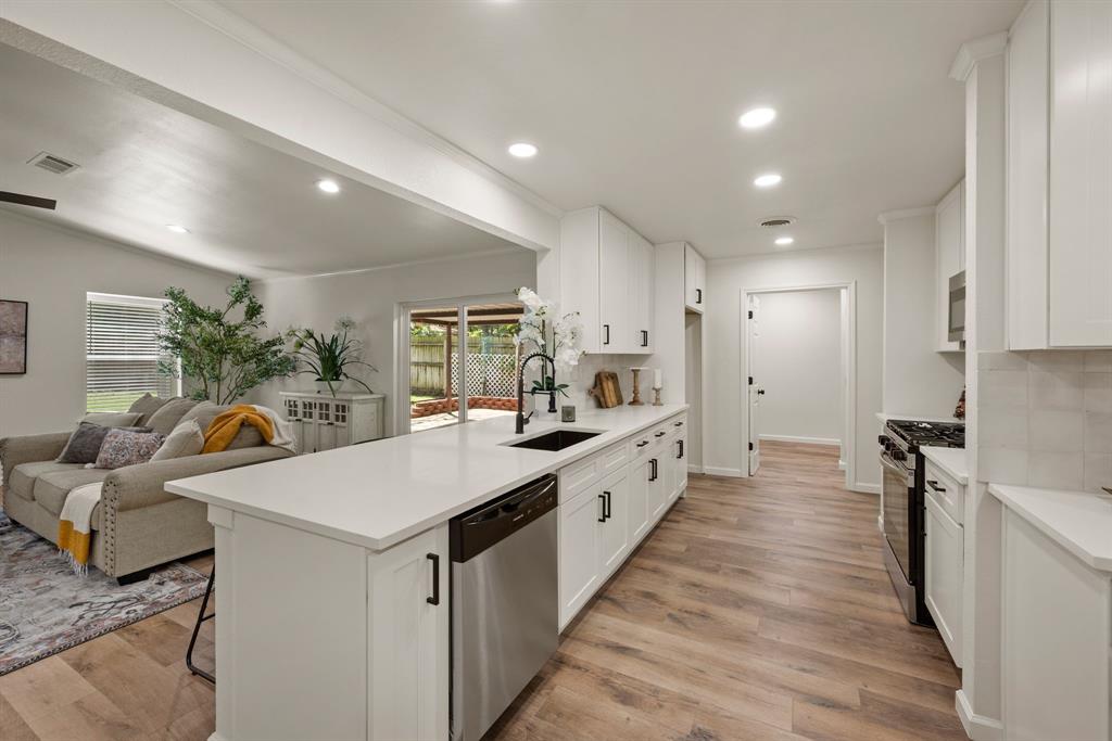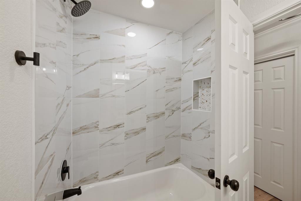 STUNNING fully renovated 3 bedroom 2 bath 1875 square foot home in desirable Bedford neighborhood! Nothing has been left untouched in this open concept home. New HVAC, electric panel, plumbing, windows, insulation, doors, paint inside & out, LVP floors, quartz countertops, crown molding, carpet, matte black fixtures, recessed lighting & much more await you in this one of a kind home. Multiple living & dining areas. Giant kitchen with custom soft close cabinets, quartz countertops, stainless steel appliances, & walk in pantry is perfect for any chef. Primary living area that is open to the kitchen containing vaulted ceilings with cedar beam, built in cabinetry, fireplace, recessed lighting on bluetooth dimmers, is great for entertaining. This property features 2 spacious guest bedrooms along with fully renovated guest bathroom. Large primary bedroom containing fully renovated magazine quality ensuite bathroom with walk in shower is perfect after a long day. Outside you will find a covered porch, sprinklers, large backyard & additional storage shed. Centrally located within minutes to schools, shopping, parks & major highways. Home is in the award wining HED ISD! Come see YOUR new home today!