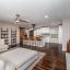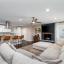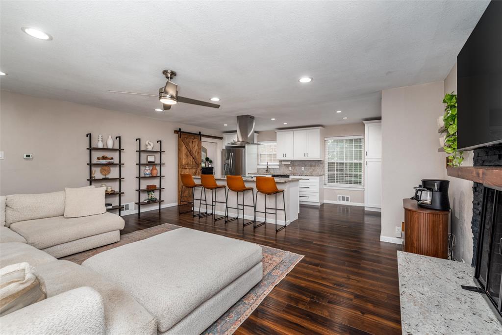 Inside, you’ll find three spacious bedrooms, two full baths, and an abundance of thoughtful upgrades. A light-filled front flex space with bay window welcomes you in, flowing into an elegant dining area anchored by an Edison-style chandelier. The heart of the home is the open-concept living room, featuring a stacked stone fireplace and direct connection to a fully remodeled kitchen complete with a large center island, granite countertops, stainless steel appliances, custom backsplash, and designer barn door.