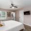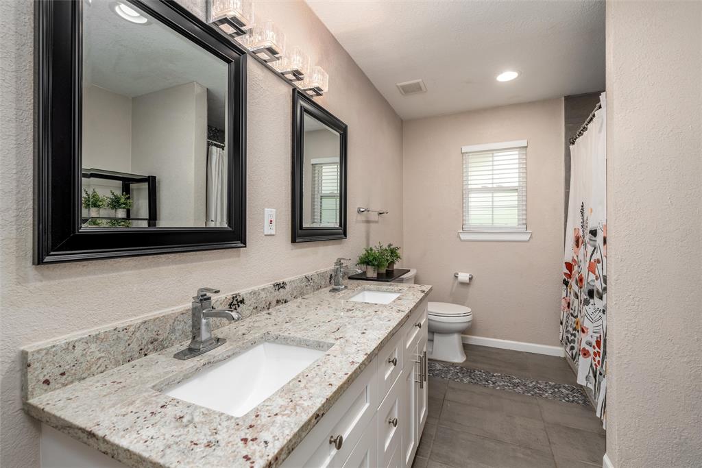 The primary suite is a true retreat with a walk-in closet and updated ensuite bath featuring a frameless glass shower. All three bedrooms offer walk-in closets, and both bathrooms have been stylishly renovated with granite counters, new Kohler toilets, and updated fixtures. Additional highlights include updated windows, electrical panel, wood-look laminate flooring throughout living areas, and a spacious utility room with large pantry.