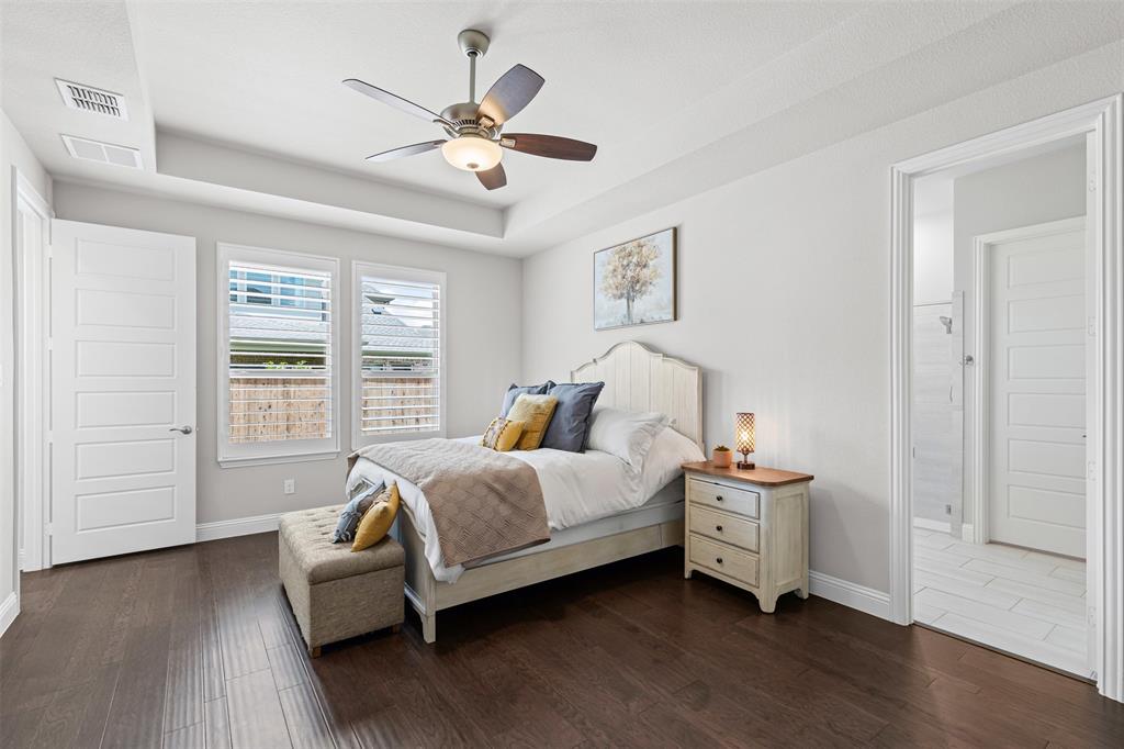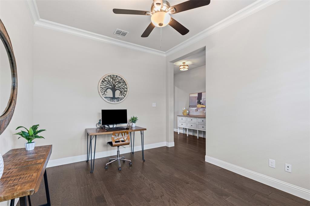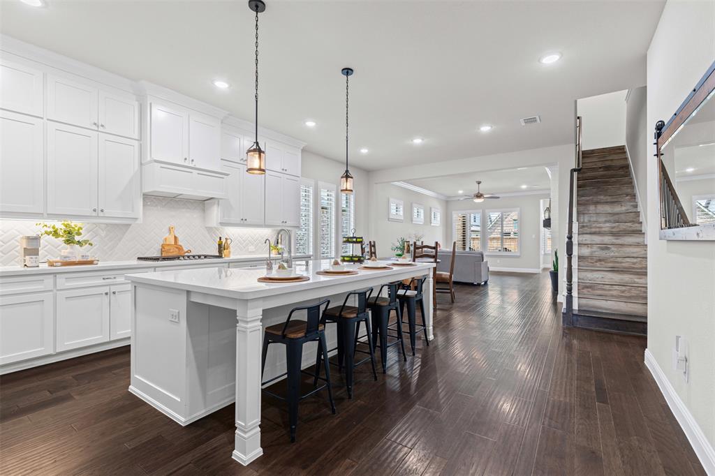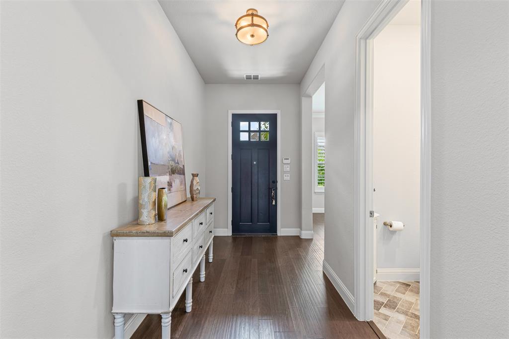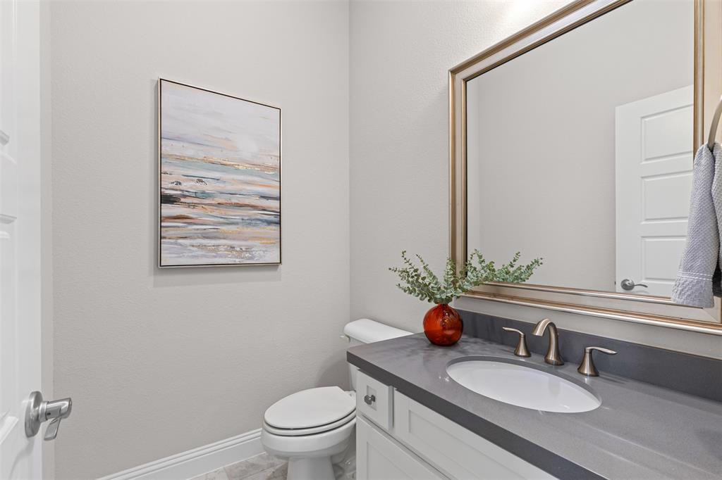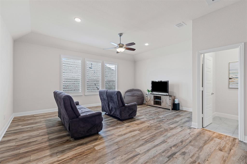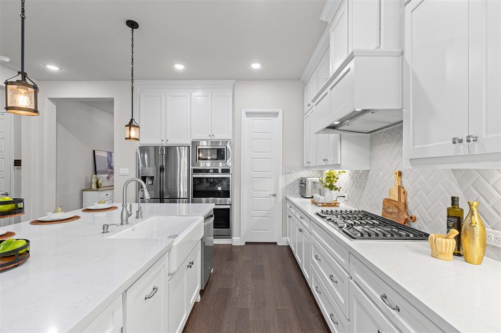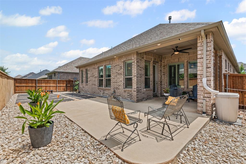 Do you appreciate modern design, low-maintenance living, and clean, uncluttered aesthetics? This Light Farms gem delivers. Step inside this thoughtfully designed one-and-a-half story home featuring timeless style and exceptional functionality. The kitchen shines with crisp white cabinetry, quartz countertops, a gas cooktop, double ovens, an oversized island with pendant lighting, and a porcelain farm sink. Luxury vinyl plank flooring runs throughout the home—completely carpet-free for a sleek, easy-to-maintain finish. The spacious primary suite offers a true retreat with a spa-like ensuite bath that includes an oversized shower, garden tub, dual sinks, vanity, and walk-in closet. A dedicated home office provides a quiet space for focus or remote work. Upstairs, enjoy a large game room with a half bath—perfect for movie nights, playtime, or entertaining guests. The full-size 3-car garage features durable epoxy flooring and extra storage space. Additional enhancement includes a whole-home water filtration system. Out back, the xeriscaped yard boasts rock landscaping, stepping stones, and a peaceful sitting area. HOA-included lawn care means more free time to relax. A gated section of the yard is ideal for a raised vegetable garden or could easily serve as a dog run for your furry family members. Zoned to top-rated Prosper ISD schools, including Boyer Elementary, and located in the amenity-rich community of Light Farms, offering over 240 acres of green space, 25 miles of trails, an 11-acre lake and sandy beach, tennis and pickleball courts, dog parks, fitness center, playgrounds, The Nook restaurant, and year-round community events. This home offers the rare combination of clean design, practical luxury, and a vibrant lifestyle. Come see it today!