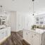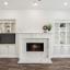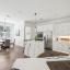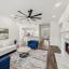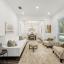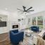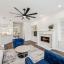 The kitchen flows seamlessly into the main living area, where a modern fireplace, custom built-ins, and oversized windows create a bright and inviting space with tranquil views of the backyard.