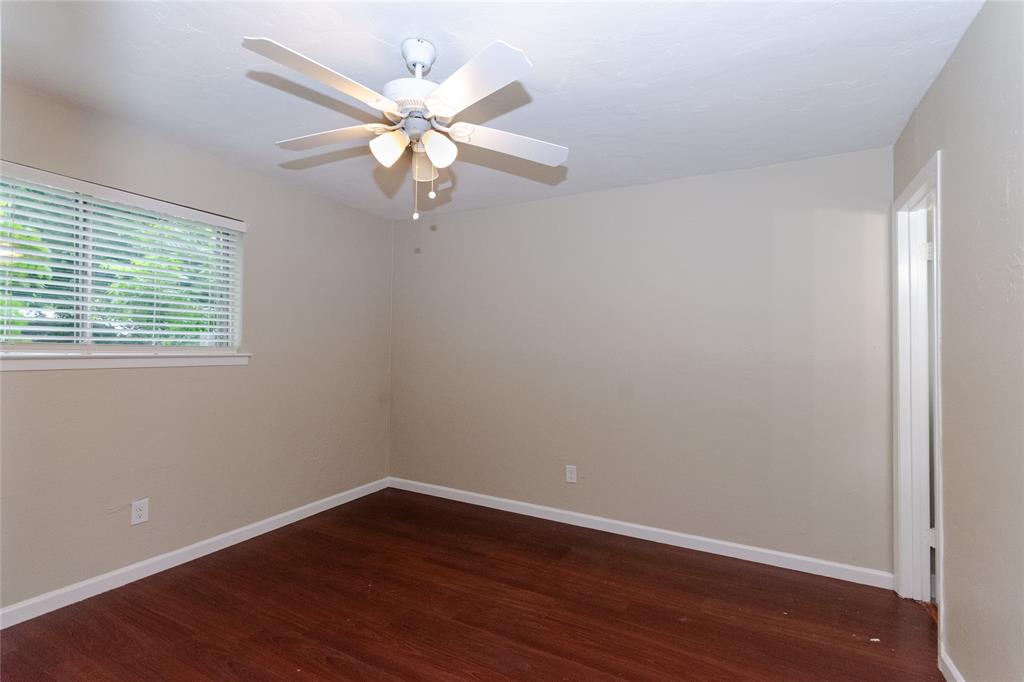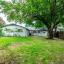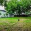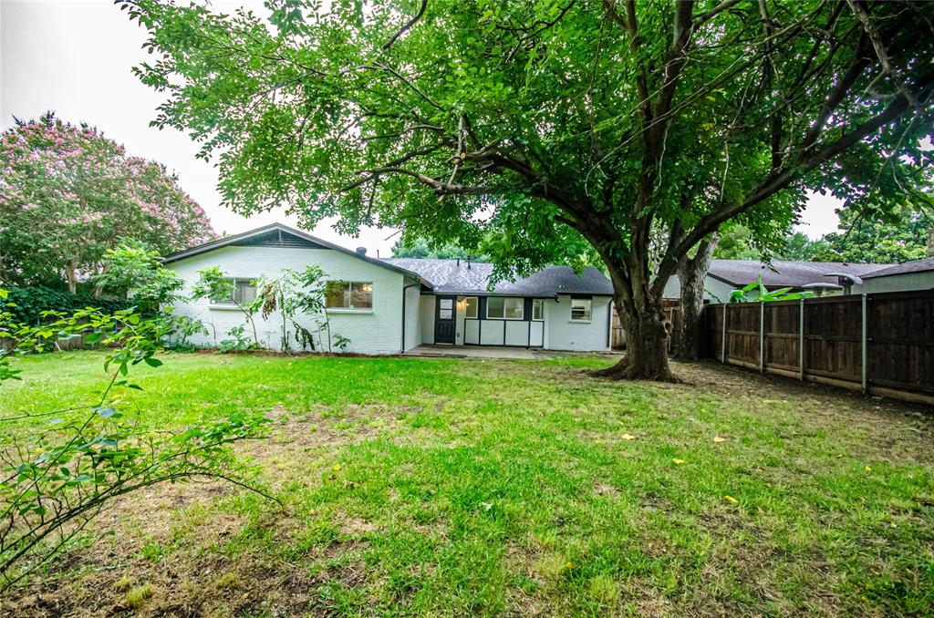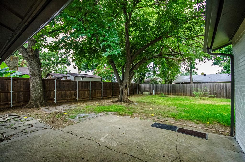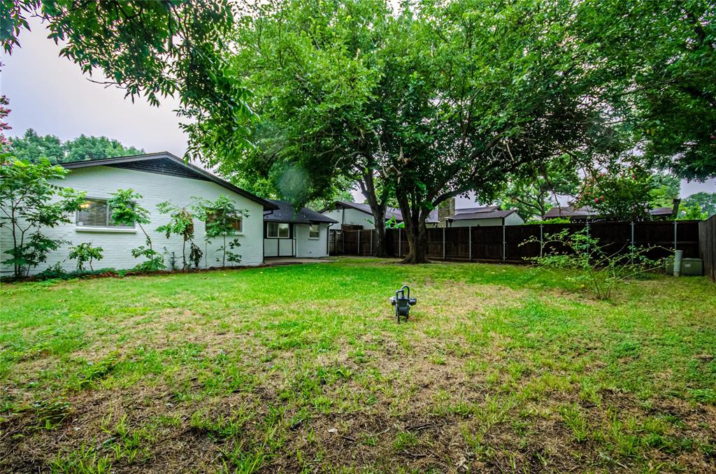 Spacious backyard with mature trees.