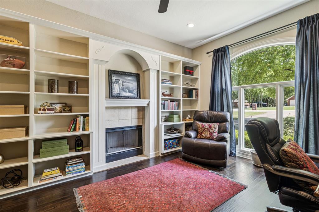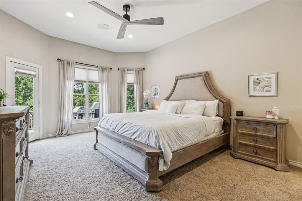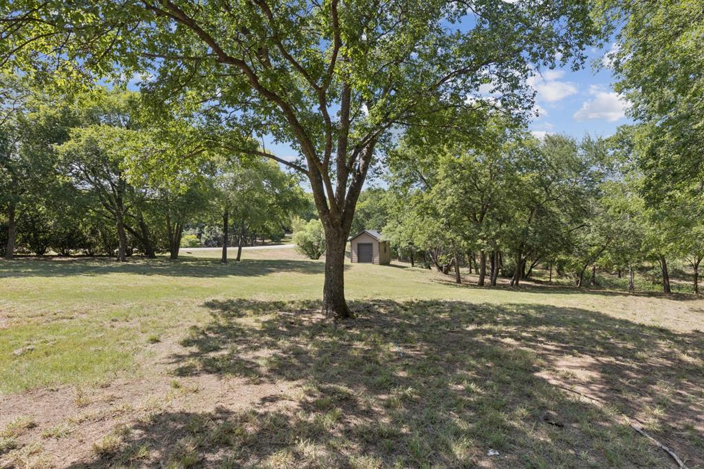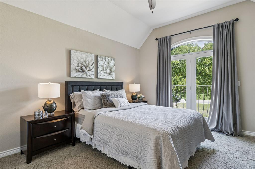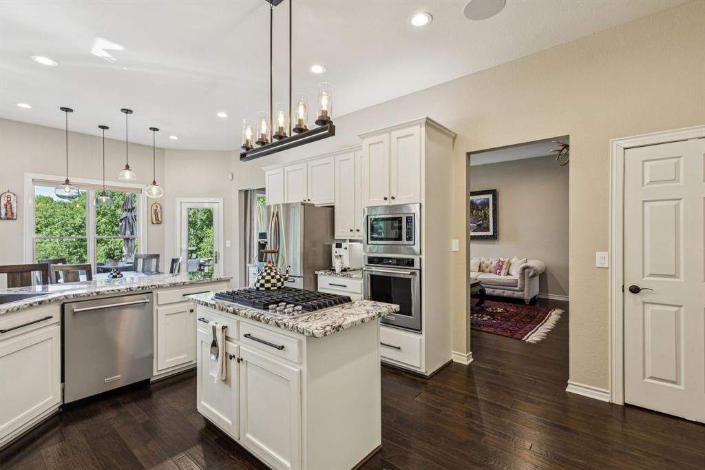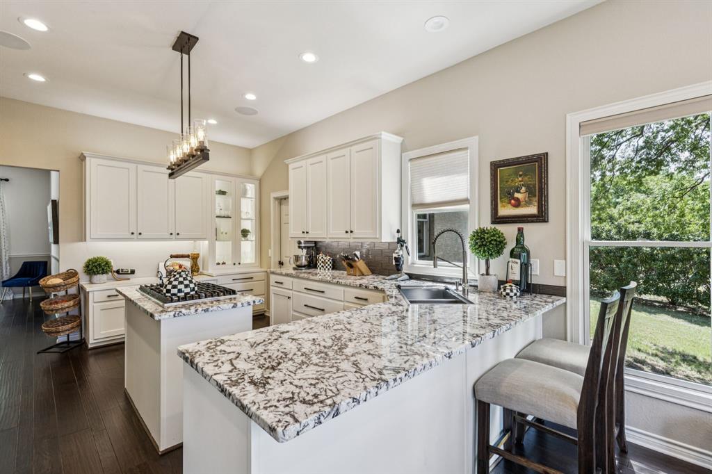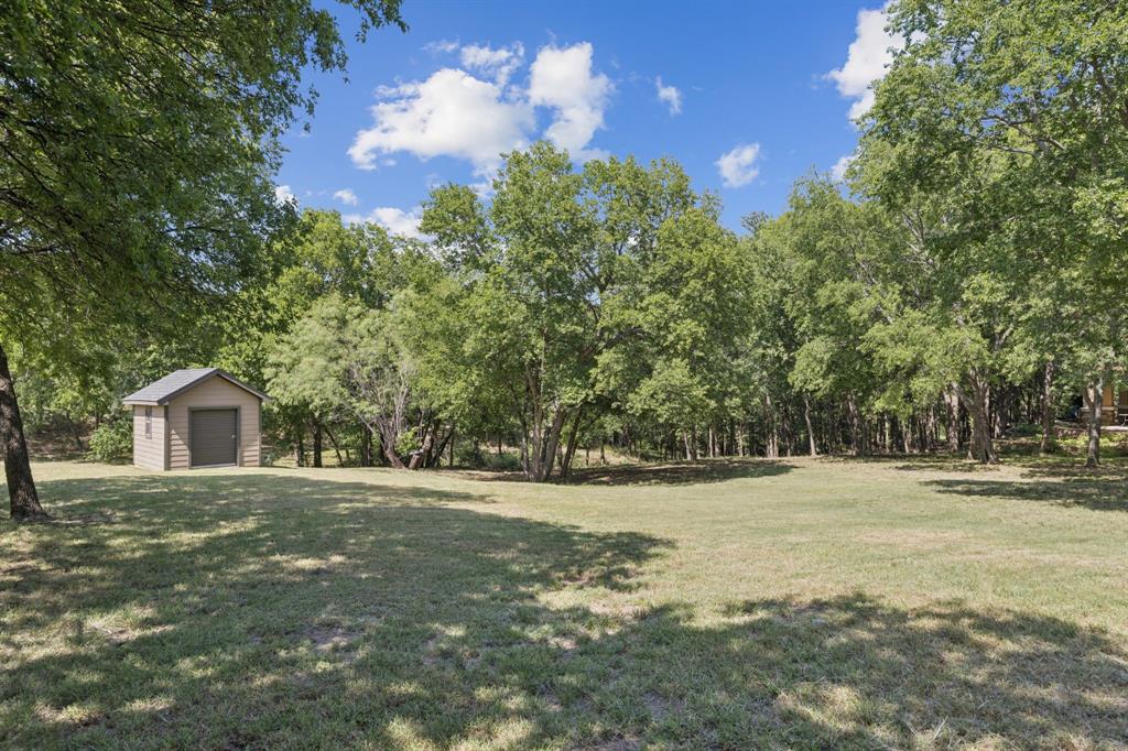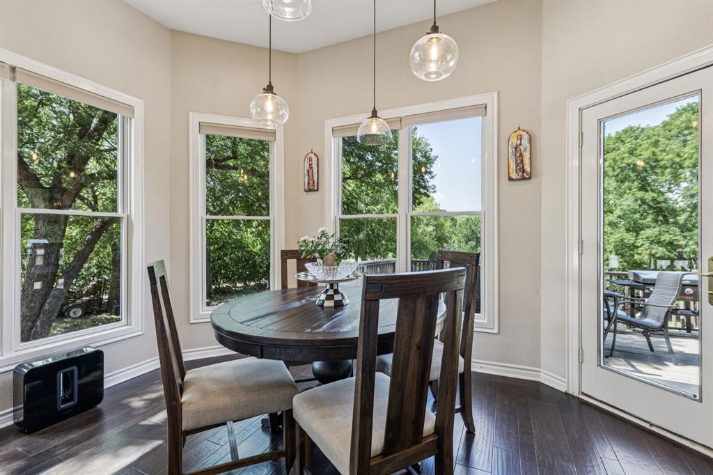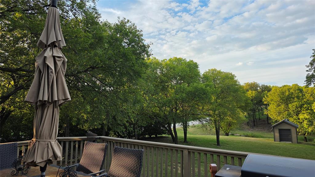 Brilliantly remodeled 4-bedroom, 3.5-bathroom sitting on a scenic 1-acre lot just down the cul-de-sac from Lewisville Lake! Upon arrival, the circle driveway, textured stucco facade, and spacious front porch make a lasting first impression. Rich, dark engineered hardwood floors greet you as you enter, and they run throughout the home's common areas. With numerous welcoming living areas, you'll have more than enough room to host friends and family. The private office, with a wood-burning fireplace and an abundance of built-in shelving, is an ideal space to work from home or focus on your favorite hobbies. The remodeled eat-in kitchen is outfitted with sleek granite countertops, shaker cabinets, a gas range, stainless steel appliances, and updated fixtures. A section of custom glass-front cabinets with built-in lighting adds character to the space. The bay window of the breakfast room floods the space with natural light. Escape to the private primary suite with a remodeled ensuite bathroom highlighted by a standalone tub, massive frameless walk-in tile shower, dual quartz vanities, and dual walk-in closets. Secondary full bathrooms have been updated with similar high-end finishes. Rich wood stairs with stylish, dark treads lead to a flexible living space upstairs, perfect for a game room or playroom. The sink installed in the utility room makes doing laundry more convenient and efficient! Take in the expansive lot from the elevated vantage point of the back deck. The detached storage shed features roll-up doors and electricity. Enjoy the peace of mind that comes with purchasing a home where foundation work was completed this summer, plus a Class IV roof installed in 2024! Keep energy bills down year-round with the help of double-hung Pella windows throughout the home. The entire home is pre-wired for audio, and the whole home generator will ensure you're never without electricity, even in the face of severe weather.