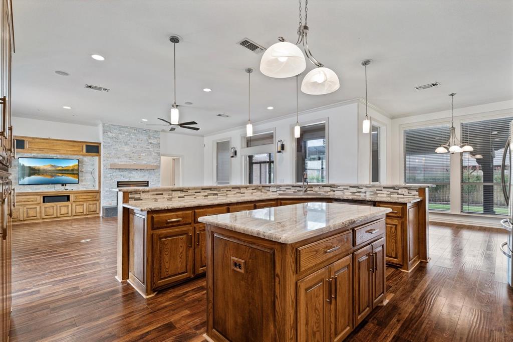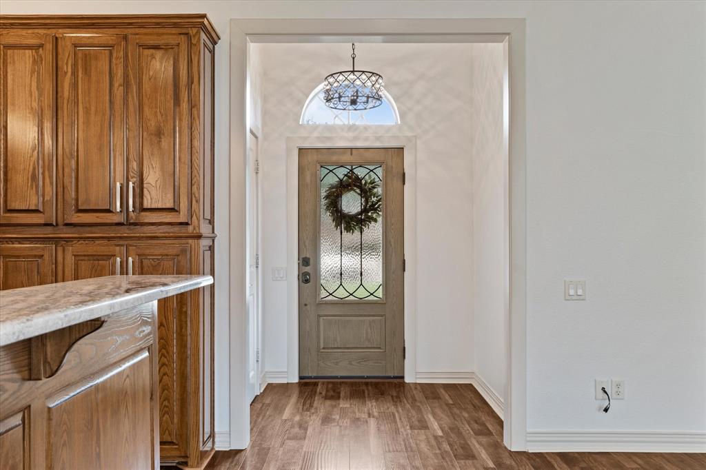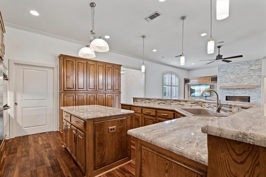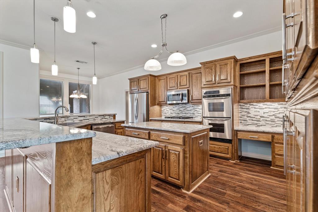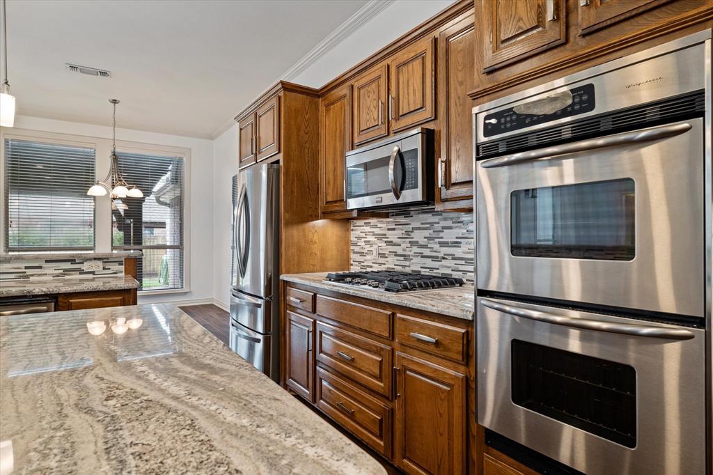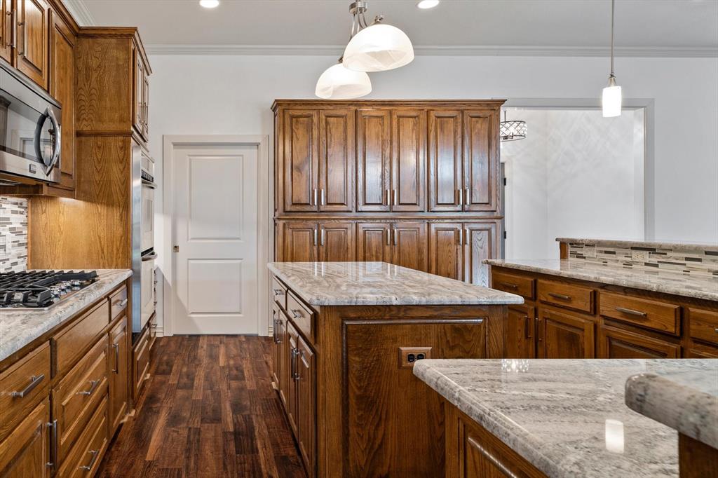 The large gourmet kitchen is a standout, featuring a center island, gas cooktop, double ovens, new countertops and backsplash, & brand-new pendant lighting. The spacious laundry-mud room off the garage includes a new utility sink, a full wall of cabinetry, & space for an extra fridge or freezer—with an additional water line already in place.