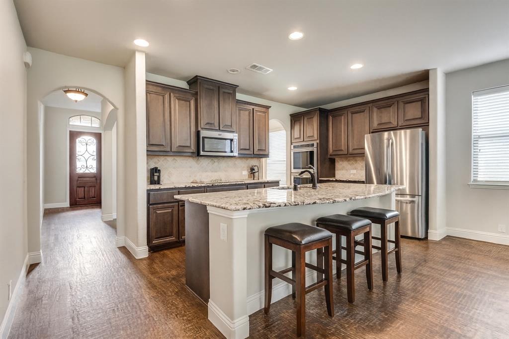 Step inside to find an inviting open floor plan with handscraped hardwood floors that flow through the entry, kitchen, café, and living areas. The gourmet kitchen is a chef’s dream, featuring 42-inch cabinets, granite countertops, a walk-in pantry, and double oven with built-in cooktop — ideal for everyday meals or entertaining guests.