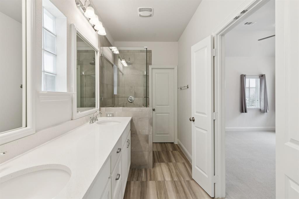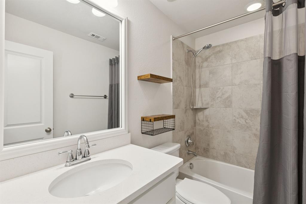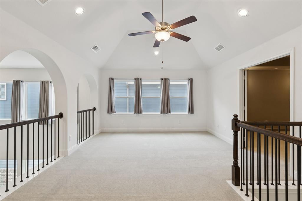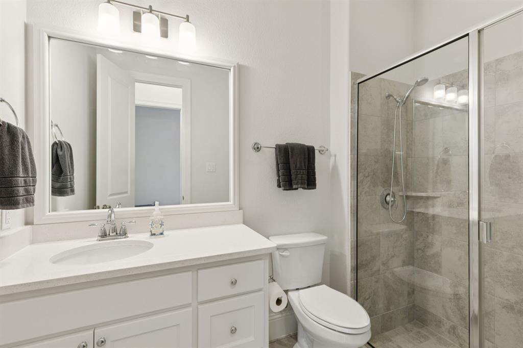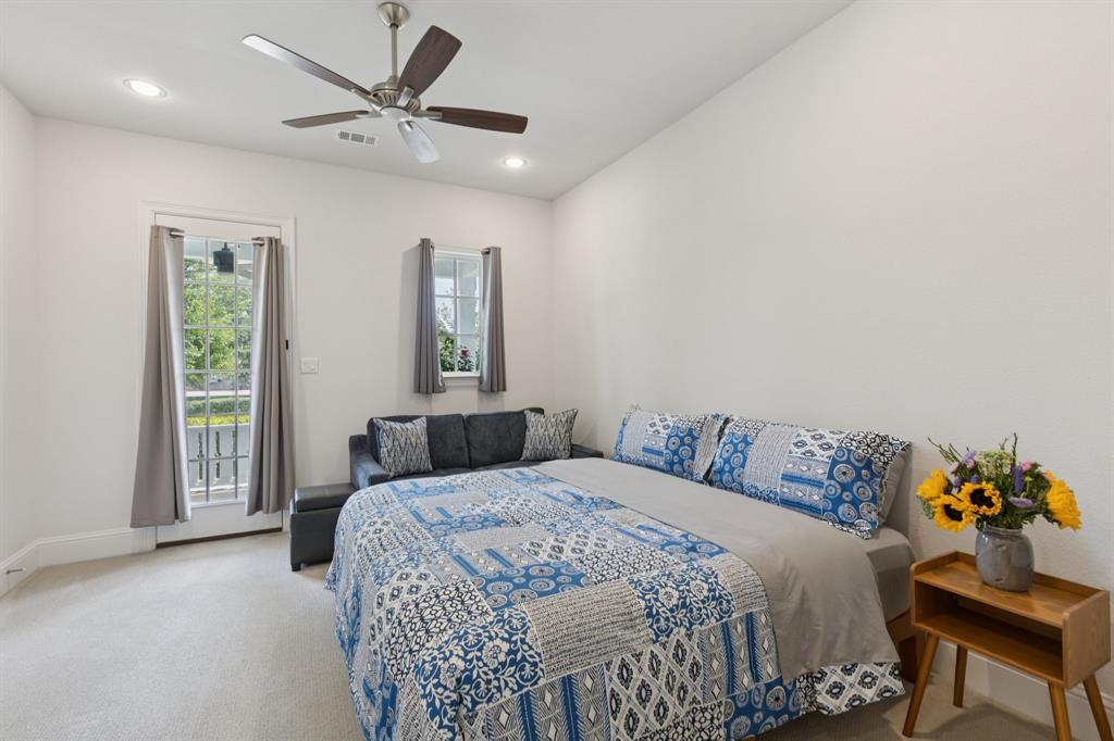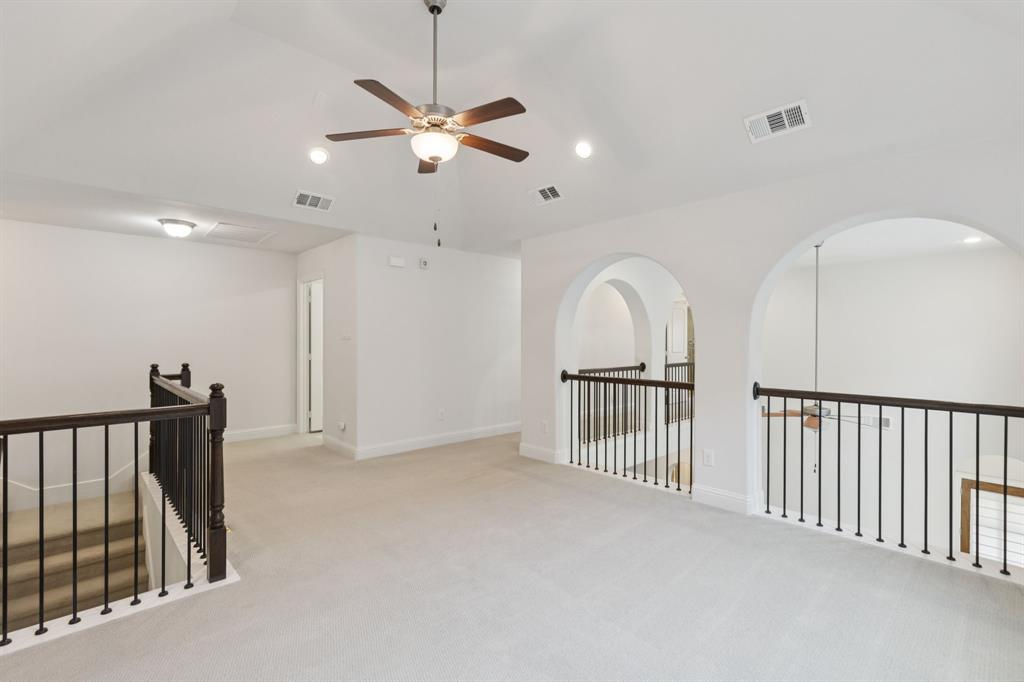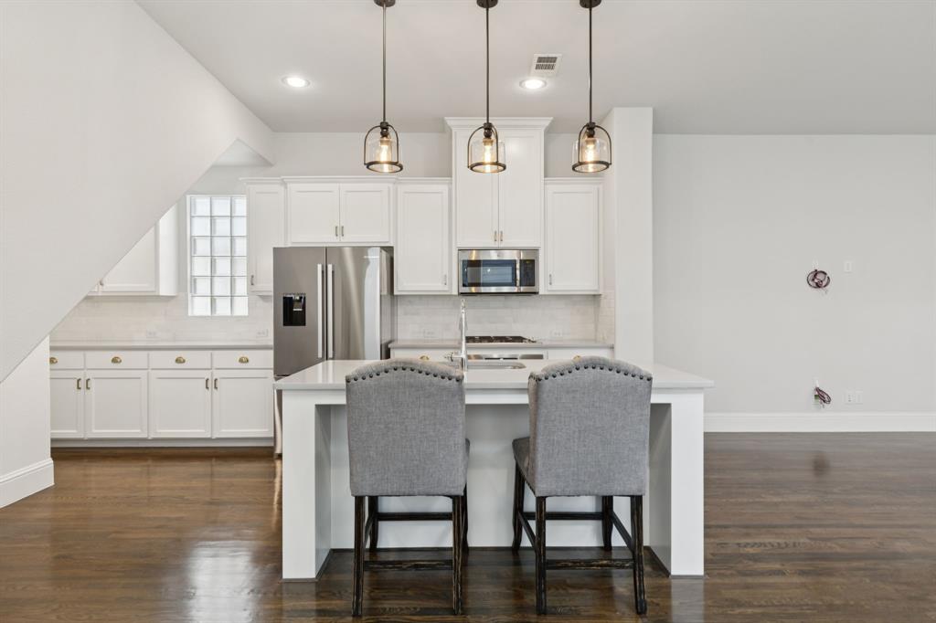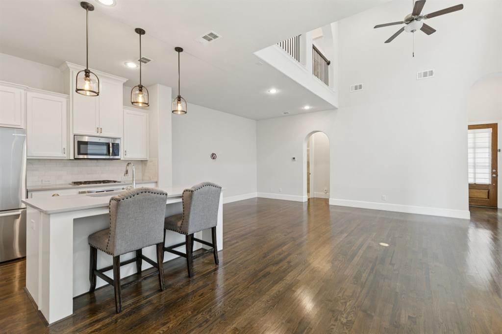 The pride of ownership shows in this beautifully maintained home, offering the perfect blend of comfort, convenience, and a low-maintenance lifestyle. Located just steps away from everything Old Town Coppell has to offer, you’ll enjoy a vibrant community featuring George’s Coffee Shop, the local Farmers Market, Coppell Arts Center, salons, and other businesses — all within WALKING distance. Inside, this inviting home boasts designer colors, rich wood flooring, and a thoughtful open floor plan designed for both comfort and entertaining. The main level includes a private guest bedroom and a full bath—perfect for visitors or a home office. The large living room features soaring ceilings, abundant natural light, and a chef’s kitchen with stylish quartz countertops, a gas cooktop, an abundance of cabinetry and a breakfast bar. Upstairs, retreat to a spacious primary suite, an additional secondary bedroom and a full bath, complemented by a versatile game room and media room — a rare find in this area! Step outside to your private patio, complete with a built-in gas hookup for grilling and low-maintenance turf, so you can enjoy green space without the upkeep. Say goodbye to yard work — the HOA maintains the front lawn and trims the shrubs, giving you more time to relax and enjoy your home. Relax on your charming front porch or take advantage of the home’s easy access to major highways and shopping. With DFW Airport just a short drive away, travel is a breeze. Move-in ready and waiting for you to call this gem home! Refrigerator, washer, and dryer remain.