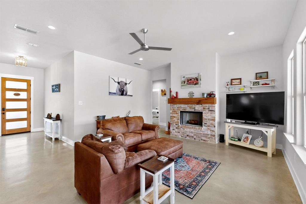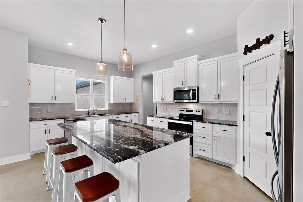 Upon entering, you’ll be captivated by the tall ceilings and open-concept layout, perfect for both family living and entertaining. The front room can be used as a beautiful dining area or large office space. The kitchen is a dream, complete with a generous island, abundant countertop space, and modern finishes that flow seamlessly into the living area. A brick fireplace adds warmth and charm to the living room, creating a cozy ambiance year-round.