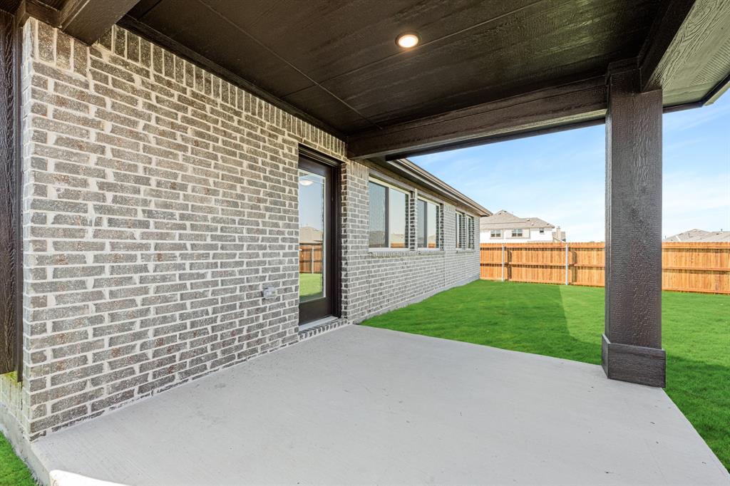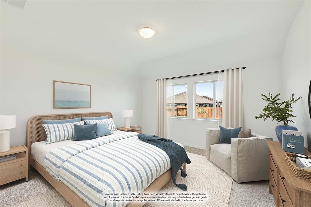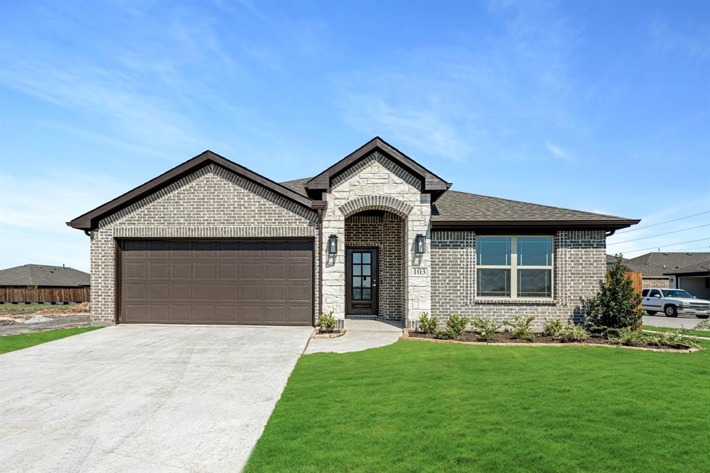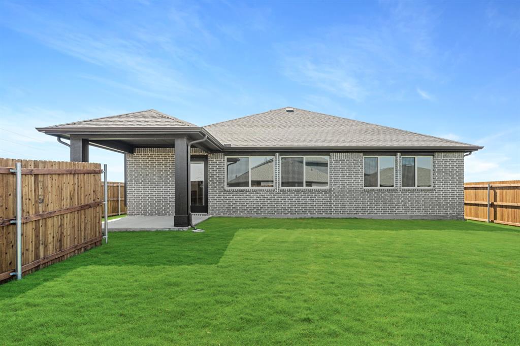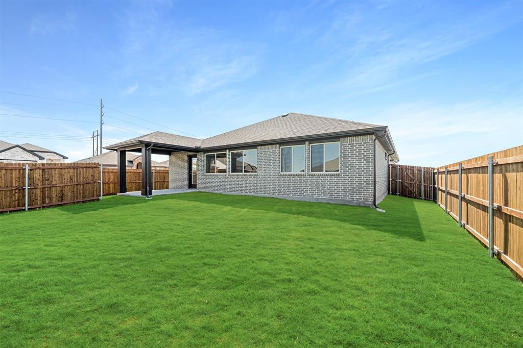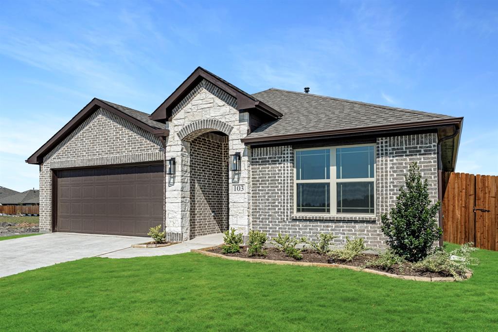 *Free Fridge AND Blinds PLUS $10K towards closing costs regardless of lender! MUST CLOSE BY SEPTEMBER 30th!* NEW! NEVER LIVED IN. Step into the effortlessly stylish Laurel plan by Bloomfield Homes—an inviting single-story layout offering 3 spacious bedrooms, 2 full bathrooms, and a bright open-concept living area designed for modern lifestyles. From the moment you arrive, the brick and stone façade, iron and glass front door, and manicured lawn set a polished tone. Inside, you'll find 12x24 porcelain wood-look tile flooring that flows seamlessly through the main areas, balancing durability with upscale charm. The kitchen is the heart of this home—featuring granite countertops, sleek subway tile backsplash, stainless steel appliances, and a generous center island with bar seating. Light-tone shaker-style cabinetry and under-cabinet lighting add warmth. The open layout connects the kitchen to the dining and living spaces, creating an expansive feel ideal for hosting or relaxing. Tech-savvy touches include pre-mounted flat-screen wiring in both the living area and primary suite, ensuring clutter-free wall displays. The primary suite is tucked away for privacy, a peaceful retreat with views of the backyard. The ensuite bath boasts upgraded tilework, a soaking tub, separate shower, and a massive walk-in closet with convenient access to the laundry room. Secondary bedrooms are thoughtfully placed at the front of the home, creating a true split-bedroom design perfect for guests or a home office setup. Enjoy shaded evenings on the covered back patio and benefit from the corner lot placement, offering extra yard space and enhanced curb presence. The home also includes full gutters, smart layout planning, and energy-efficient features throughout. Located in the master-planned Grand Heritage community, this home blends style, practicality, and community amenities for a complete lifestyle package.
