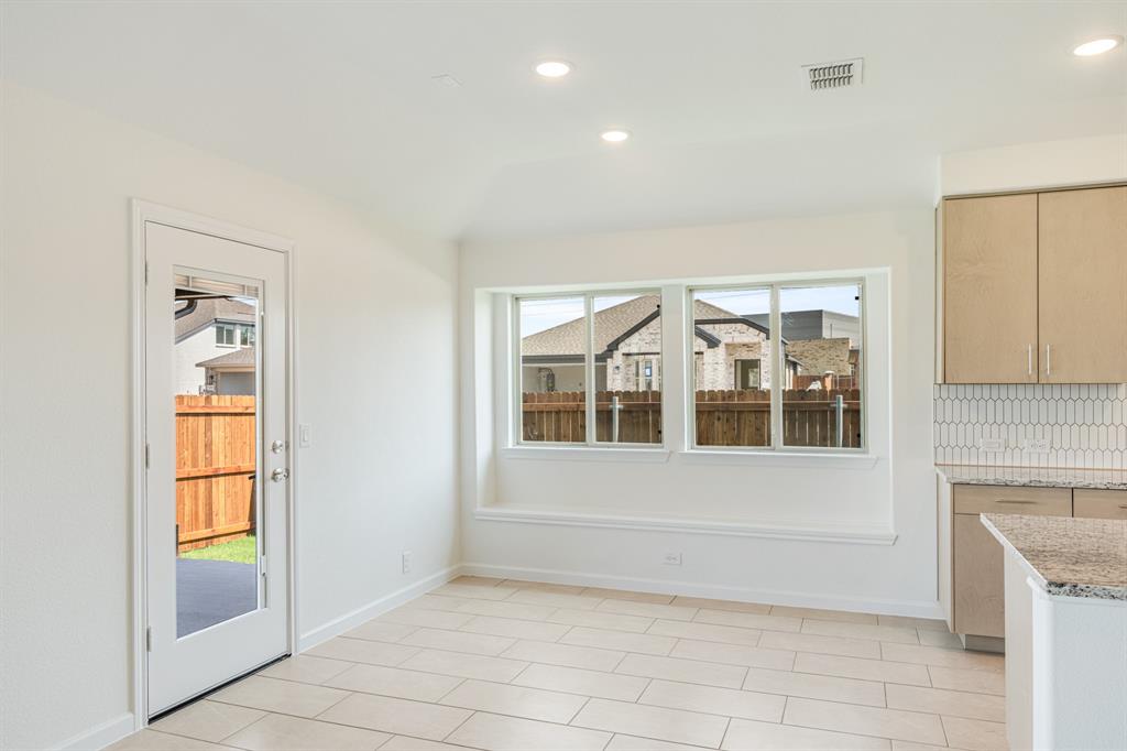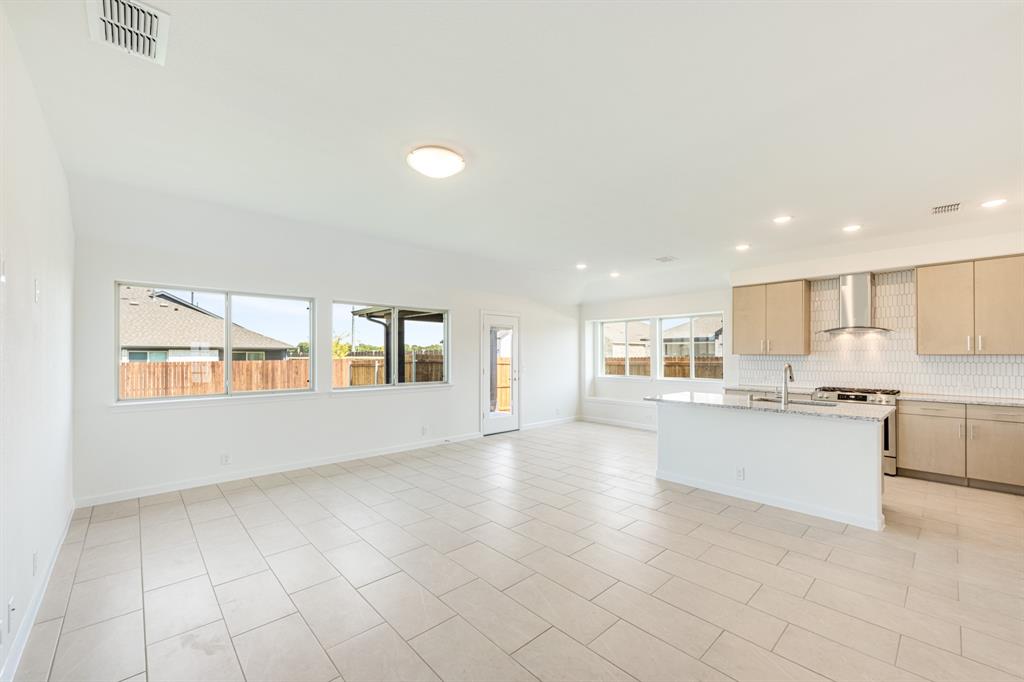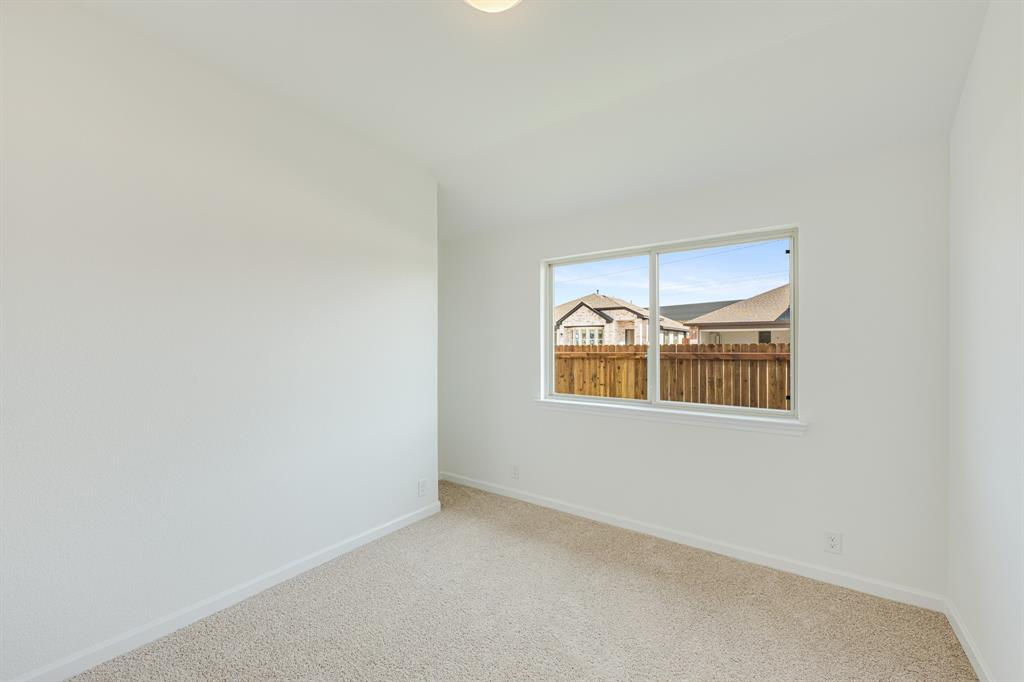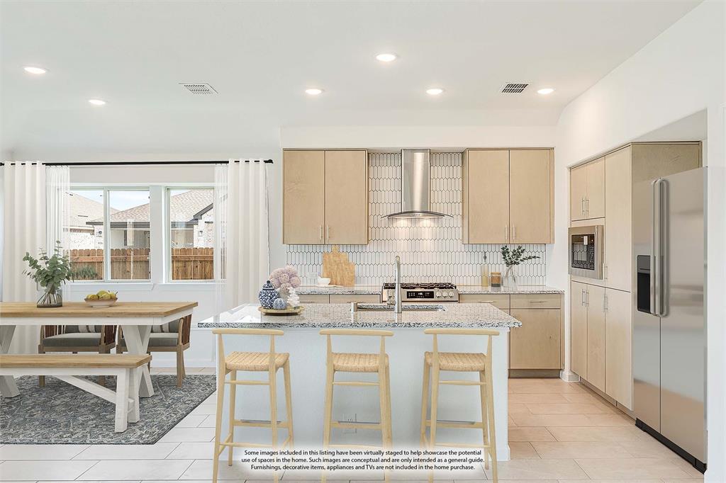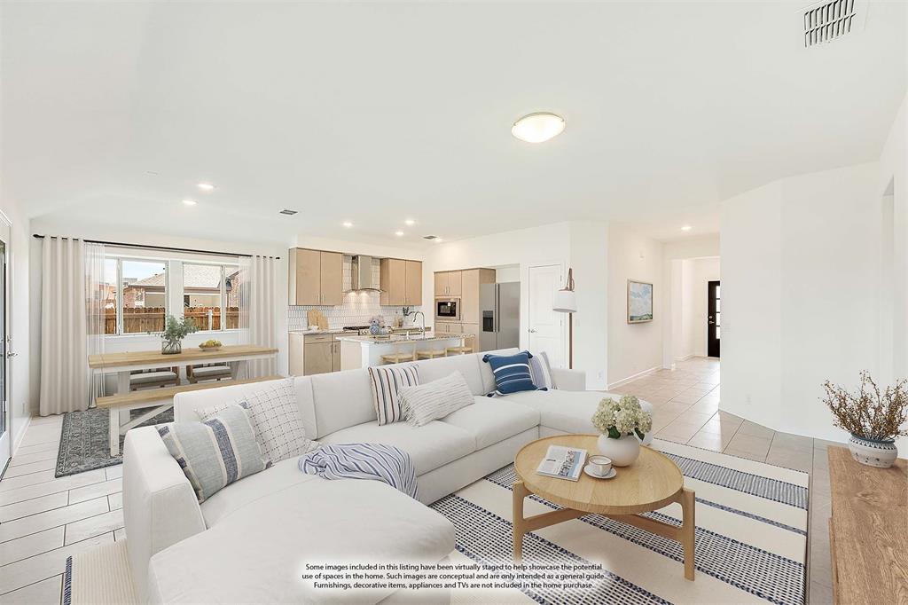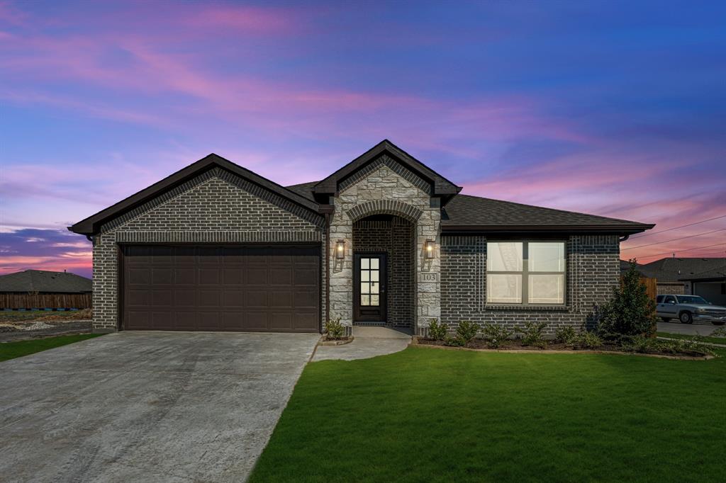 *Free Fridge AND Blinds PLUS $10K towards closing costs regardless of lender! MUST CLOSE BY SEPTEMBER 30th!* NEW! NEVER LIVED IN. Step into the effortlessly stylish Laurel plan by Bloomfield Homes—an inviting single-story layout offering 3 spacious bedrooms, 2 full bathrooms, and a bright open-concept living area designed for modern lifestyles. From the moment you arrive, the brick and stone façade, iron and glass front door, and manicured lawn set a polished tone. Inside, you'll find 12x24 porcelain wood-look tile flooring that flows seamlessly through the main areas, balancing durability with upscale charm. The kitchen is the heart of this home—featuring granite countertops, sleek subway tile backsplash, stainless steel appliances, and a generous center island with bar seating. Light-tone shaker-style cabinetry and under-cabinet lighting add warmth. The open layout connects the kitchen to the dining and living spaces, creating an expansive feel ideal for hosting or relaxing. Tech-savvy touches include pre-mounted flat-screen wiring in both the living area and primary suite, ensuring clutter-free wall displays. The primary suite is tucked away for privacy, a peaceful retreat with views of the backyard. The ensuite bath boasts upgraded tilework, a soaking tub, separate shower, and a massive walk-in closet with convenient access to the laundry room. Secondary bedrooms are thoughtfully placed at the front of the home, creating a true split-bedroom design perfect for guests or a home office setup. Enjoy shaded evenings on the covered back patio and benefit from the corner lot placement, offering extra yard space and enhanced curb presence. The home also includes full gutters, smart layout planning, and energy-efficient features throughout. Located in the master-planned Grand Heritage community, this home blends style, practicality, and community amenities for a complete lifestyle package.