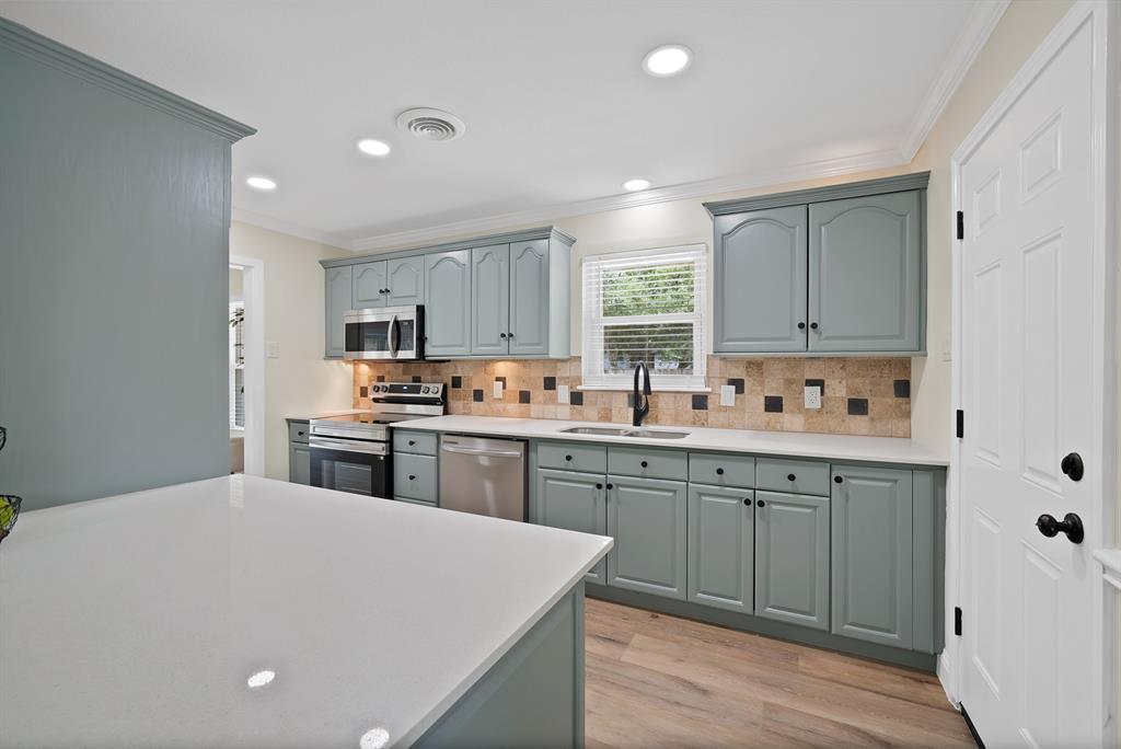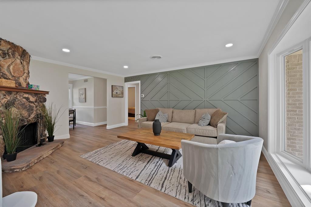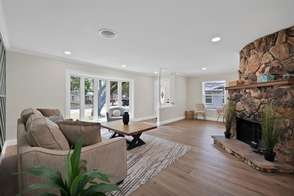 Step inside to an open-concept living space showcasing an impressive stone fireplace, custom architectural wall accent, flowing into a fully renovated kitchen with granite counters, custom tile backsplash, oversized white quartz island, abundant cabinetry, and brand-new stainless steel appliances package including a smooth-top range, built-in microwave, and dishwasher. Updates abound throughout the home: new luxury vinyl plank flooring, fresh paint, new baseboards and trim, energy-efficient triple-pane windows, ceiling fans, upgraded insulation, and a brand-new composition roof.