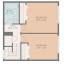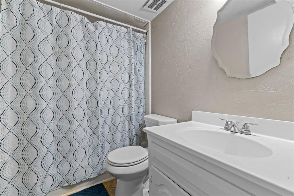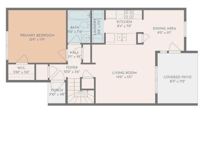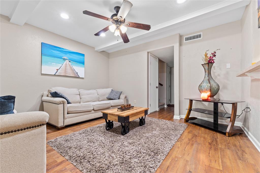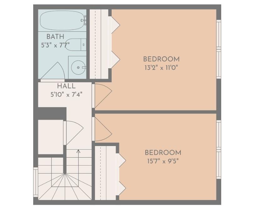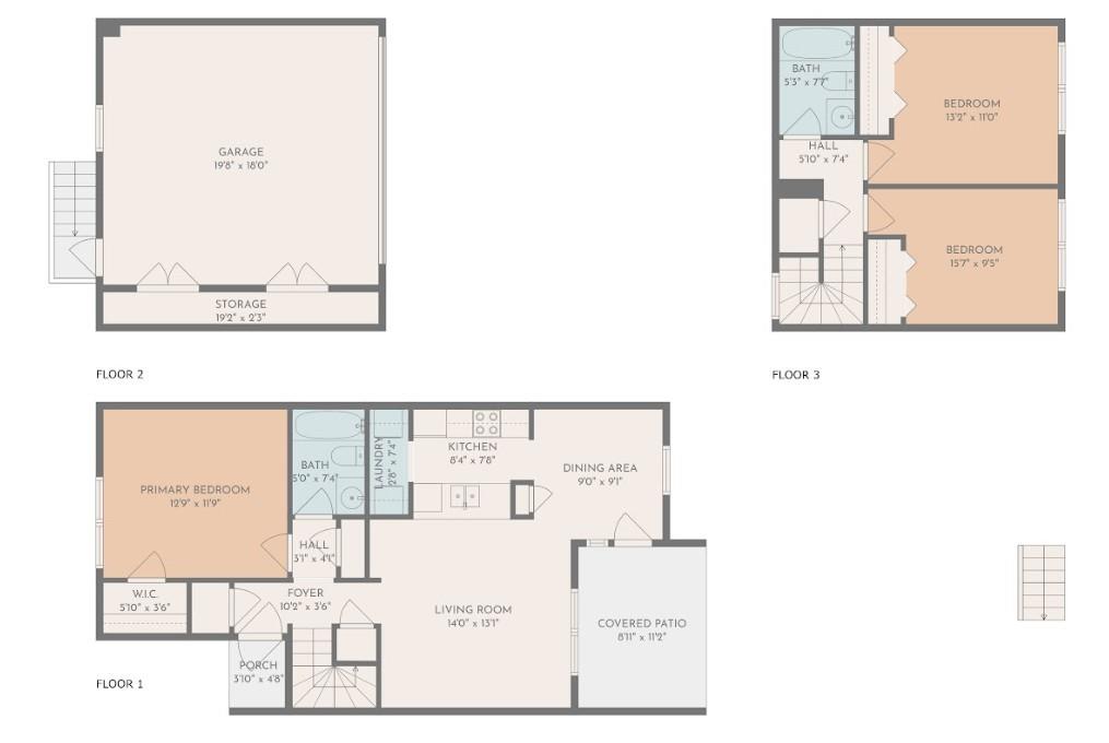 This three-bedroom townhouse has a convenient layout, featuring one bedroom and a full bathroom on the first floor. The second floor includes two additional bedrooms and another full bathroom.